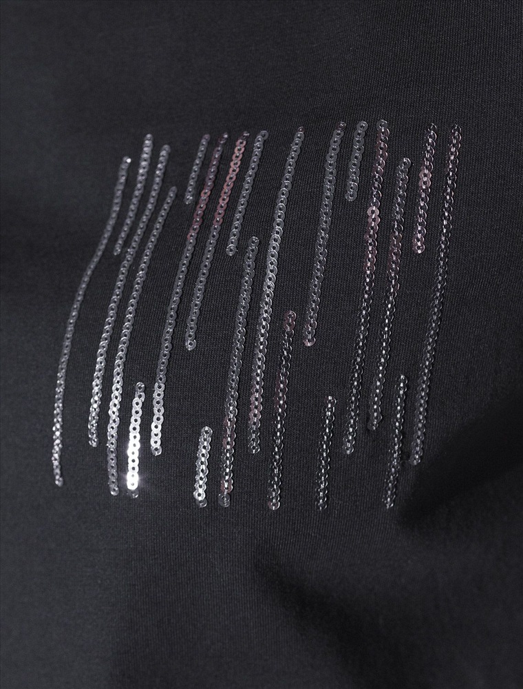 Плотность: 150 Г/м2 Футболка черного цвета идеально подходит для вечеринки и создания яркого образа. Оригинальный принт из серебристых пайеток придает изделию шикарный вид, который привлечет внимание на любом мероприятии. Модель с круглым вырезом и классическим коротким рукавом обеспечивает свободу движений и комфорт в носке. Такой фасон изделия подходит на большие размеры, гармонично сидит на фигуре и помогает создать легкий акцент на достоинствах. Аккуратный круглый вырез красиво подчеркивает шею и делает образ элегантным, сохраняя актуальность для разных случаев — от рабочих встреч до вечерних прогулок и праздничных мероприятий. Модель изготовлена из премиального хлопка с добавлением эластана. Добавление эластана в состав изделия способствует формоустойчивости. Эта нарядная футболка подходит для создания образа на каждый день и идеально подойдет на выход. Модель не мнется, что делает ее практичным вариантом для активных женщин, которые ценят стиль и удобство. Женская футболка подчеркнет вашу индивидуальность и позволит вам выглядеть привлекательно в любой ситуации. Легкость в уходе и высокая износостойкость делают ее незаменимой вещью в вашем гардеробе. Благодаря сочному дизайну и качественной отделке, футболка легко сочетается с различными элементами гардероба, позволяя создавать уникальные комплекты для разных случаев. Она станет ярким акцентом в вашем гардеробе и подарит уверенность на любом событии. Такой вариант одежды станет отличной базой для стильного и эффектного образа на праздничное событие, корпоратив, Новый Год. Комментарии к товару