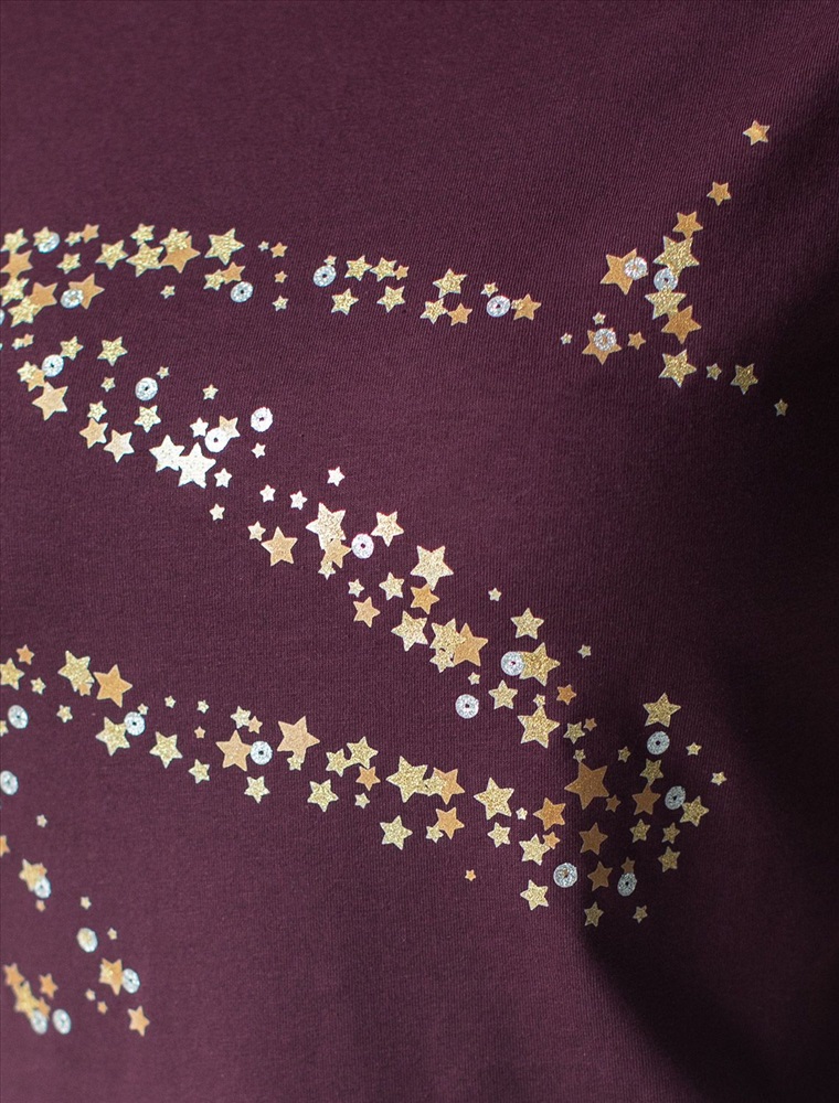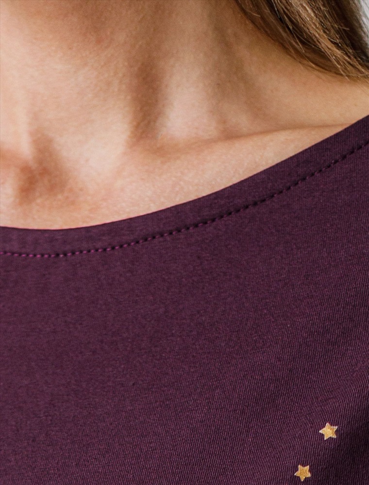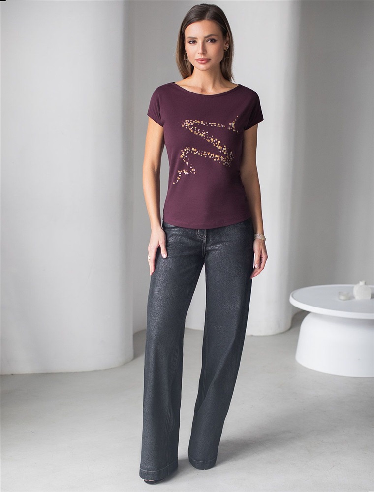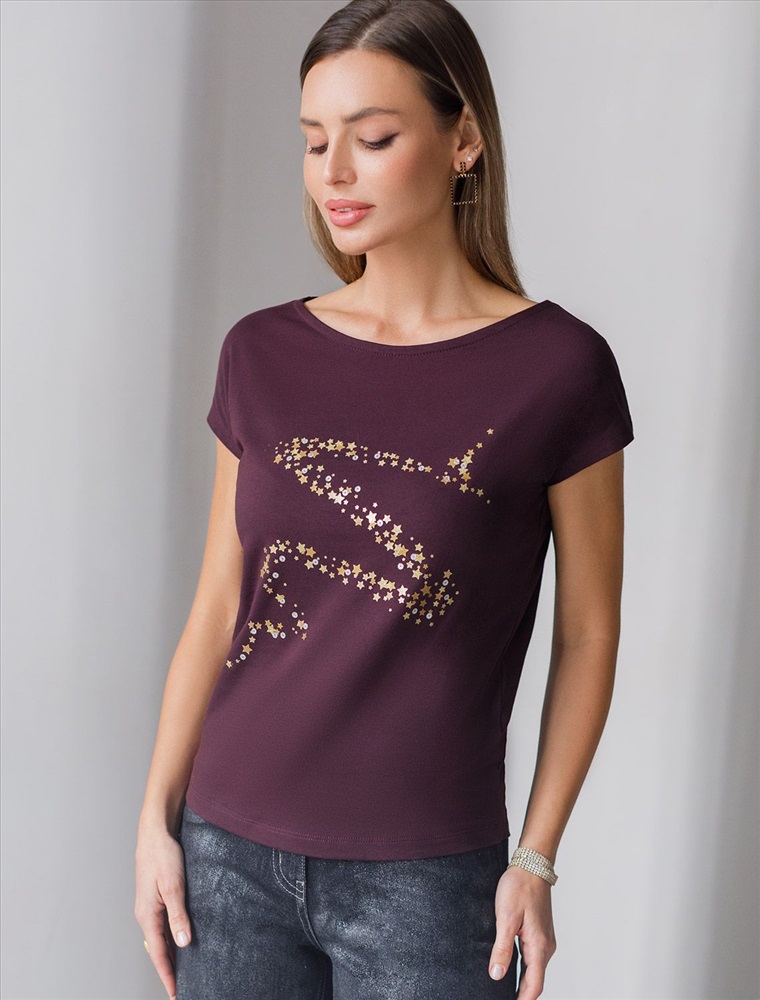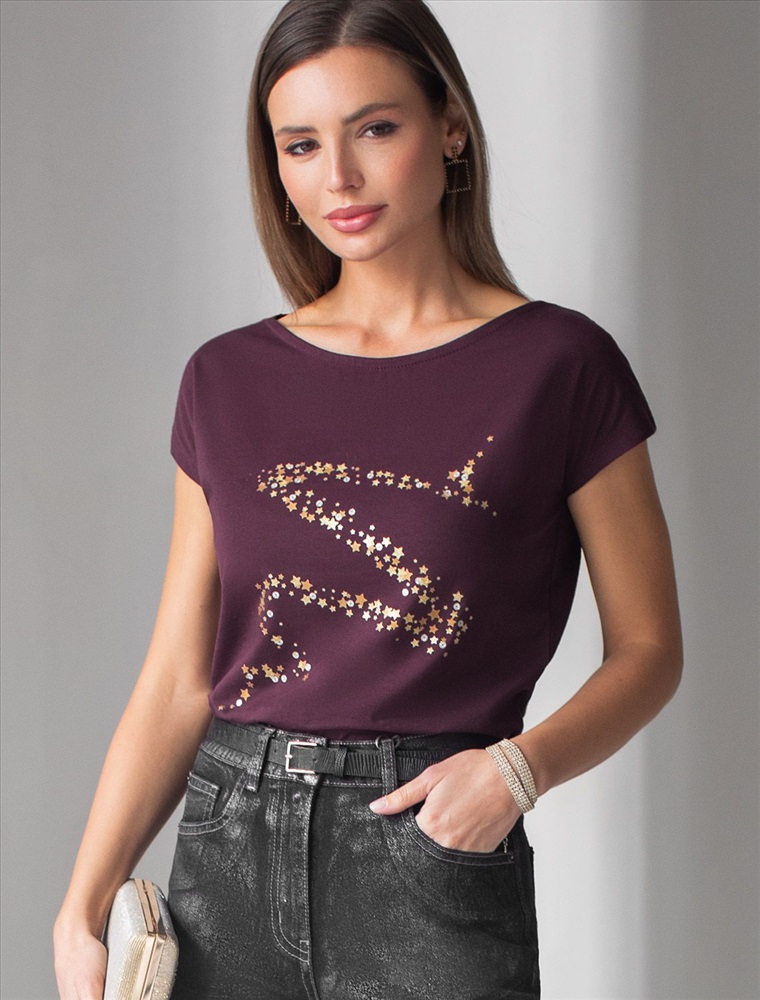 Плотность: 150 Г/м2 Футболка цвета бургунди идеально подходит для вечеринки и создания яркого образа. Оригинальный блестящий принт из устойчивой фольги в виде новогоднего символа змеи золотистого цвета придает изделию шикарный вид, который привлечет внимание на любом мероприятии. Модель с вырезом лодочка и цельнокроеным коротким рукавом обеспечивает свободу движений и комфорт в носке. Такой фасон изделия подходит на большие размеры, гармонично сидит на фигуре и помогает создать легкий акцент на достоинствах. Аккуратный вырез лодочка красиво подчеркивает шею и делает образ элегантным, сохраняя актуальность для разных случаев — от рабочих встреч до вечерних прогулок и праздничных мероприятий. Модель изготовлена из премиального хлопка с добавлением эластана. Добавление эластана в состав изделия способствует формоустойчивости. Эта нарядная футболка подходит для создания образа на каждый день и идеально подойдет на выход. Модель не мнется, что делает ее практичным вариантом для активных женщин, которые ценят стиль и удобство. Женская футболка подчеркнет вашу индивидуальность и позволит вам выглядеть привлекательно в любой ситуации. Легкость в уходе и высокая износостойкость делают ее незаменимой вещью в вашем гардеробе. Благодаря сочному дизайну и качественной отделке, футболка легко сочетается с различными элементами гардероба, позволяя создавать уникальные комплекты для разных случаев. Она станет ярким акцентом в вашем гардеробе и подарит уверенность на любом событии. Такой вариант одежды станет отличной базой для стильного и эффектного образа на праздничное событие, корпоратив, Новый Год. Комментарии к товару