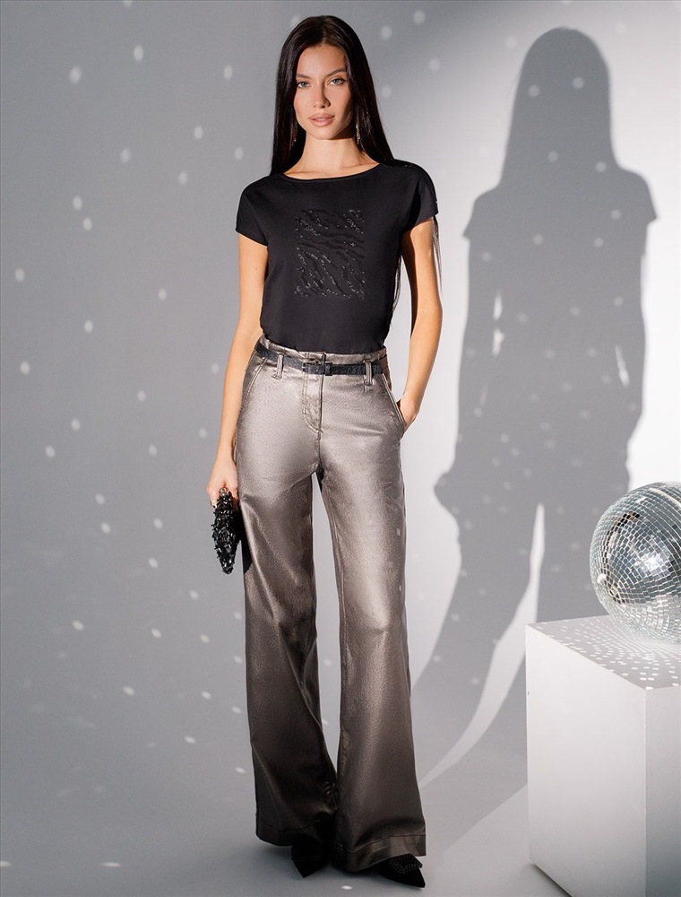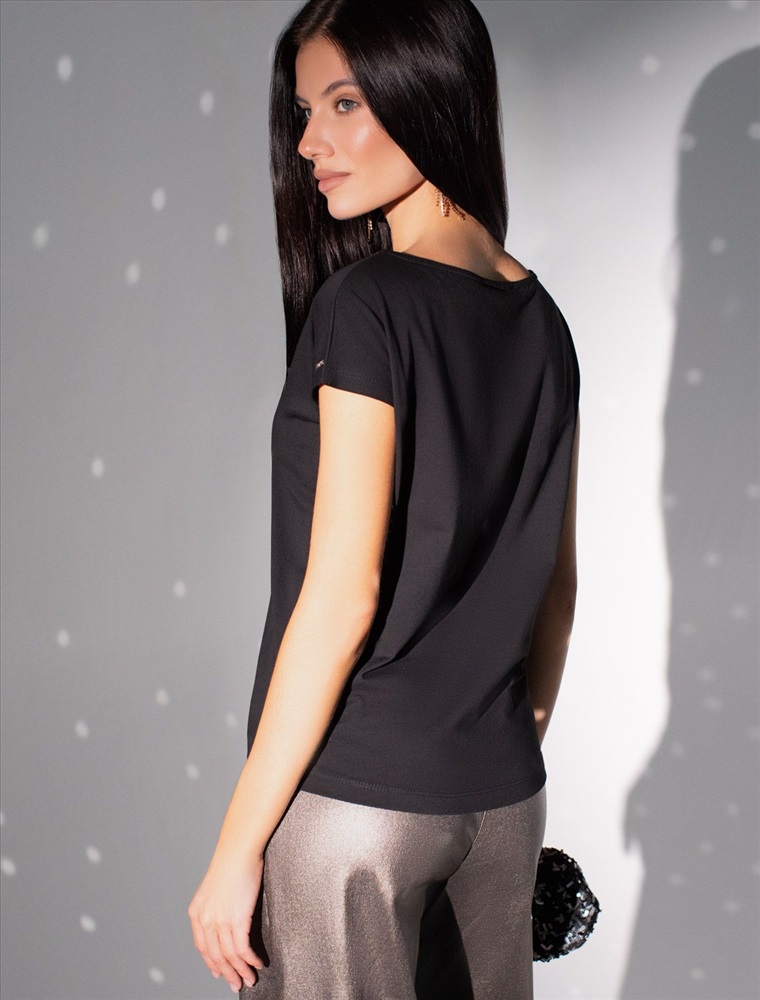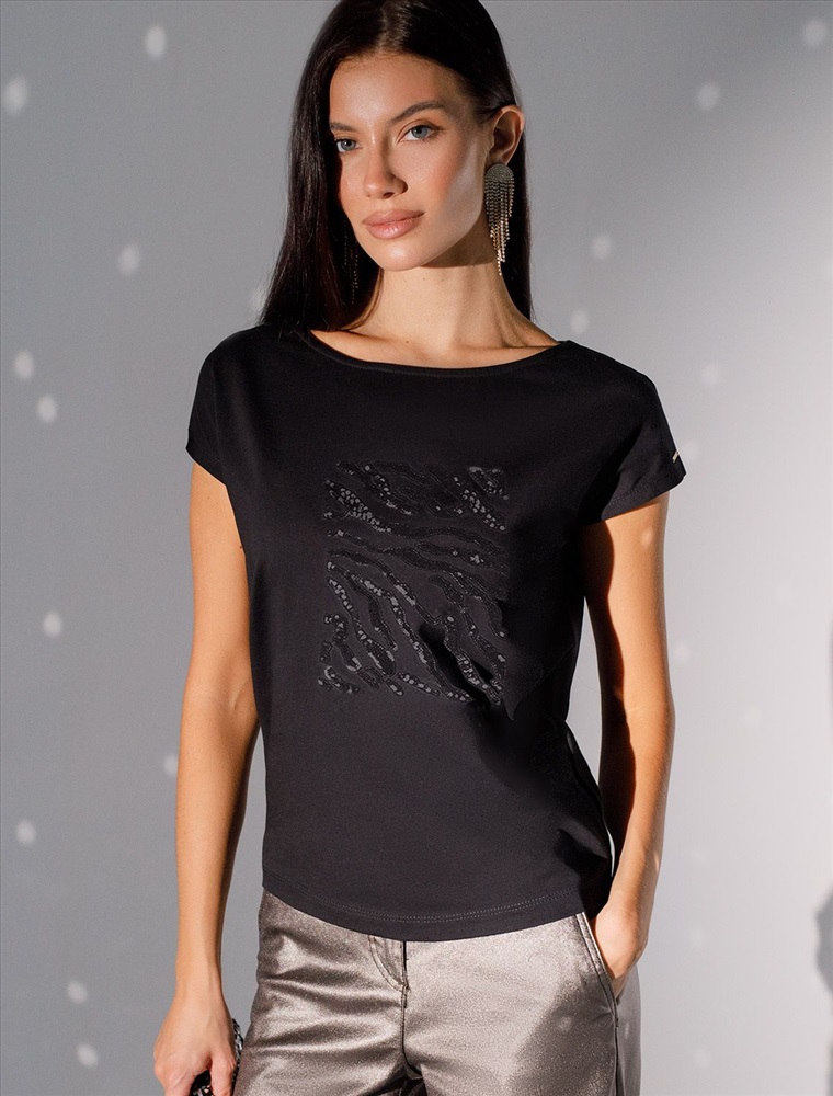 Плотность: 170 Г/м2 Футболка черного цвета идеально подходит для вечеринки и создания яркого образа. Оригинальный блестящий принт из пайеток в виде зебры придает изделию шикарный вид, который привлечет внимание на любом мероприятии. Модель с вырезом лодочка и цельнокроеным коротким рукавом обеспечивает свободу движений и комфорт в носке. Такой фасон изделия подходит на большие размеры, гармонично сидит на фигуре и помогает создать легкий акцент на достоинствах. Аккуратный вырез лодочка красиво подчеркивает шею и делает образ элегантным, сохраняя актуальность для разных случаев — от рабочих встреч до вечерних прогулок и праздничных мероприятий. Модель изготовлена из премиального хлопка с добавлением эластана. Добавление эластана в состав изделия способствует формоустойчивости. Эта нарядная футболка подходит для создания образа на каждый день и идеально подойдет на выход. Модель не мнется, что делает ее практичным вариантом для активных женщин, которые ценят стиль и удобство. Женская футболка подчеркнет вашу индивидуальность и позволит вам выглядеть привлекательно в любой ситуации. Легкость в уходе и высокая износостойкость делают ее незаменимой вещью в вашем гардеробе. Благодаря сочному дизайну и качественной отделке, футболка легко сочетается с различными элементами гардероба, позволяя создавать уникальные комплекты для разных случаев. Она станет ярким акцентом в вашем гардеробе и подарит уверенность на любом событии. Такой вариант одежды станет отличной базой для стильного и эффектного образа на праздничное событие, корпоратив, Новый Год. Комментарии к товару