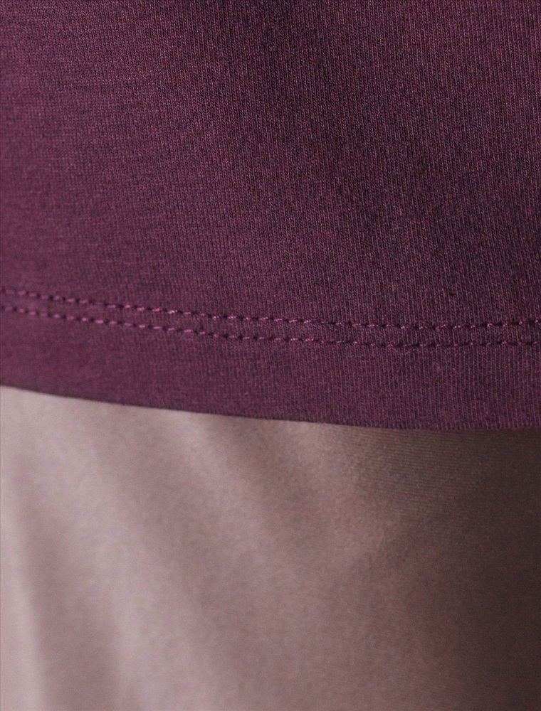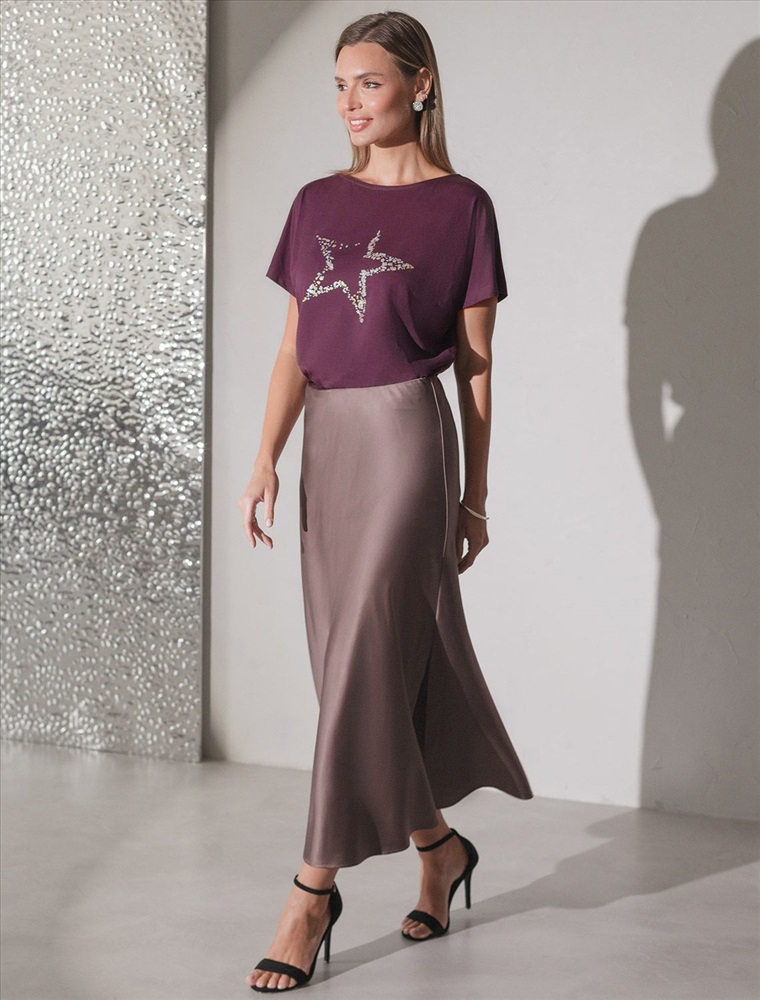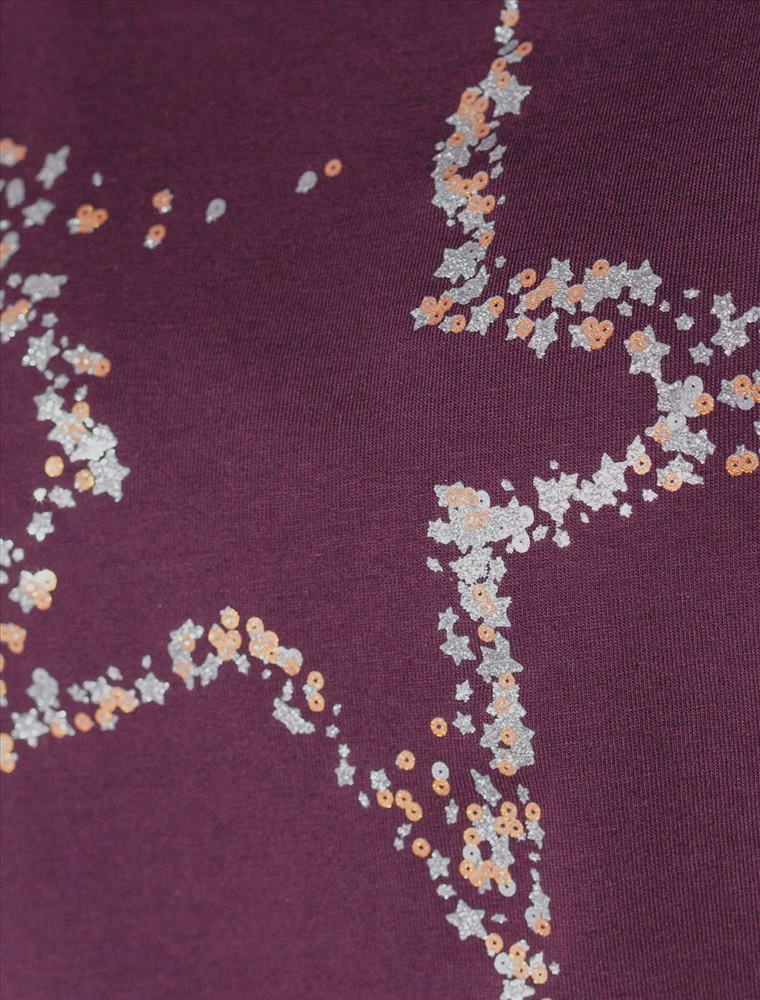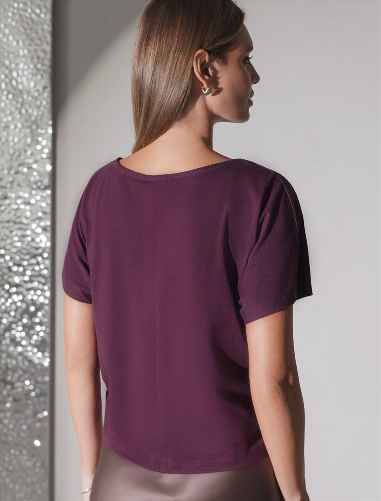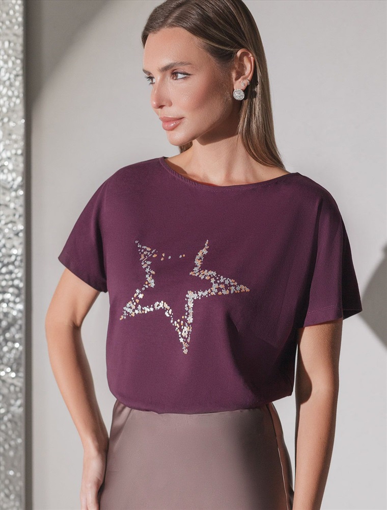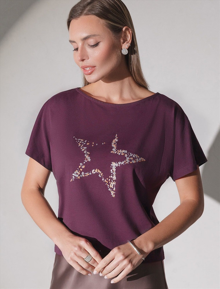 Футболка цвета бургунди идеально подходит для вечеринки и создания яркого образа. Оригинальный принт из фольги в виде звезды придает изделию шикарный вид, который привлечет внимание на любом мероприятии. Модель с вырезом лодочка и цельнокроеным рукавом обеспечивает свободу движений и комфорт в носке. Такой фасон изделия подходит на большие размеры, гармонично сидит на фигуре и помогает создать легкий акцент на достоинствах. Благодаря особенностям кроя с цельнокроеным рукавом удается искусно скроет любые возможные недостатки в области плеч и рук, обеспечивая комфортное прилегание без ощущения скованности. Аккуратный вырез лодочка красиво подчеркивает шею и делает образ элегантным, сохраняя актуальность для разных случаев — от рабочих встреч до вечерних прогулок и праздничных мероприятий.