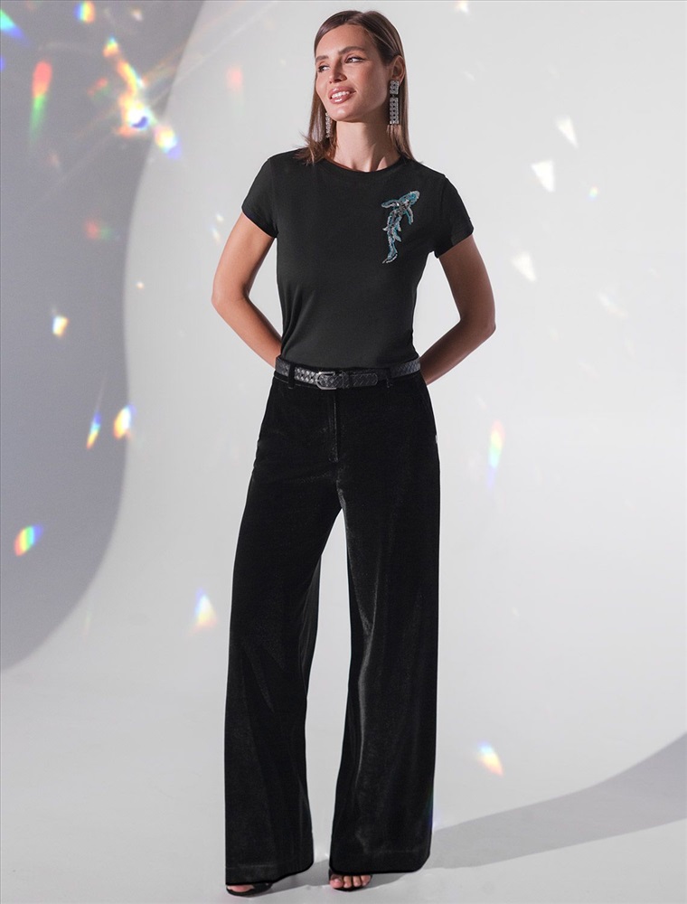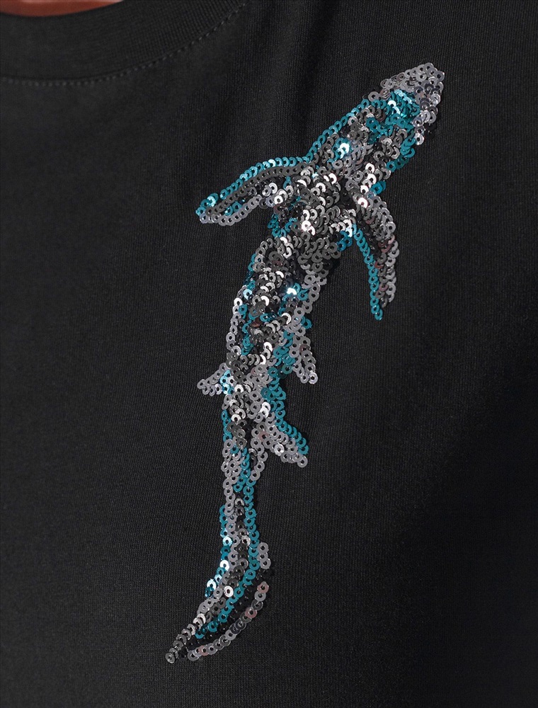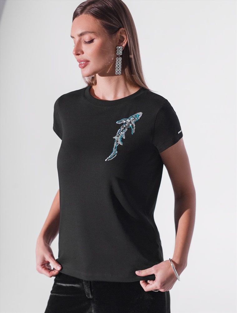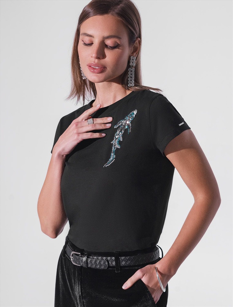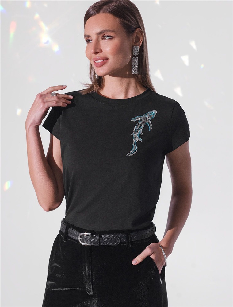 Плотность: 150 Г/м2 Футболка черного цвета идеально подходит для вечеринки и создания яркого образа. Оригинальный принт из серебристых пайеток в виде рыбки придает изделию шикарный вид, который привлечет внимание на любом мероприятии. Модель с круглым вырезом и классическим коротким рукавом обеспечивает свободу движений и комфорт в носке. Такой фасон изделия подходит на большие размеры, гармонично сидит на фигуре и помогает создать легкий акцент на достоинствах. Аккуратный круглый вырез красиво подчеркивает шею и делает образ элегантным, сохраняя актуальность для разных случаев — от рабочих встреч до вечерних прогулок и праздничных мероприятий. Модель изготовлена из премиального хлопка с добавлением эластана. Добавление эластана в состав изделия способствует формоустойчивости. Эта нарядная футболка подходит для создания образа на каждый день и идеально подойдет на выход. Модель не мнется, что делает ее практичным вариантом для активных женщин, которые ценят стиль и удобство. Женская футболка подчеркнет вашу индивидуальность и позволит вам выглядеть привлекательно в любой ситуации. Легкость в уходе и высокая износостойкость делают ее незаменимой вещью в вашем гардеробе. Благодаря сочному дизайну и качественной отделке, футболка легко сочетается с различными элементами гардероба, позволяя создавать уникальные комплекты для разных случаев. Она станет ярким акцентом в вашем гардеробе и подарит уверенность на любом событии. Такой вариант одежды станет отличной базой для стильного и эффектного образа на праздничное событие, корпоратив, Новый Год. Комментарии к товару