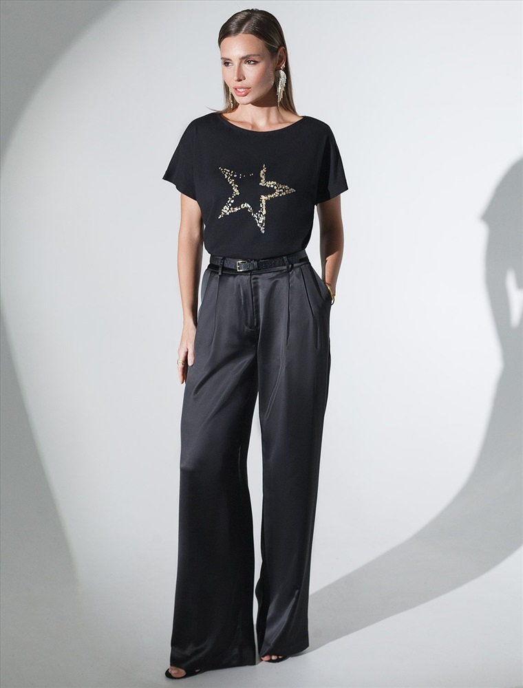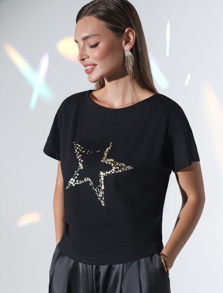 Плотность: 150 Г/м2 Футболка черного цвета идеально подходит для вечеринки и создания яркого образа. Оригинальный блестящий принт из фольги в виде звезды придает изделию шикарный вид, который привлечет внимание на любом мероприятии. Модель с вырезом лодочка и цельнокроеным рукавом обеспечивает свободу движений и комфорт в носке. Такой фасон изделия подходит на большие размеры, гармонично сидит на фигуре и помогает создать легкий акцент на достоинствах. Благодаря особенностям кроя с цельнокроеным рукавом удается искусно скроет любые возможные недостатки в области плеч и рук, обеспечивая комфортное прилегание без ощущения скованности. Аккуратный вырез лодочка красиво подчеркивает шею и делает образ элегантным, сохраняя актуальность для разных случаев — от рабочих встреч до вечерних прогулок и праздничных мероприятий. Модель изготовлена из премиального хлопка с добавлением эластана. Добавление эластана в состав изделия способствует формоустойчивости. Эта нарядная футболка подходит для создания образа на каждый день и идеально подойдет на выход. Модель не мнется, что делает ее практичным вариантом для активных женщин, которые ценят стиль и удобство. Женская футболка подчеркнет вашу индивидуальность и позволит вам выглядеть привлекательно в любой ситуации. Легкость в уходе и высокая износостойкость делают ее незаменимой вещью в вашем гардеробе. Благодаря сочному дизайну и качественной отделке, футболка легко сочетается с различными элементами гардероба, позволяя создавать уникальные комплекты для разных случаев. Она станет ярким акцентом в вашем гардеробе и подарит уверенность на любом событии. Такой вариант одежды станет отличной базой для стильного и эффектного образа на праздничное событие, корпоратив, Новый Год. Комментарии к товару