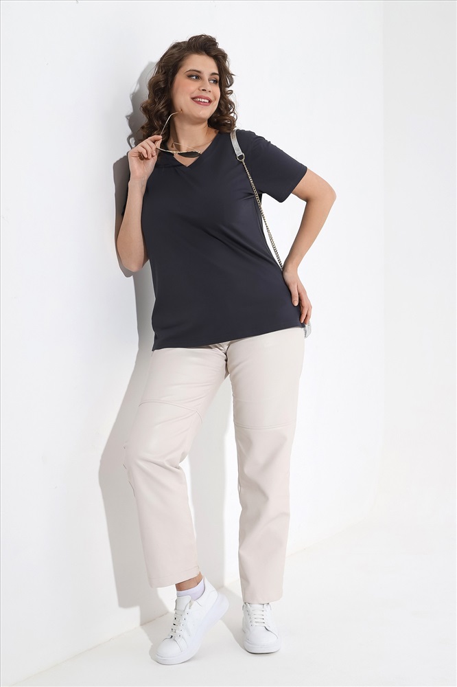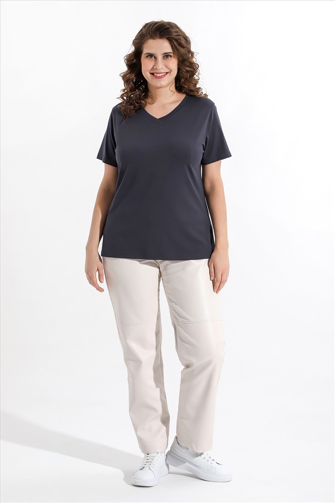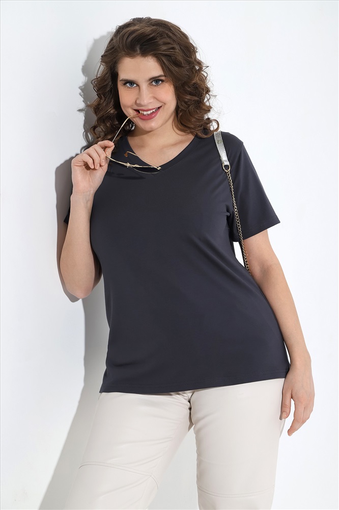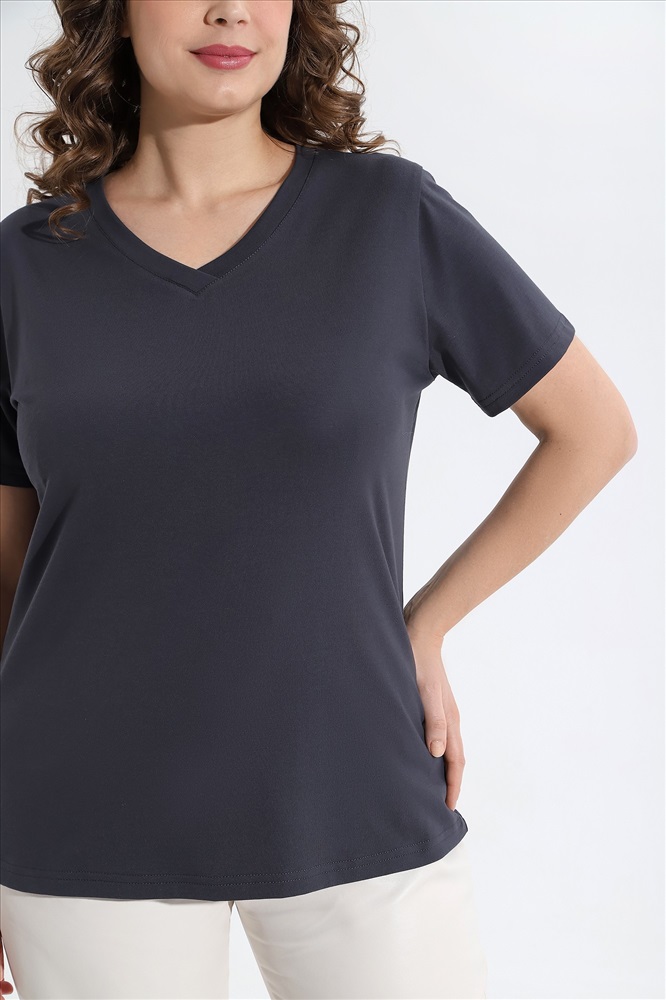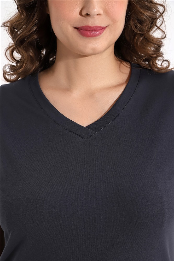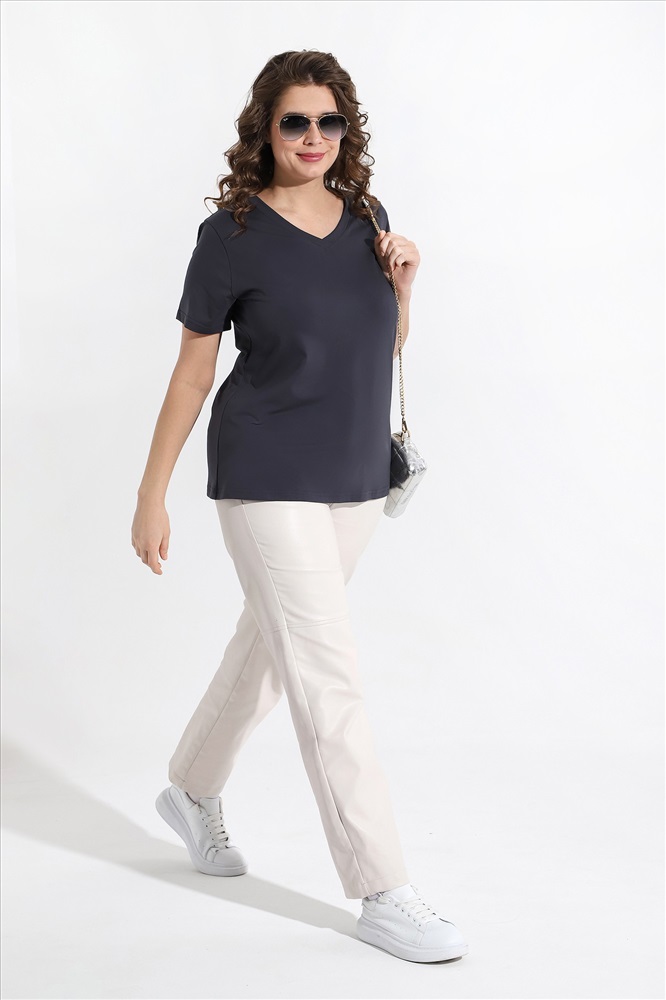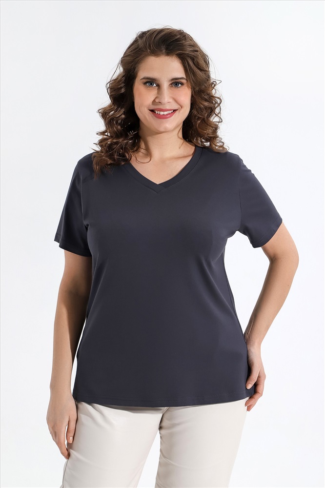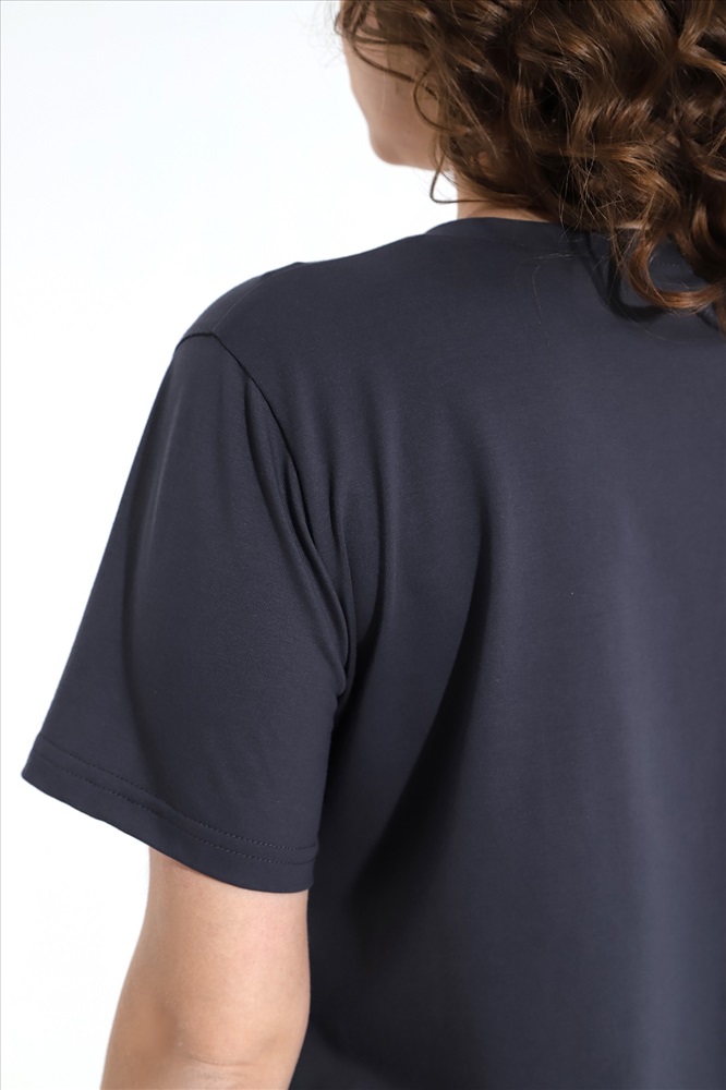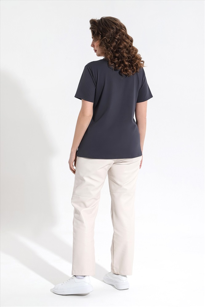Футболка из гладкокрашеного трикотажного полотна «кулирка с лайкрой» классического покроя, с короткими втачными рукавами, горловиной V-образной формы, обработанной втачной планкой и принтом на полочке.