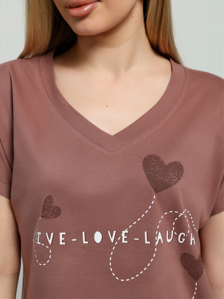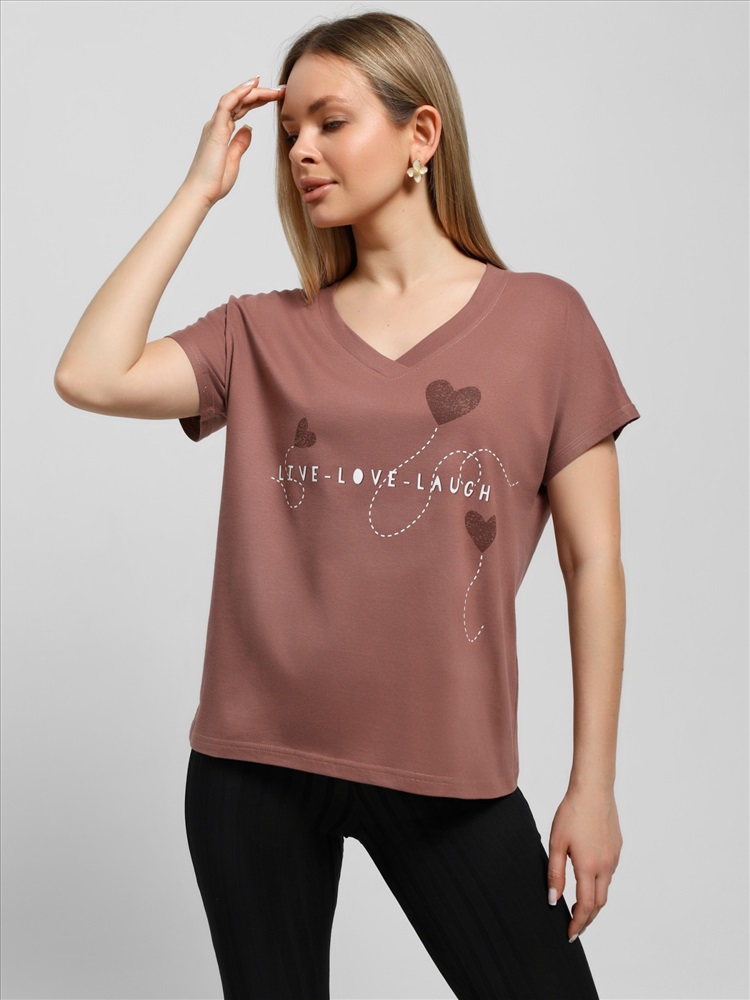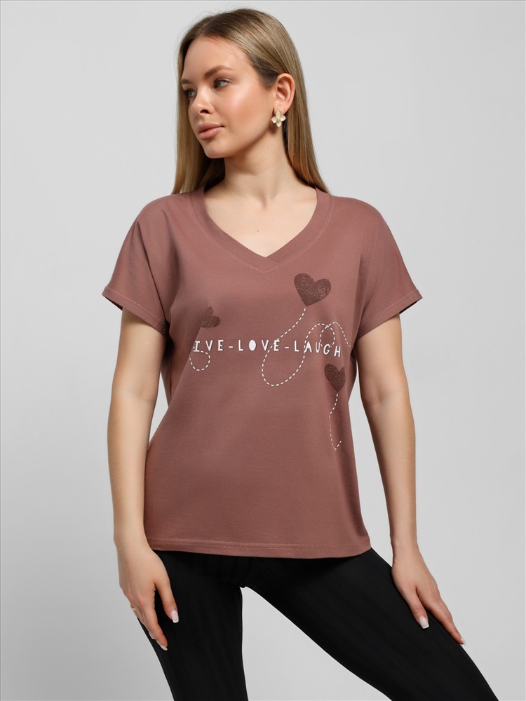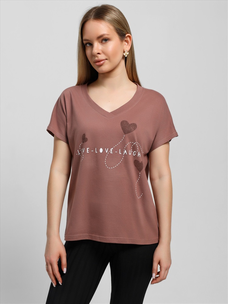Футболка – из гладкокрашеного полотна, с короткими цельнокроеными рукавами, горловиной V-образной формы, обработанной притачной бейкой и принтом на полочке, выполненным в технике шелкографии.