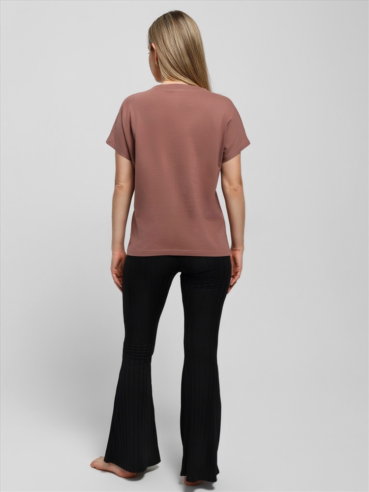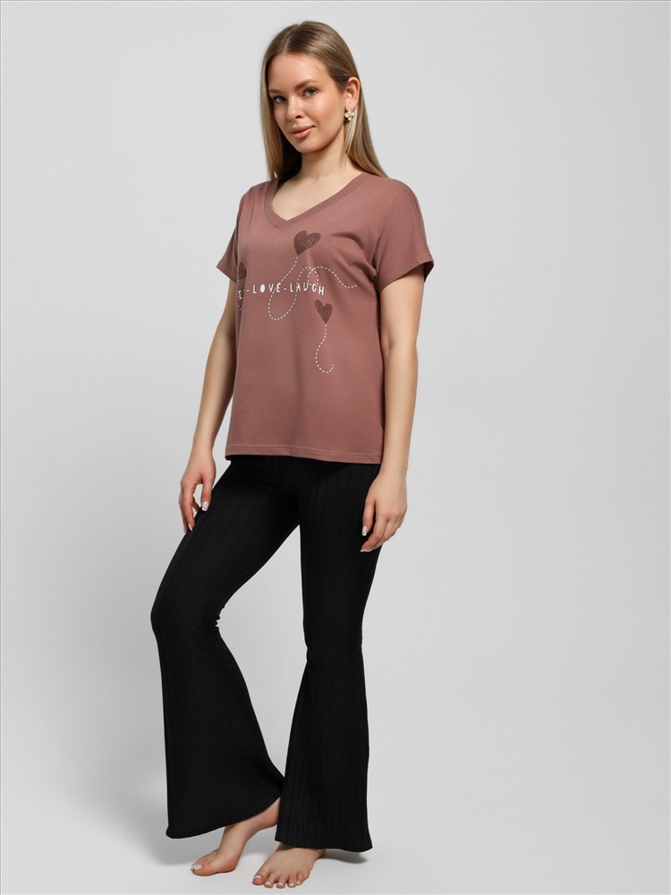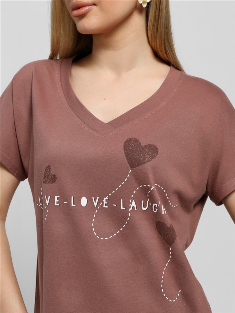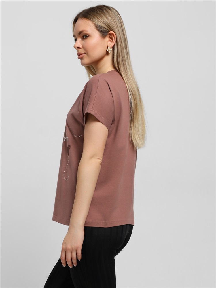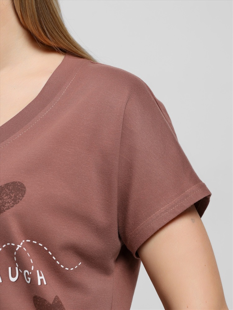 Футболка – из гладкокрашеного полотна, с короткими цельнокроеными рукавами, горловиной V-образной формы, обработанной притачной бейкой и принтом на полочке, выполненным в технике шелкографии.