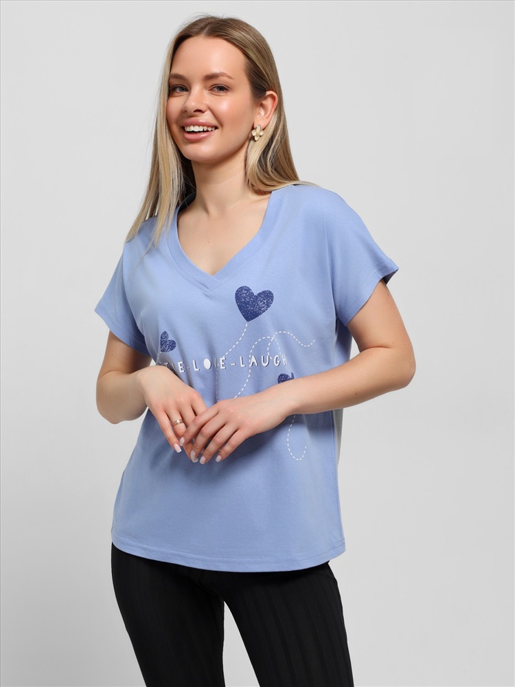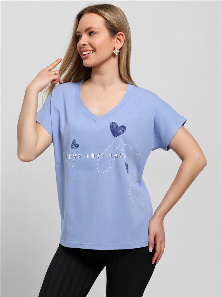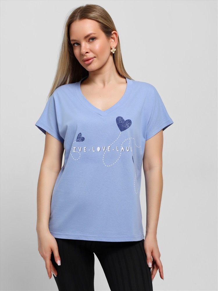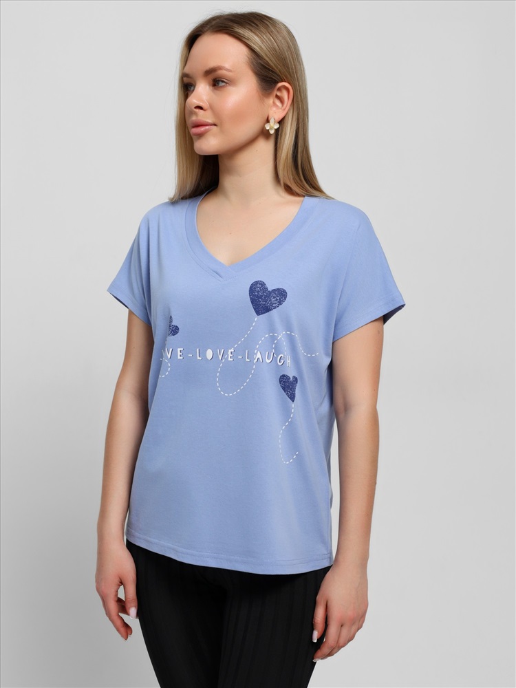 Футболка – из гладкокрашеного полотна, с короткими цельнокроеными рукавами, горловиной V-образной формы, обработанной притачной бейкой и принтом на полочке, выполненным в технике шелкографии.