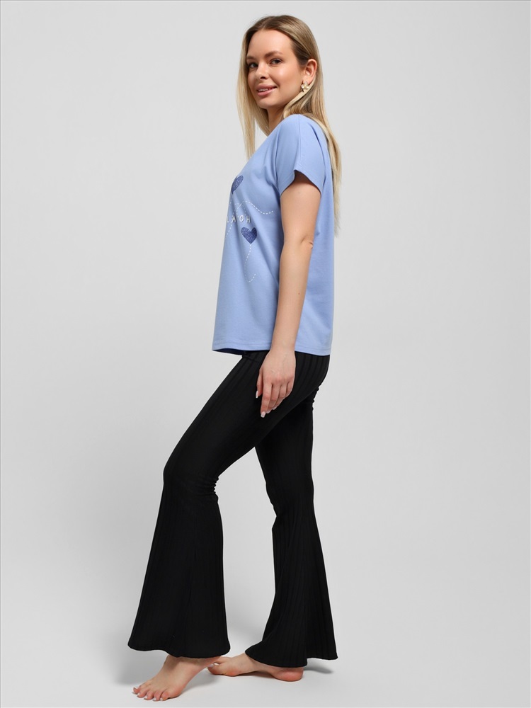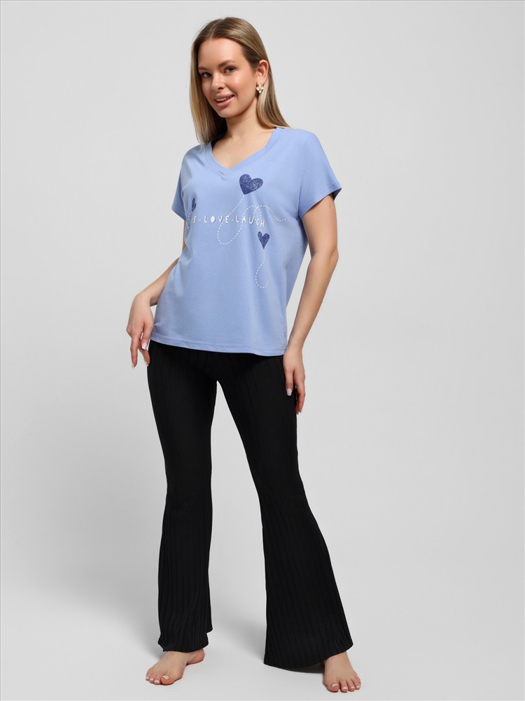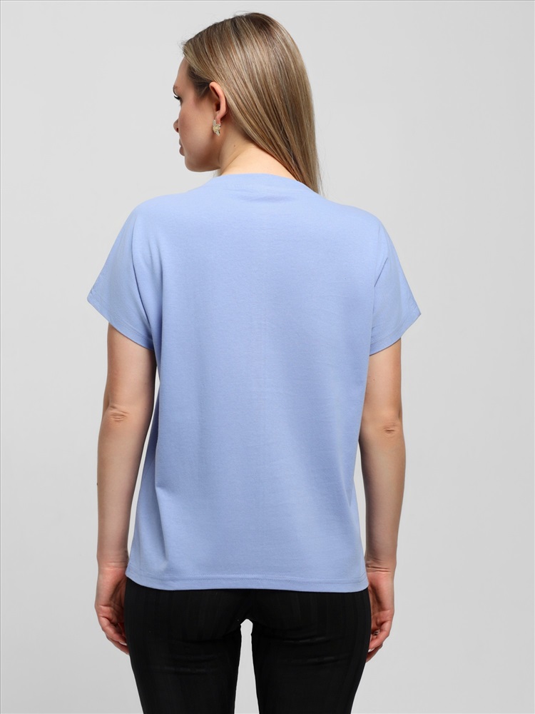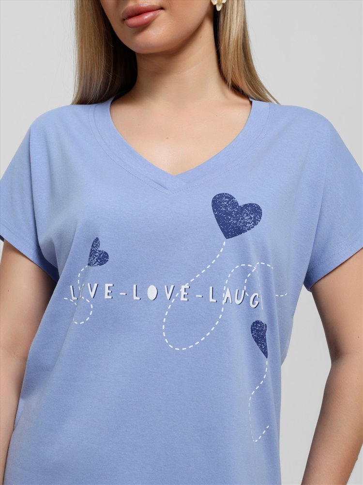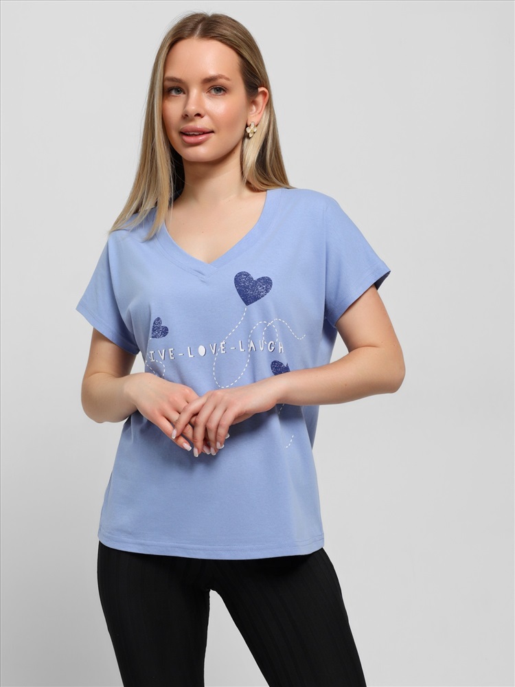 Футболка – из гладкокрашеного полотна, с короткими цельнокроеными рукавами, горловиной V-образной формы, обработанной притачной бейкой и принтом на полочке, выполненным в технике шелкографии.