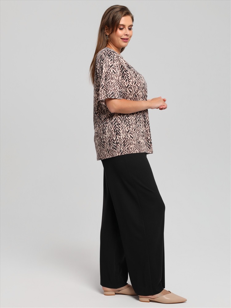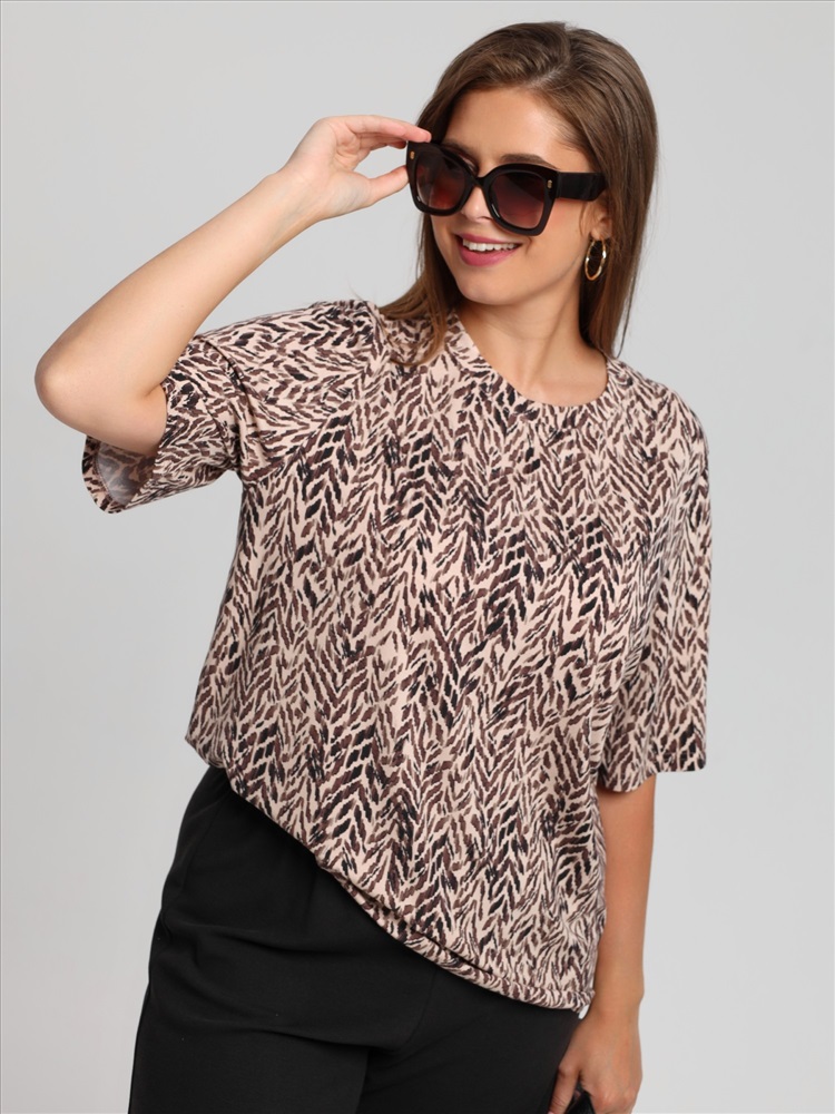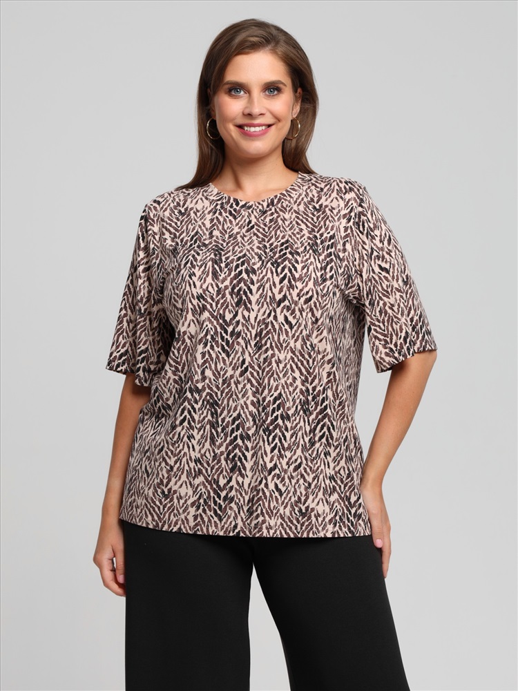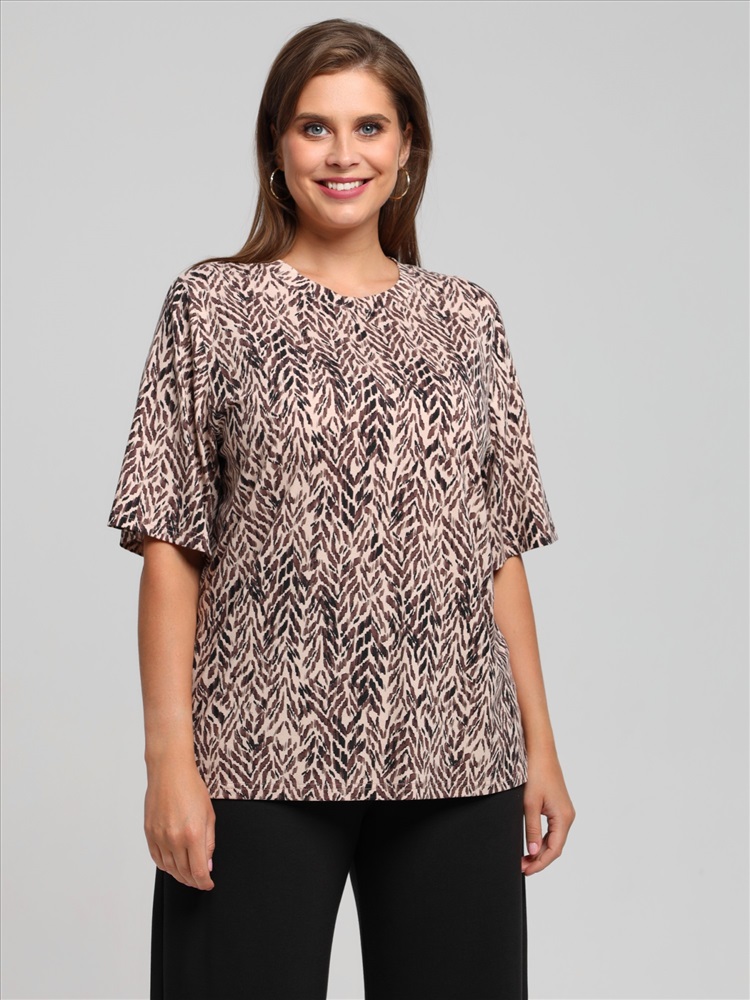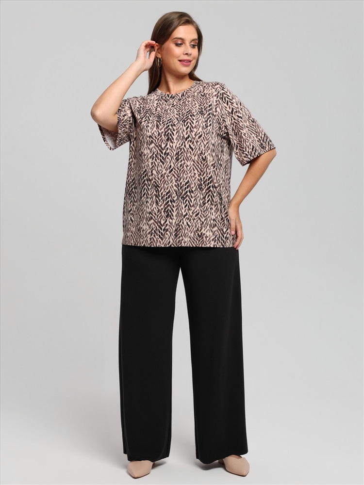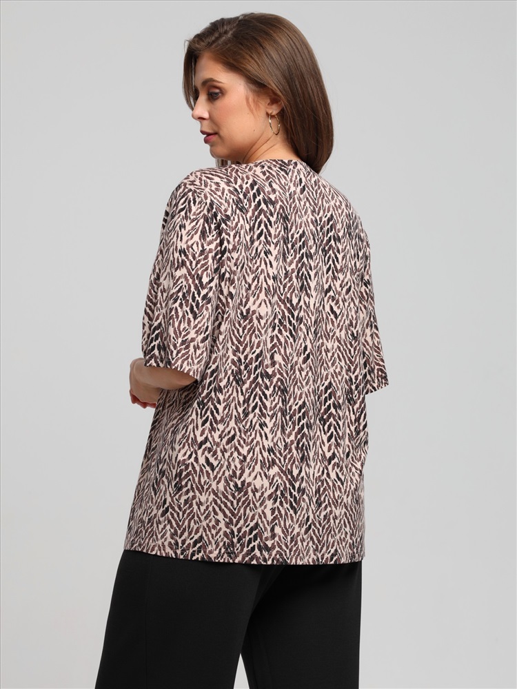 Футболка женская из вискозного трикотажного полотна с набивным рисунком, классического покроя, с горловиной овальной формы, обработанной широкой втачной планкой, с короткими втачными рукавами.