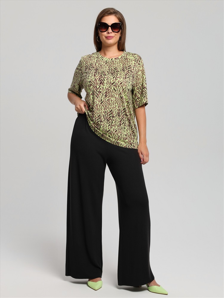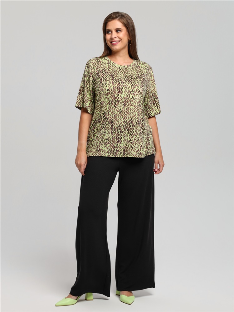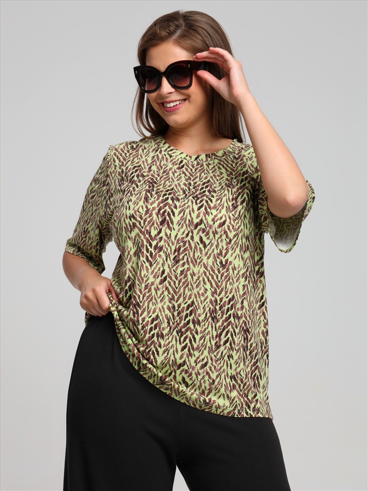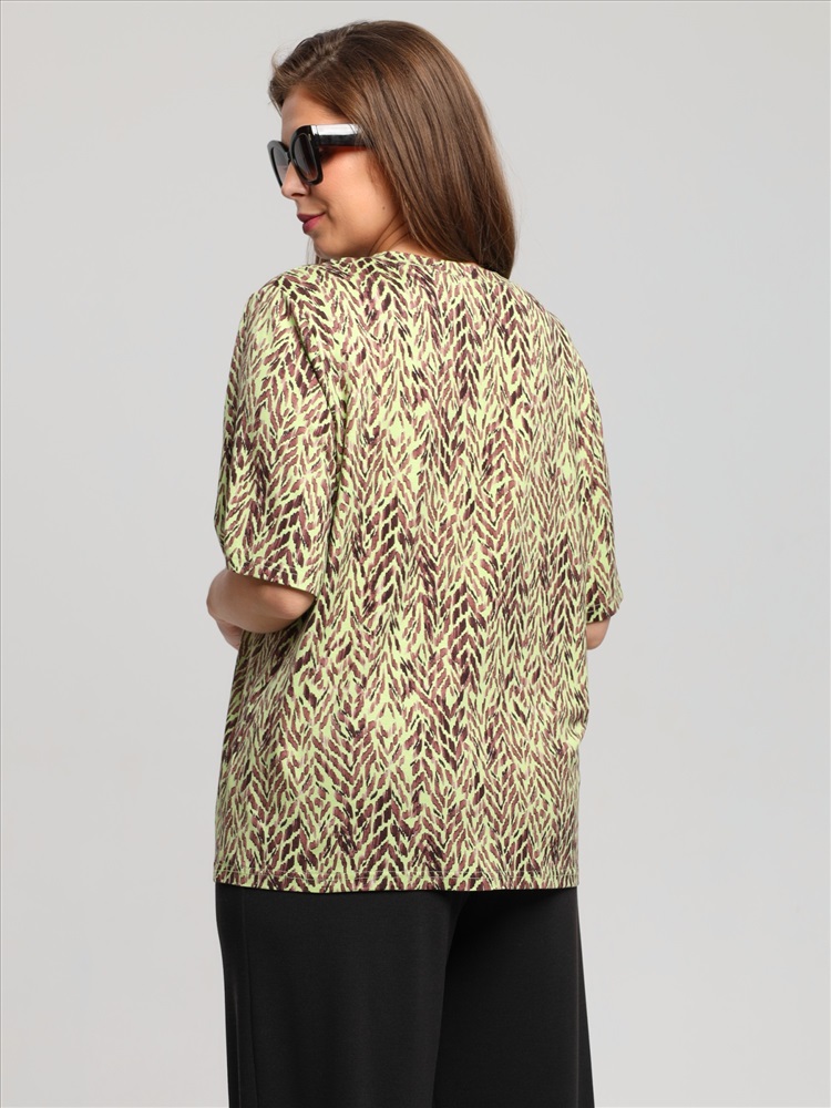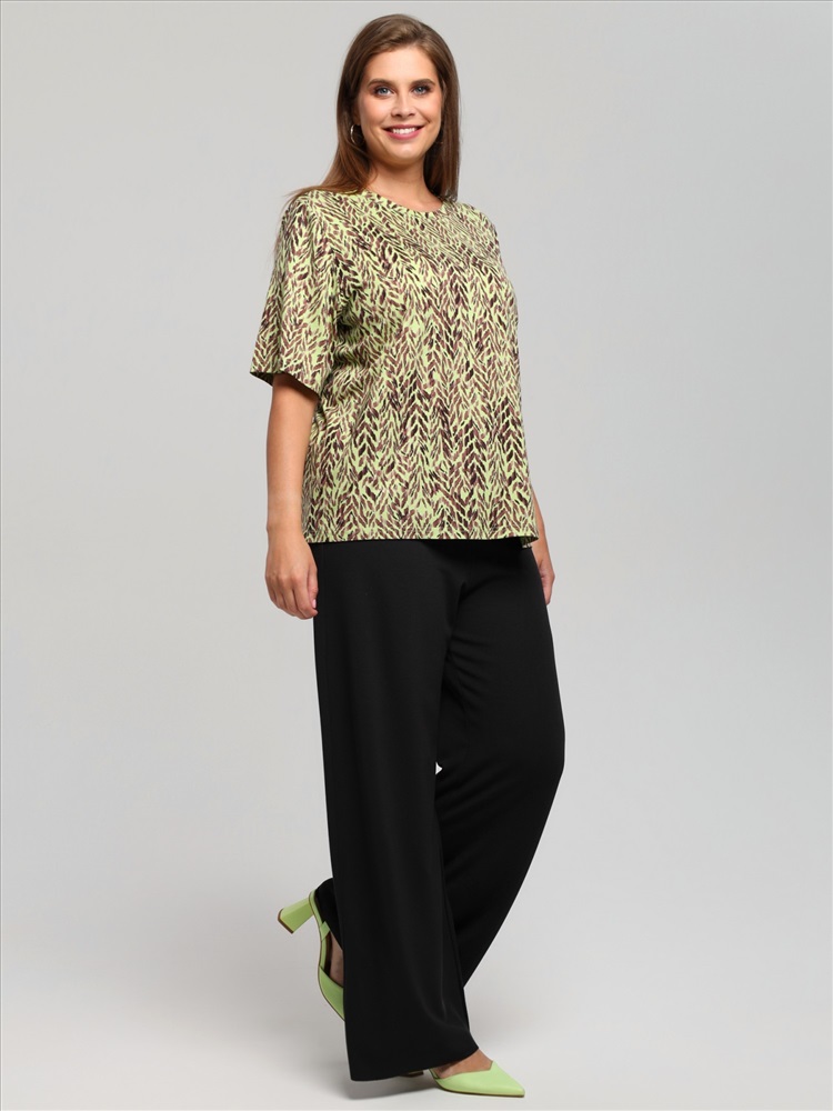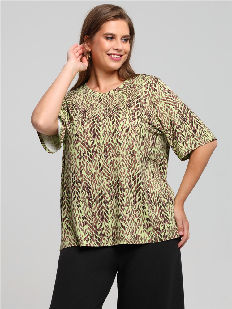 Футболка женская из вискозного трикотажного полотна с набивным рисунком, классического покроя, с горловиной овальной формы, обработанной широкой втачной планкой, с короткими втачными рукавами.