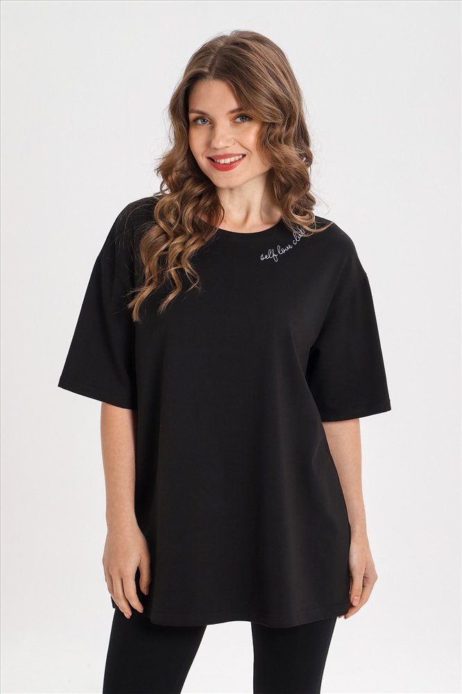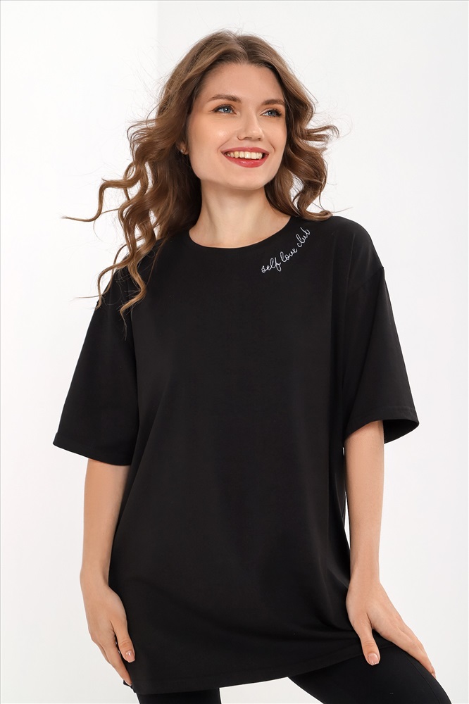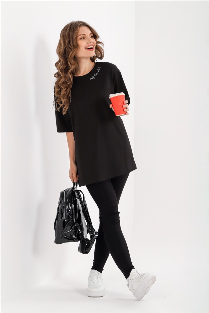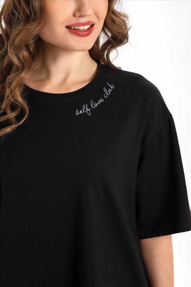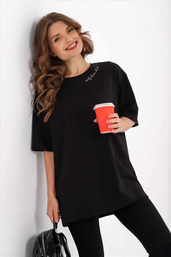 Футболка молодежная из гладкокрашеного трикотажного полотна «кулирка с лайкрой», свободного покроя оверсайз, с короткими втачными рукавами, горловиной овальной формы, обработанной втачной планкой, и вышивкой на полочке.
