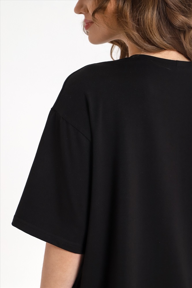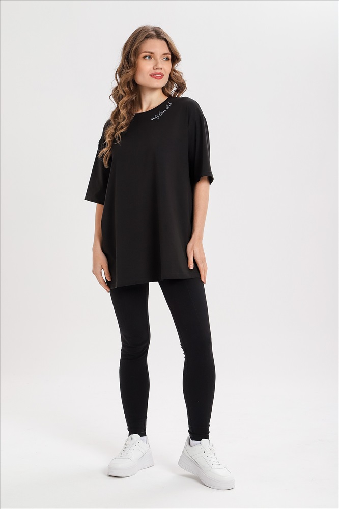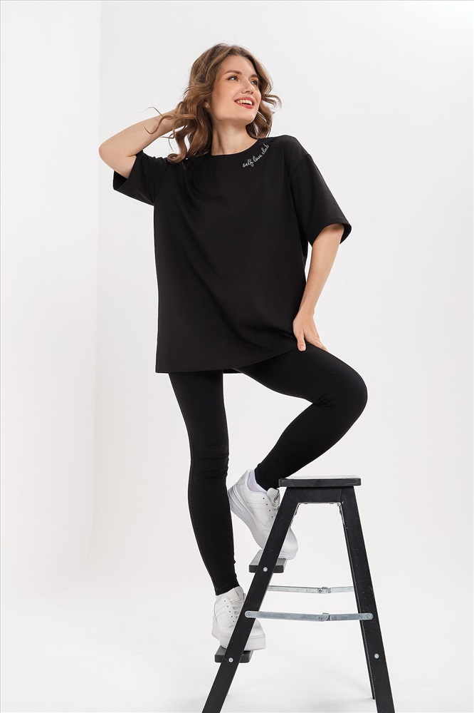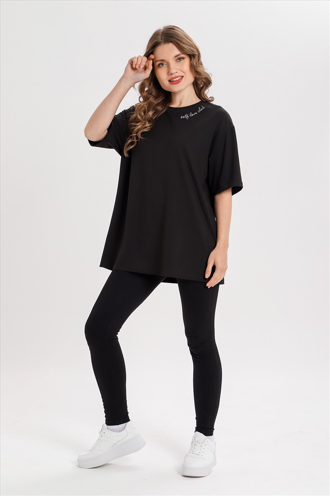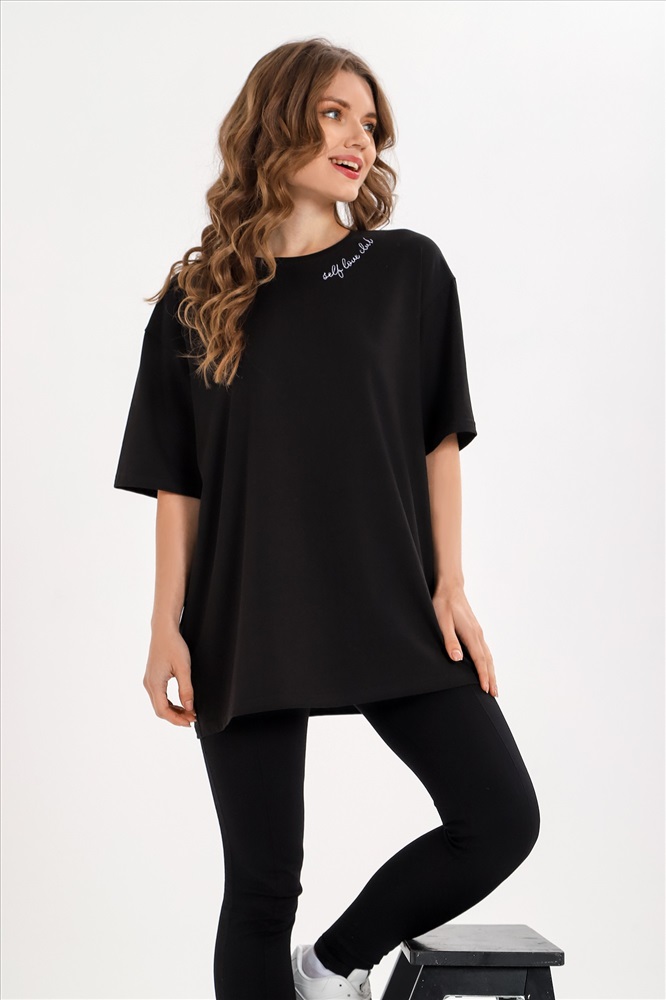 Футболка молодежная из гладкокрашеного трикотажного полотна «кулирка с лайкрой», свободного покроя оверсайз, с короткими втачными рукавами, горловиной овальной формы, обработанной втачной планкой, и вышивкой на полочке.