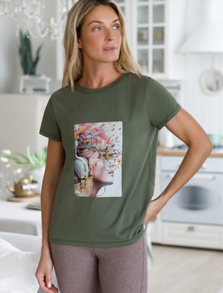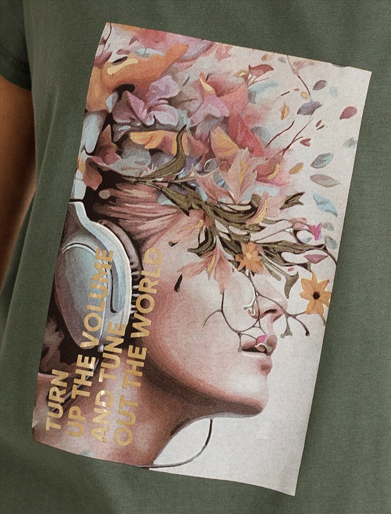 Перевод принта: Turn up the volume and tune out the world - сделай музыку громче и отключись от мира. Футболка прямого кроя выполнена из 100% хлопка. Базовая модель дополнена лаконичным авторским принтом. Легко впишется в повседневный гардероб. Изделие хорошо держит форму и обеспечивает комфортный микроклимат в течение дня.