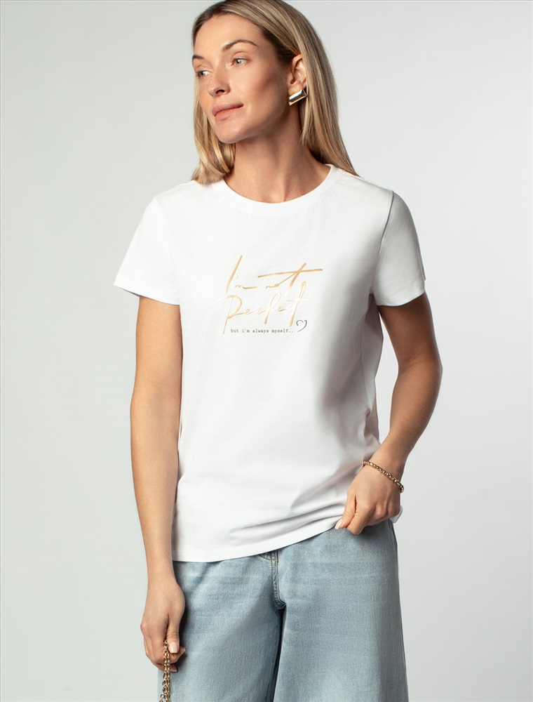 Состав: 100%Хлопок Перевод принта: "I am not perfect, but I'm always myself - я не идеальна, но я всегда настоящая". Футболка прямого кроя выполнена из 100% хлопка. Базовая модель дополнена лаконичным авторским принтом. Легко впишется в повседневный гардероб. Изделие хорошо держит форму и обеспечивает комфортный микроклимат в течение дня.