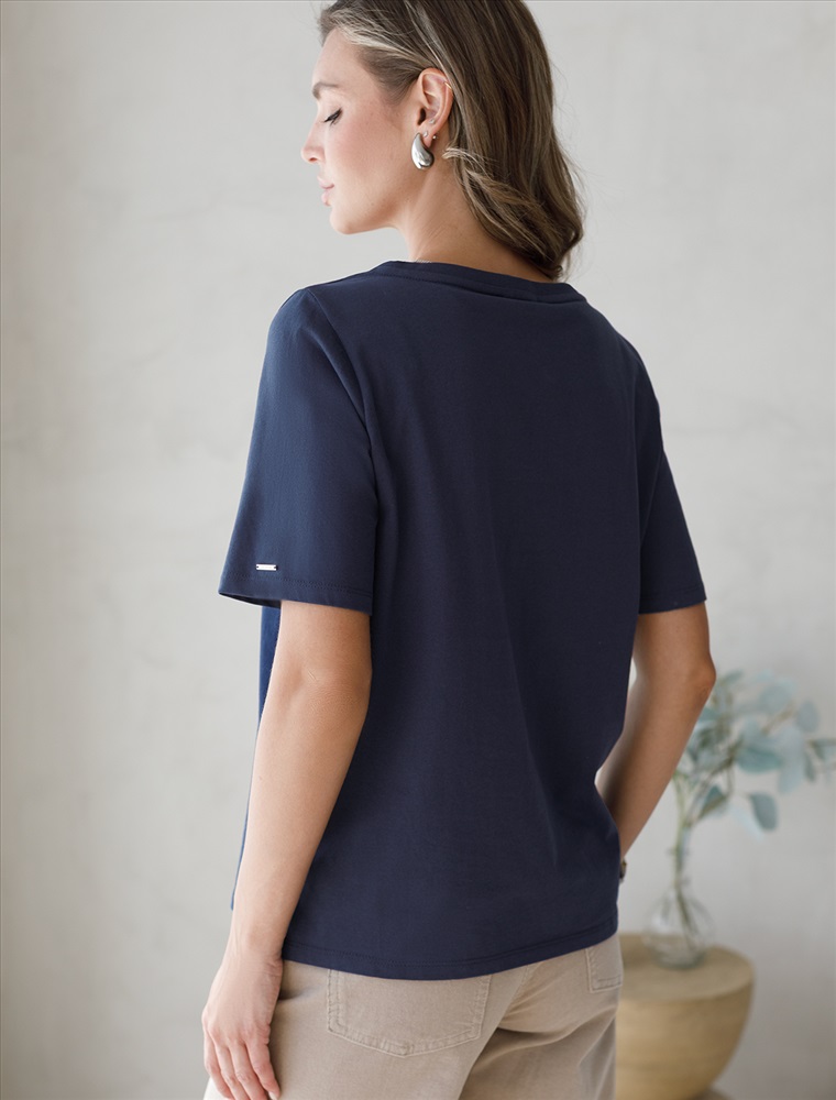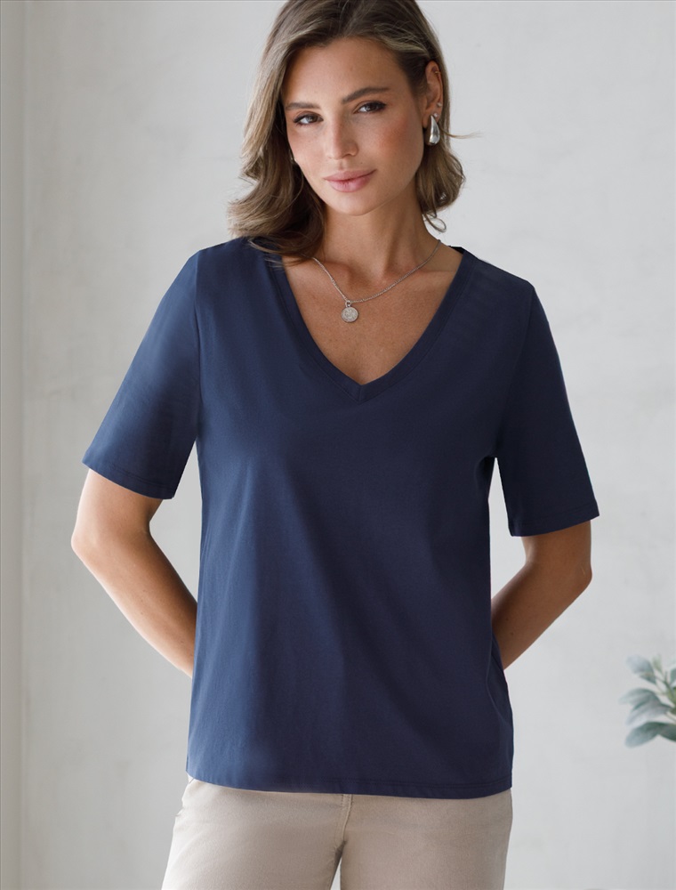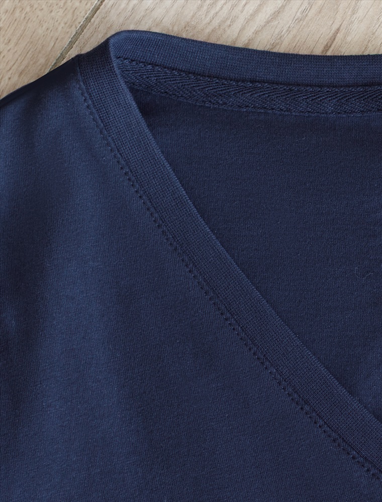 Базовая модель свободного кроя c V-вырезом легко впишется в повседненвый гардероб. Изделие хорошо держит форму и обеспечивает комфортный микроклимат в течение дня.