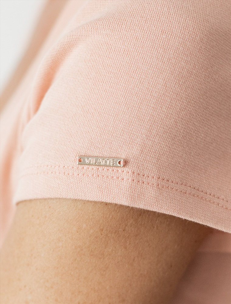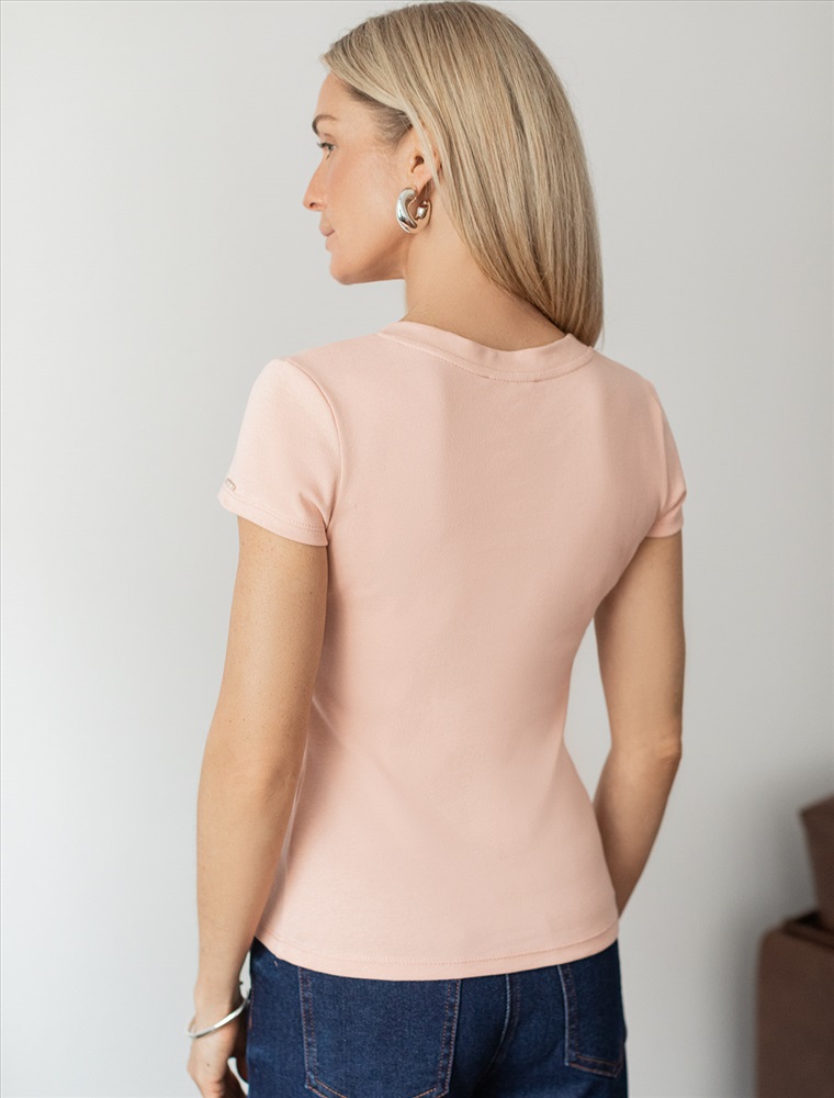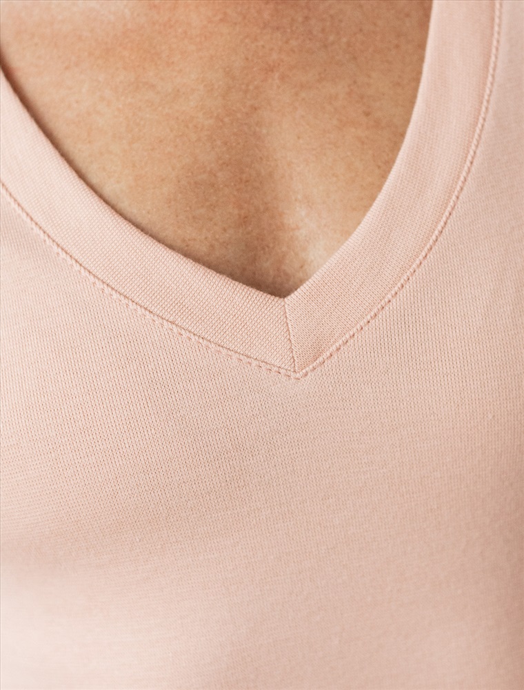 Облегающая футболка с V-образным вырезом в пудровом цвете создаст утонченный образ. Идеальная базовая модель для вашего гардероба! Глубокий V-образный вырез подчеркивает линию шеи и зрительно удлиняет силуэт. Футболка выполнена из хлопка с добавлением эластана, которая мягко облегает контуры тела, подчеркивая достоинства фигуры. Универсальный вариант для создания стильных повседневных образов.