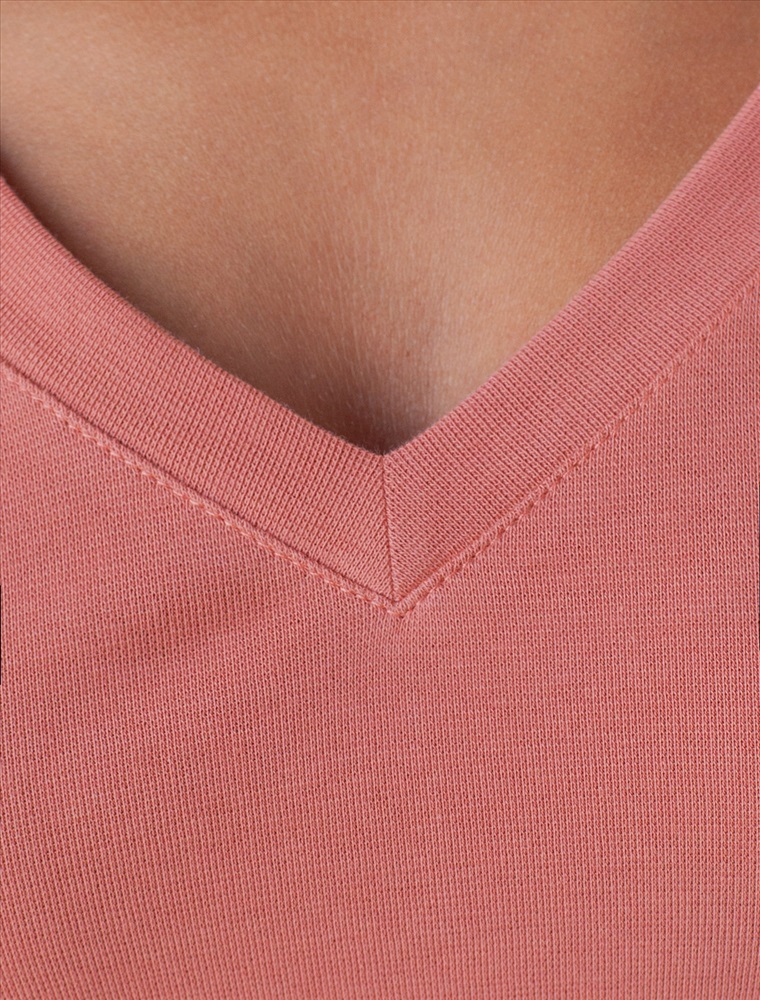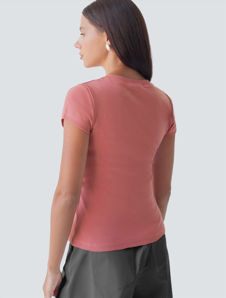 Облегающая футболка с V-образным вырезом террактового цвета создаст утонченный образ. Идеальная базовая модель для вашего гардероба! Глубокий V-образный вырез подчеркивает линию шеи и зрительно удлиняет силуэт. Футболка выполнена из хлопка с добавлением эластана, которая мягко облегает контуры тела, подчеркивая достоинства фигуры. Универсальный вариант для создания стильных повседневных образов.