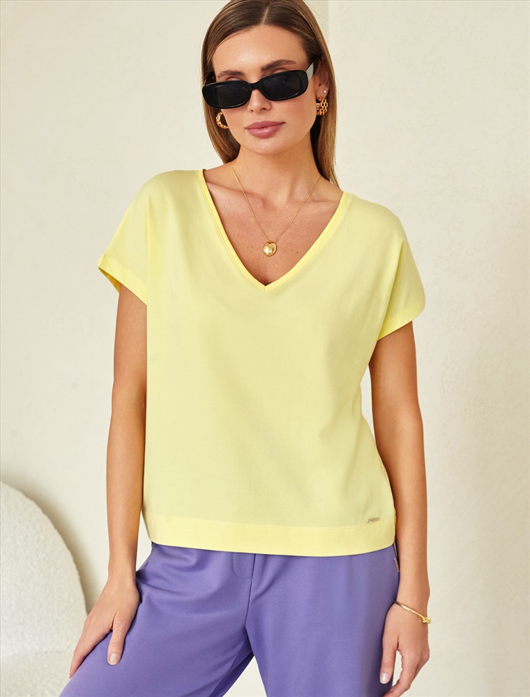 Параметры модели на первом фото: Рост 170, бюст 89, талия 63, бедра 92 Футболка с цельнокроеным рукавом выполнена из премиального хлопка. Базовая однотонная модель идеально впишется в любой гардероб. V-вырез подчеркивает ключицы и удлиняет шею, хорошо сочетается с жакетами или кардиганами. Изделие дополнено металлическим логотипом бренда. Комментарии к товару