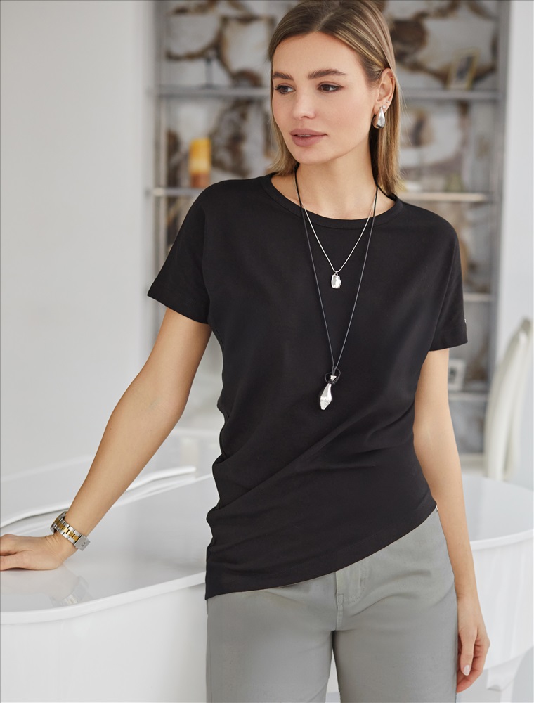Параметры модели на первом фото: Рост 172, бюст 88, талия 64, бедра 88 Футболка выполнена из премиального хлопка. Модель дополнена ассиметричным низом драпирующийся изящными волнами. Наличие эластана в составе изделия гарантирует комфорт и формоустойчивость. На рукаве металлический логотип бренда. Хорошо впишется как в праздничный образ, так и в повседневный аутфит. Комментарии к товару