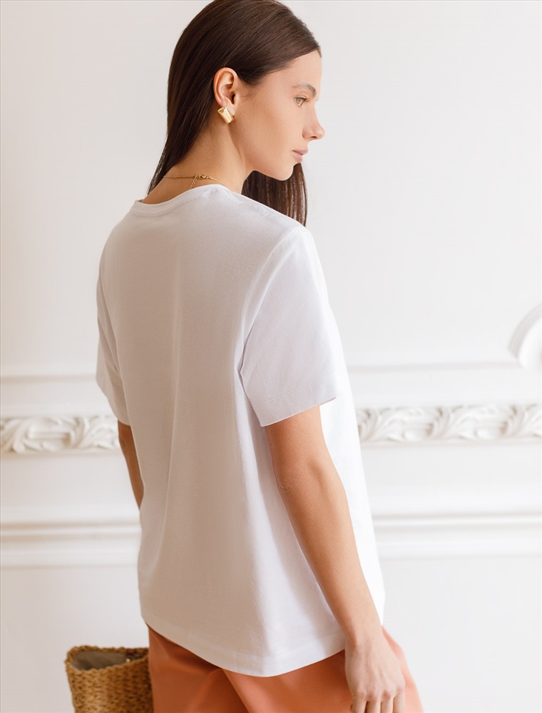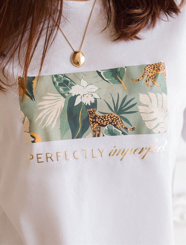Перевод принта: "Perfectly imperfect - идеально несовершенная". Футболка прямого кроя выполнена из 100% хлопка. Базовая модель с лаконичным авторским принтом легко впишется в повседневный гардероб. Хорошо держит форму и обеспечивает комфортный микроклимат в течение дня.