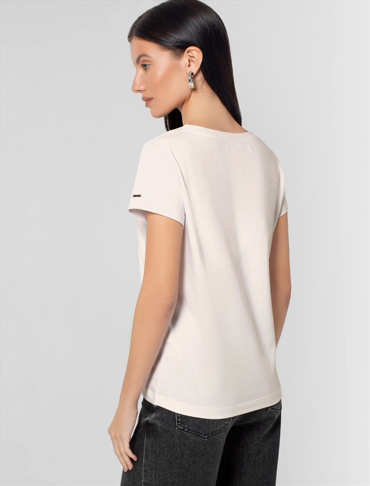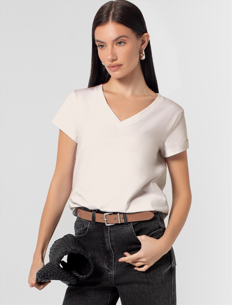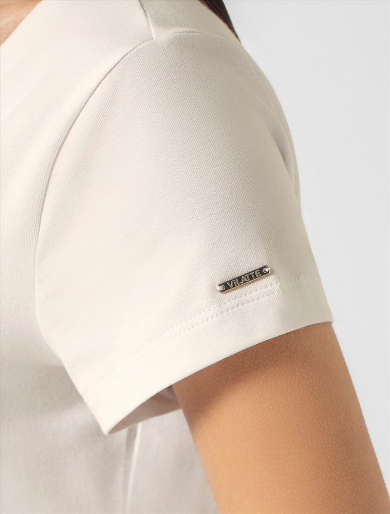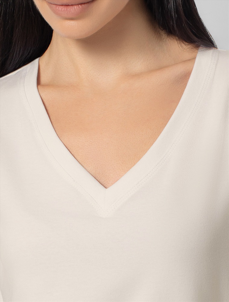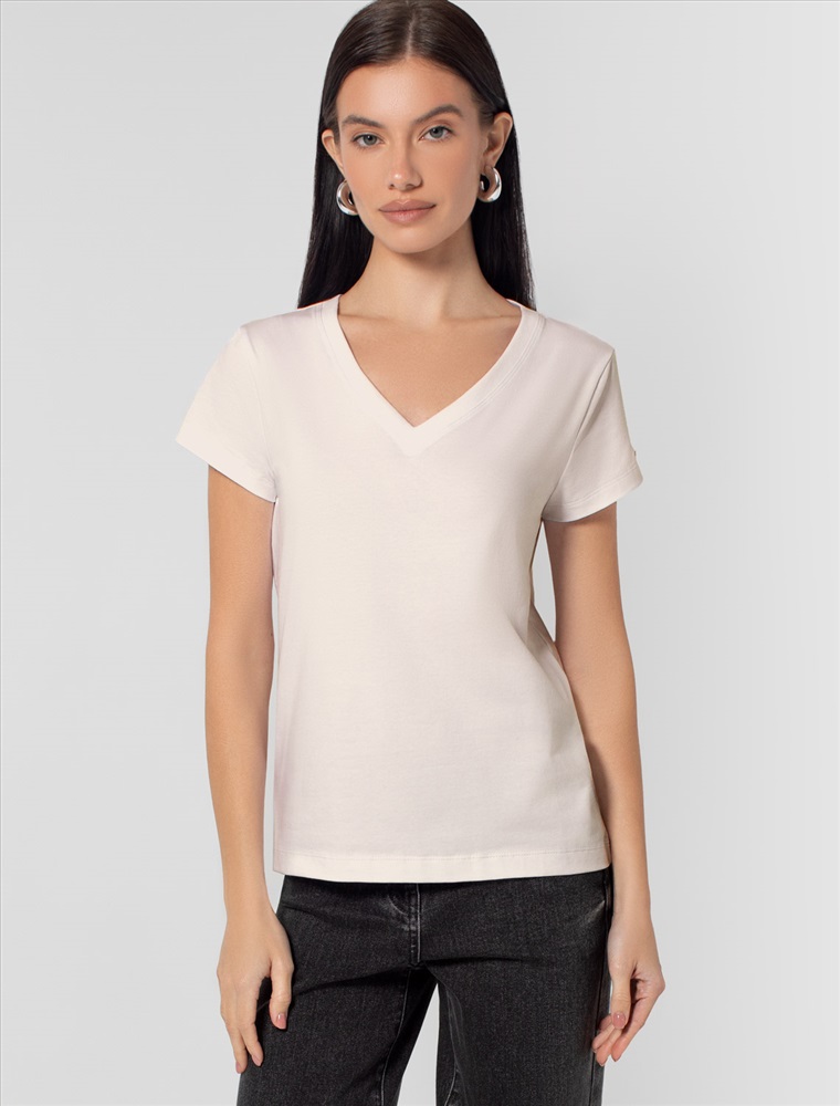 Однотонная футболка с V-образным вырезом выполнена из премиального хлопка. Добавление эластана в состав изделия способствует формоустойчивости. Самое высокое качество длинноволокнистых хлопковых волокон обеспечивает комфорт в любое время года. Совет стилиста: очищенная от декора базовая модель будет уместна не только в повседневном образе с денимом, но и в офисе с нестрогим дресс-кодом, в паре с брюками и жакетом.