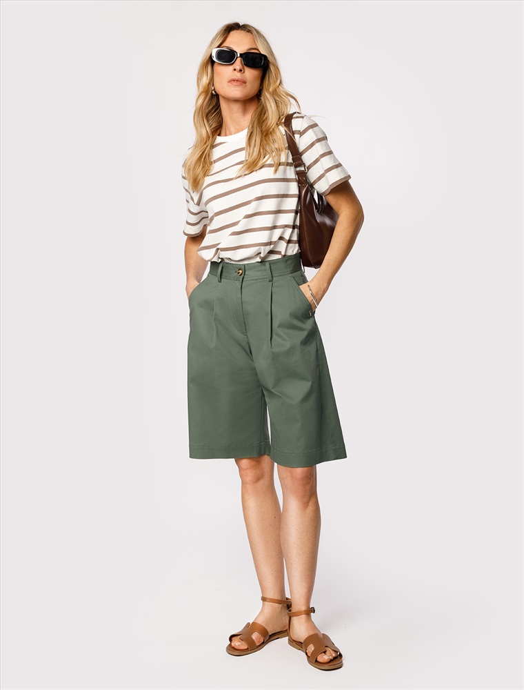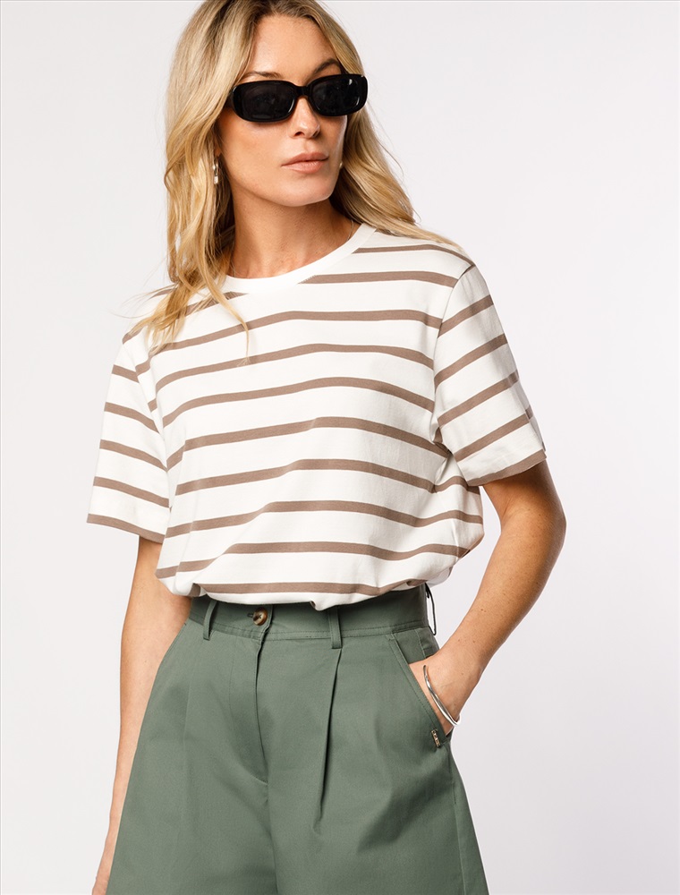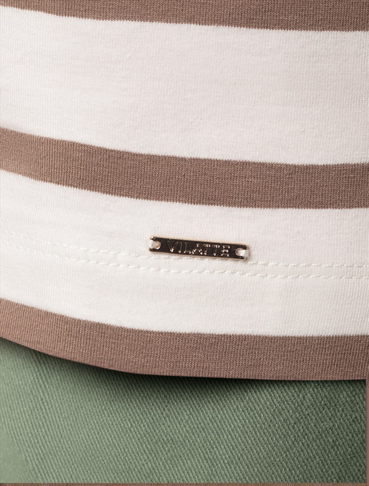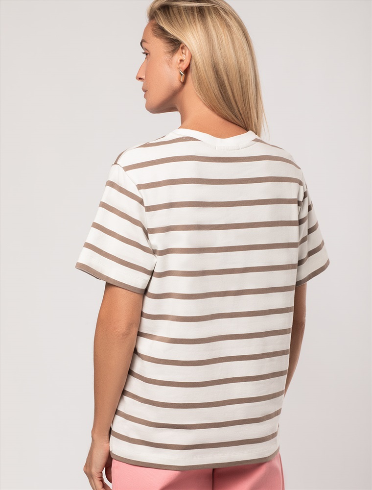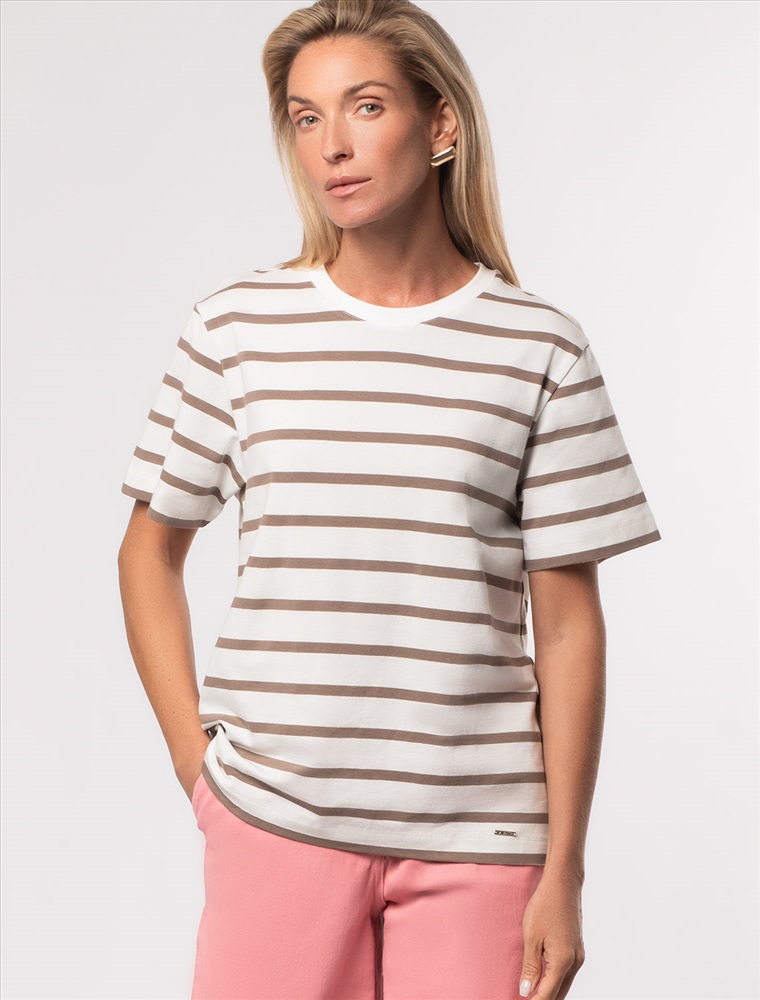 Параметры модели на первом фото: Рост 172, бюст 88, талия 64, бедра 88 Футболка выполнена из премиального хлопка. Наличие эластана гарантирует абсолютный комфорт и долговечность изделия. Модель в полоску предлагаем сочетать с однотонными вещами базовой палитры. Изделие дополнено металлическим логотипом бренда. Комментарии к товару