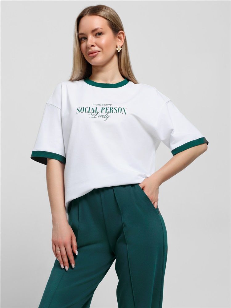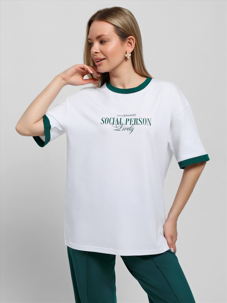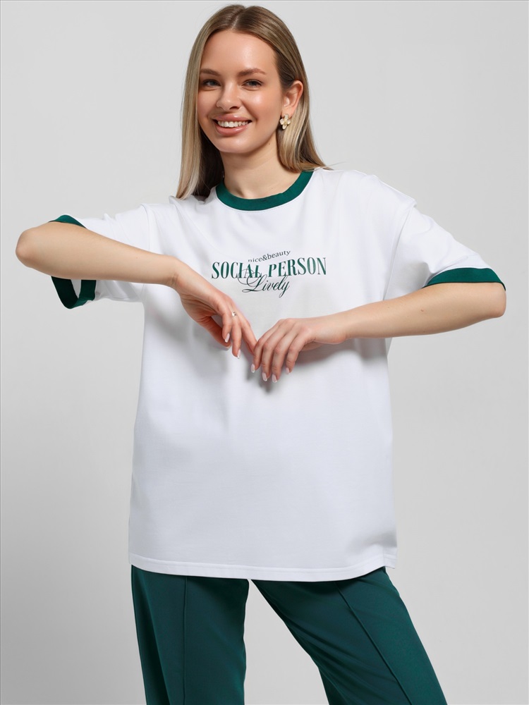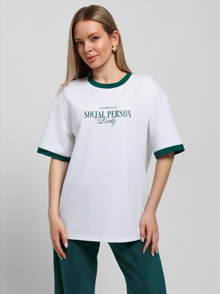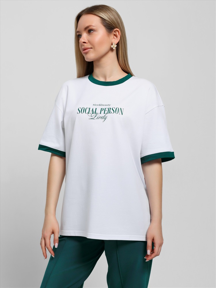 Ткань: Кулирка с лайкрой Футболка молодежная из трикотажного полотна «кулирка с лайкрой» свободного покроя, горловиной овальной формы, короткими втачными рукавами. Планка горловины и манжеты на рукавах выполнены из контрастного материала, на полочке принт, выполненный в технике «шелкографии».