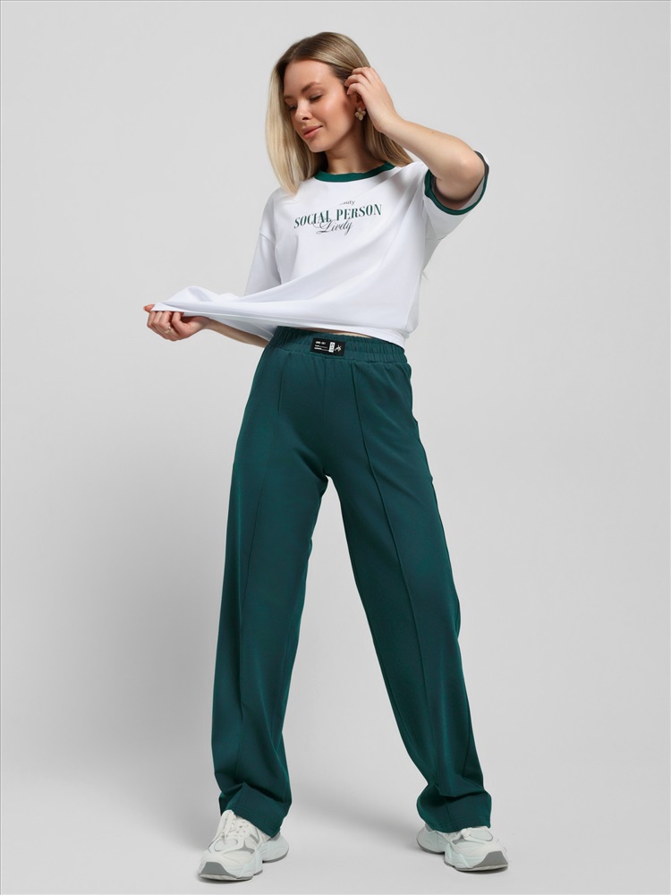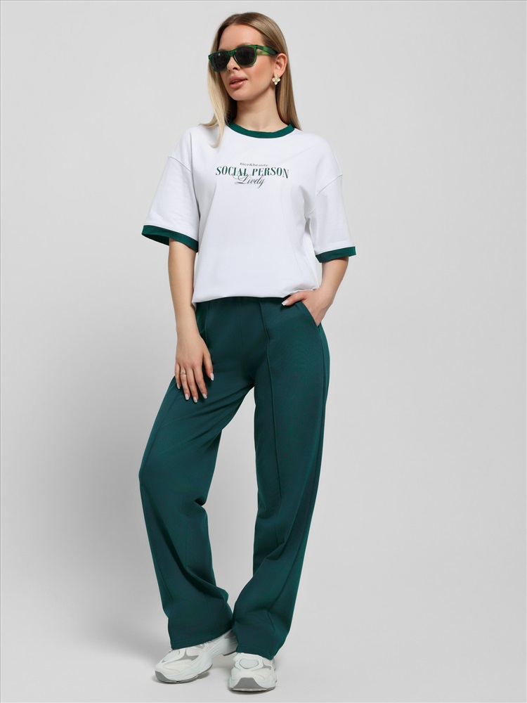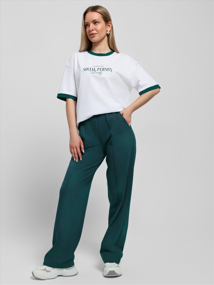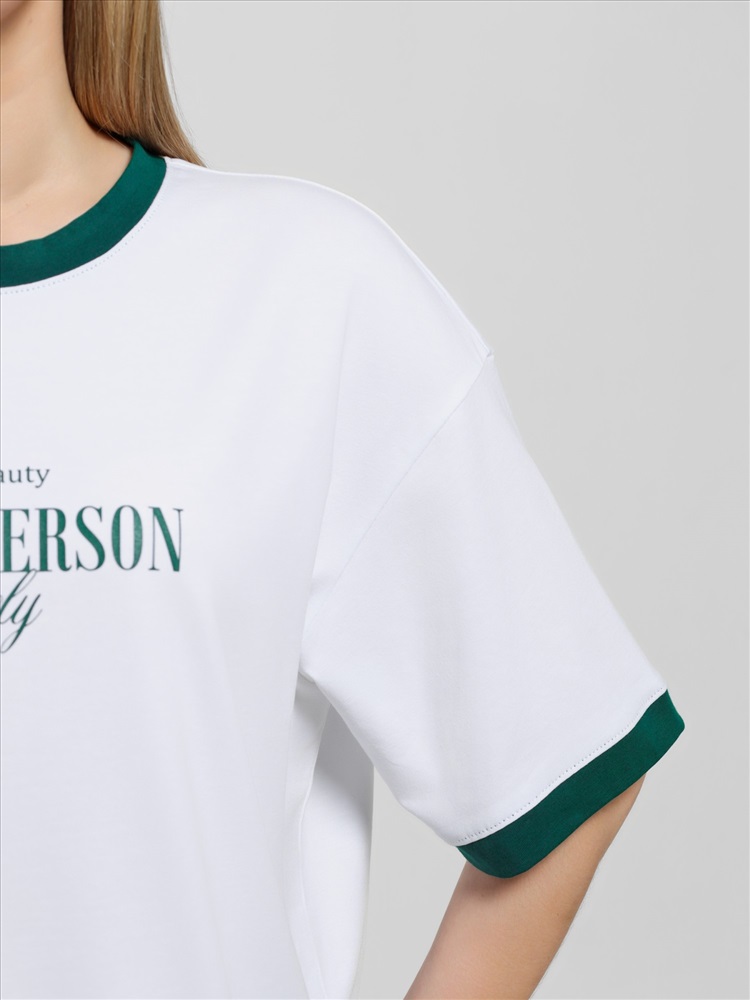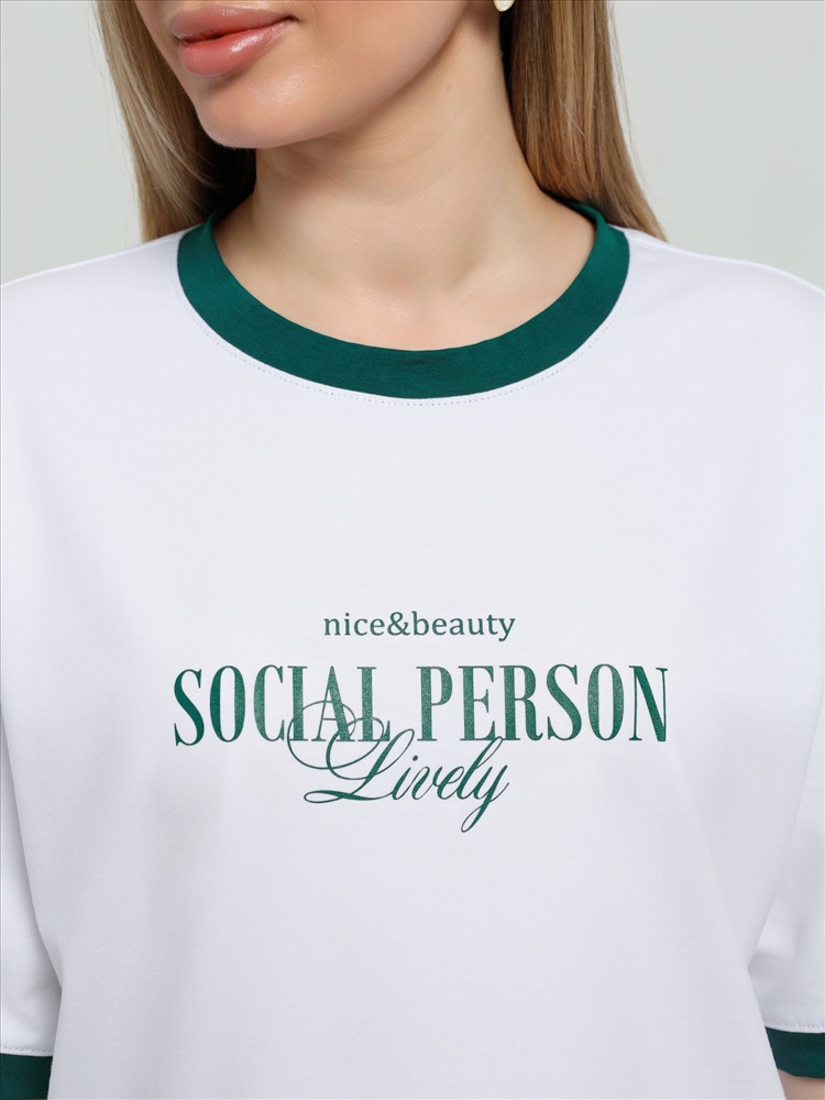 Ткань: Кулирка с лайкрой Футболка молодежная из трикотажного полотна «кулирка с лайкрой» свободного покроя, горловиной овальной формы, короткими втачными рукавами. Планка горловины и манжеты на рукавах выполнены из контрастного материала, на полочке принт, выполненный в технике «шелкографии».