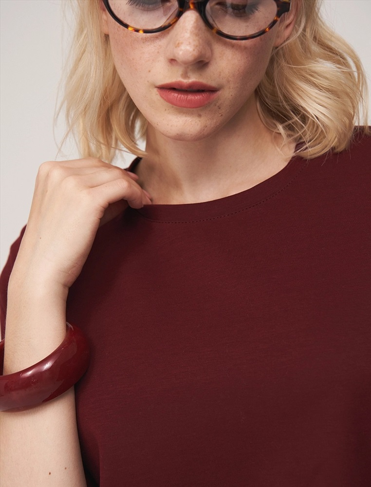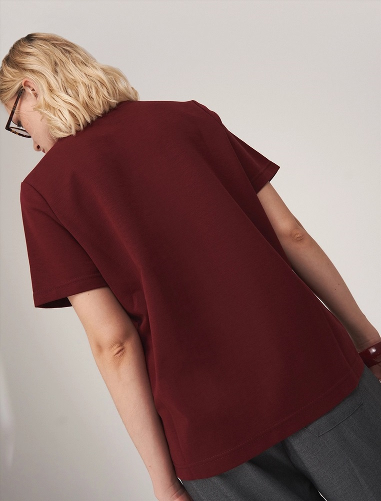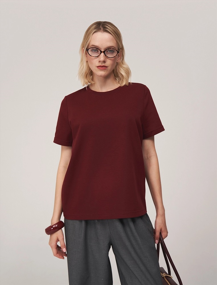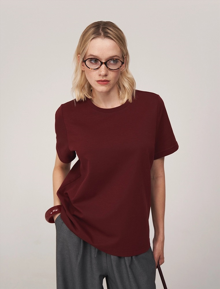Футболка прямого силуэта с регулярной горловиной и короткими втачными рукавами. Ткань – хлопок, с небольшим добавлением спандекса, что продлевает срок эксплуатации изделия. Выполнена в оттенках коллекции.