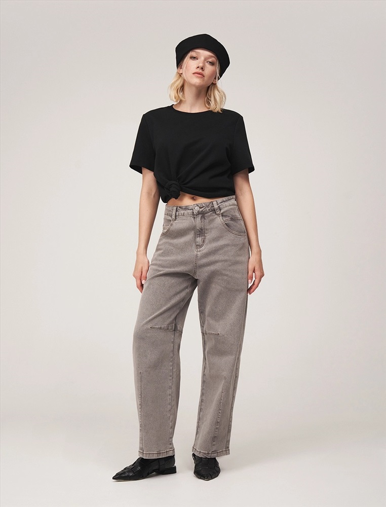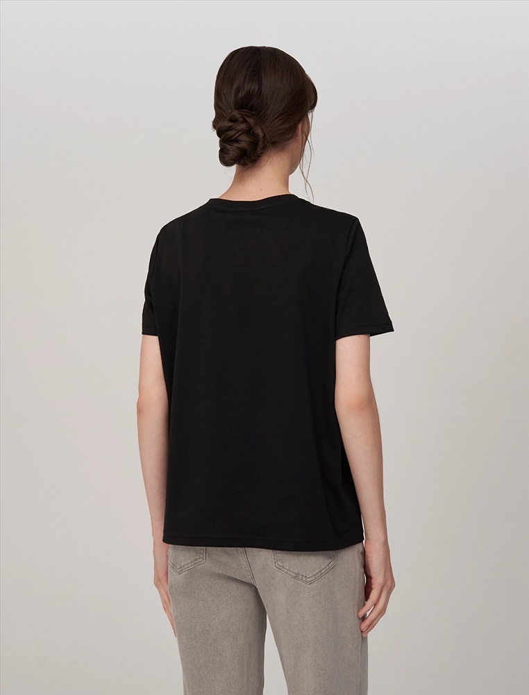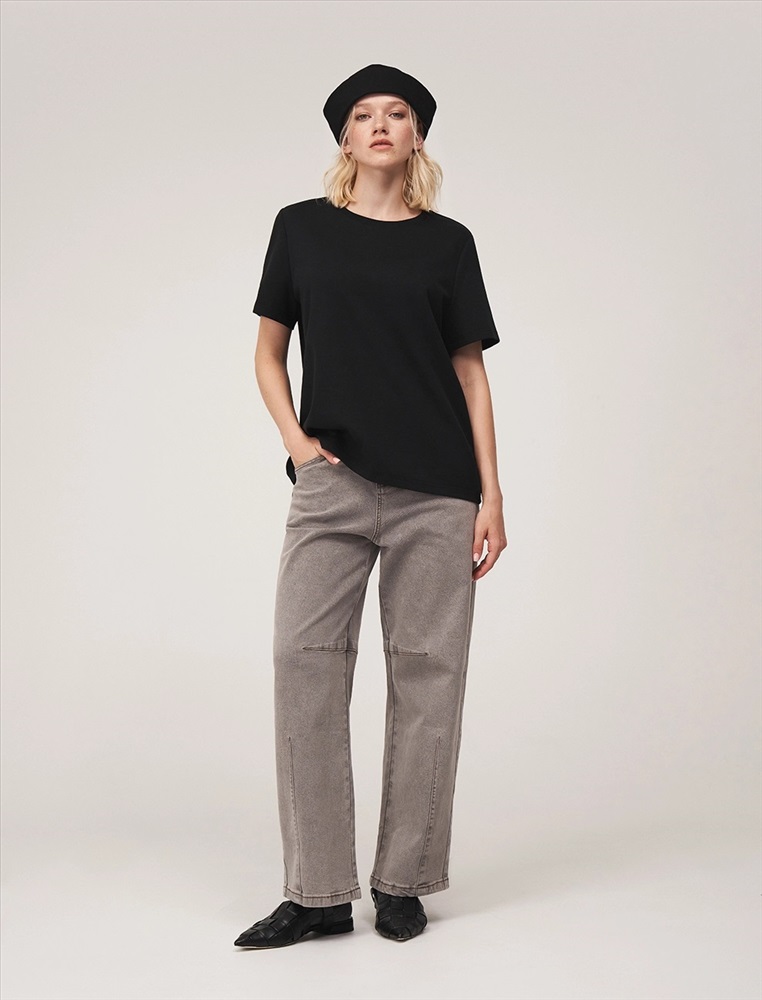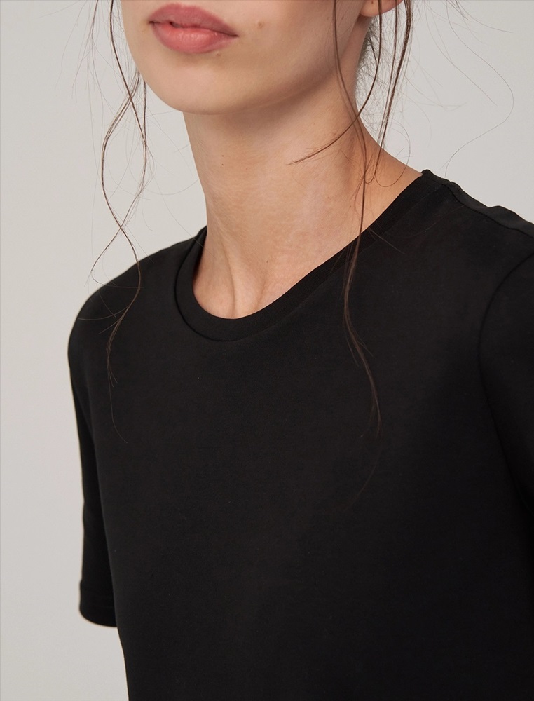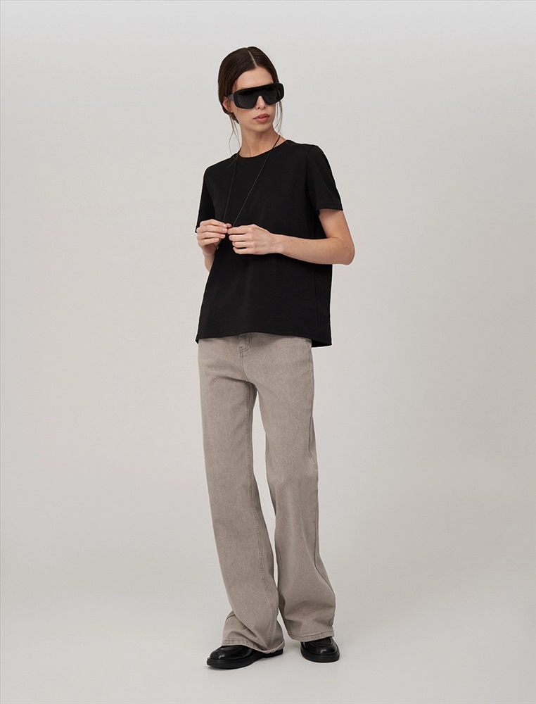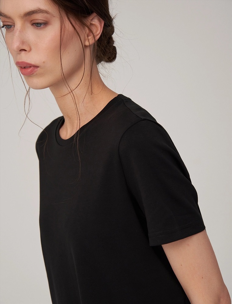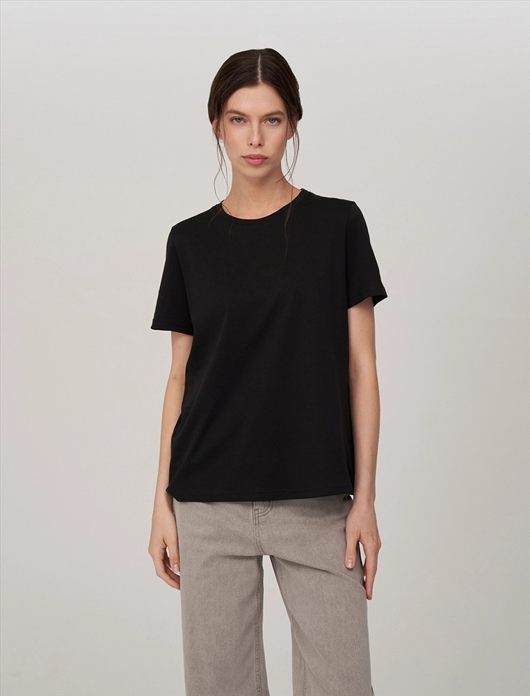 Футболка прямого силуэта с регулярной горловиной и короткими втачными рукавами. Ткань – хлопок, с небольшим добавлением спандекса, что продлевает срок эксплуатации изделия. Выполнена в оттенках коллекции.