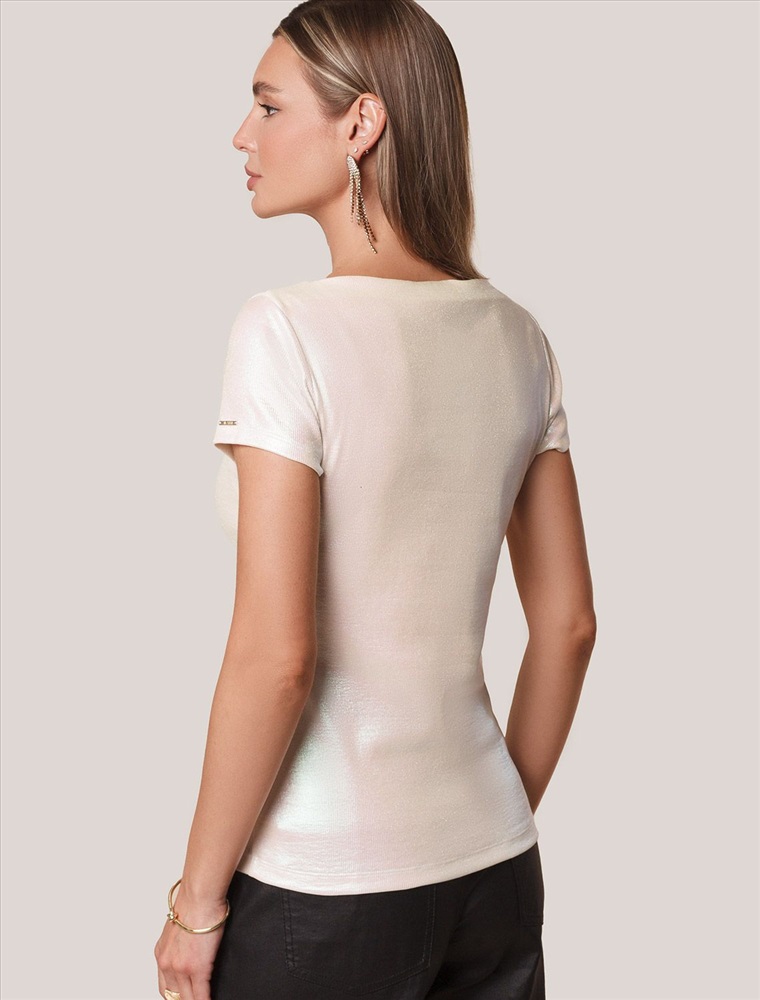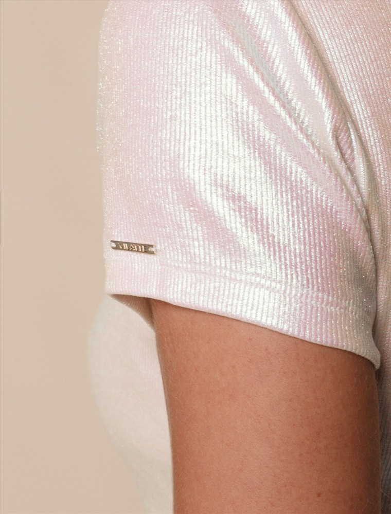 Плотность: 175 Г/м2 Стильная футболка перламутрового цвета с вырезом лодочка выполнена из премиального хлопка с добавлением эластана. Эффектное матовое покрытие металлик придает футболке изысканный блеск. Вырез лодочка добавляет элегантности и женственности образу. Мелкий рубчик визуально вытягивает силуэт, за счет эластана в составе материал прекрасно тянется и садится на любую фигуру, в том числе большие размеры. Ткань износостойкая, сохраняет свой превоначальный вид даже после многочисленных стирок, отличается мягкостью и приятными тактильными ощущениями, такой материал не раздражает кожу, дарит ощущение уюта даже при длительном ношении, а воздухопроницаемость позволяет коже свободно дышать. Повседневная футболка универсальна: она сочетается с джинсами, юбками или строгими брюками — легко создать как деловой образ для офиса, так и наряд для вечеринки или ужина вне дома. Матовое покрытие создает благородный блеск без лишней яркости, благодаря чему футболка смотрится свежо и актуально. Комментарии к товару