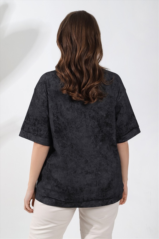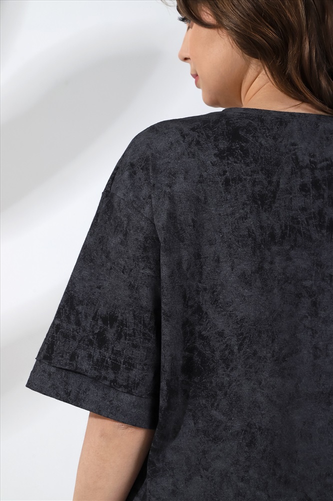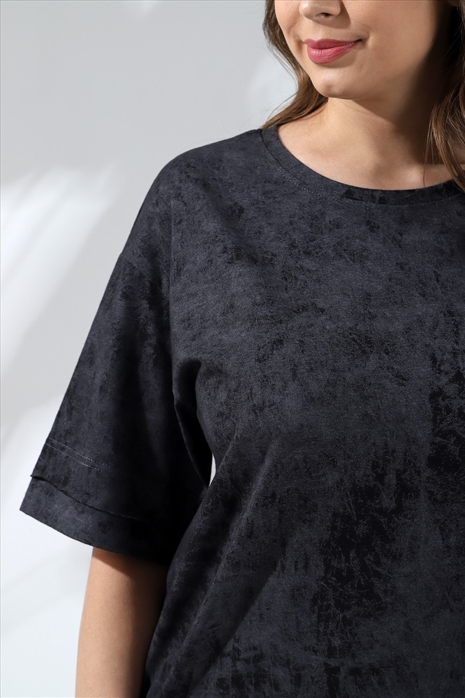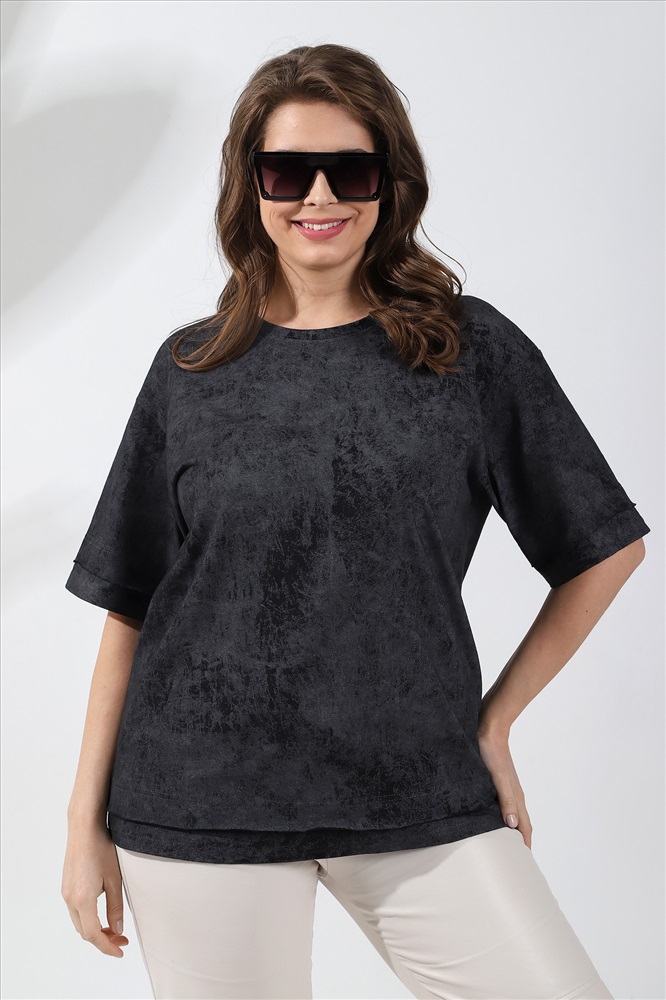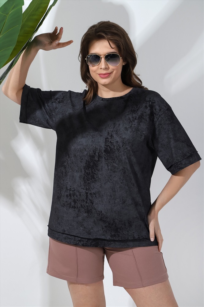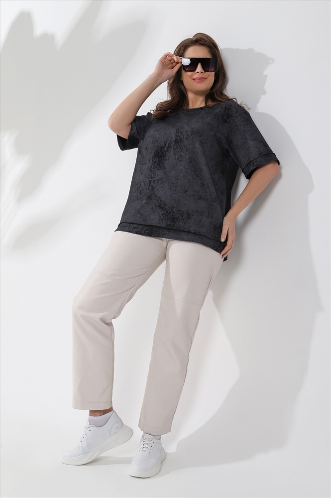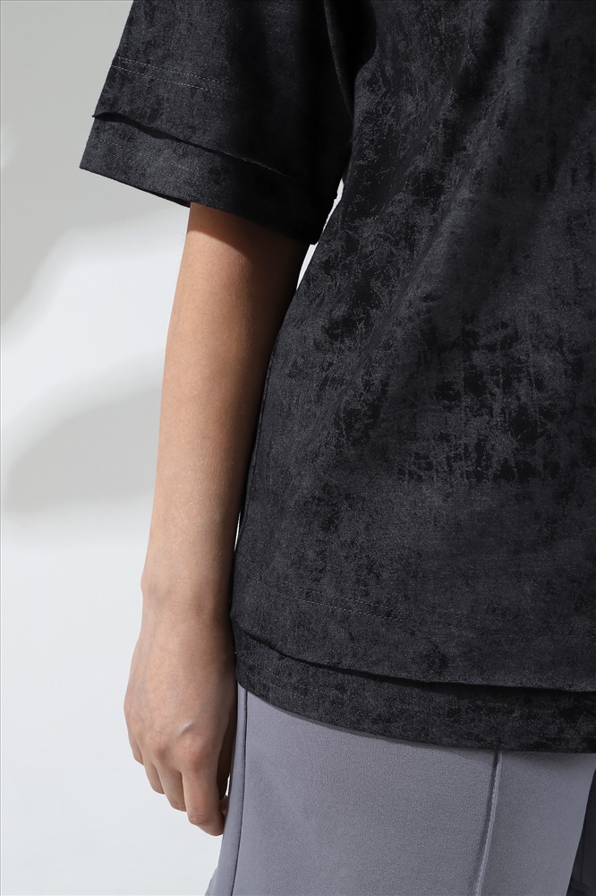Ткань: Кулирка Кулирка - это самое гладкое и тонкое трикотажное полотно из чистого хлопка. С лицевой стороны ткань «кулирка» выглядит как «вертикальные косички», орнамент изнаночной стороны напоминает «кирпичную кладку». Свойства кулирного трикотажа- воздухопроницаемость, гигроскопичность, не теряя своей формы, практически не тянется в длину и хорошо растягивается в ширину, не образует складки. Футболка из гладкокрашеного трикотажного полотна «кулирка» с эффектом «варенки», свободного покроя, горловиной овальной формы, обработанной притачной планкой. Низ рукавов и изделия состоит из двух частей, одна из которых с необработанным краем, другая с подгибкой и соединенных между собой накладным швом.