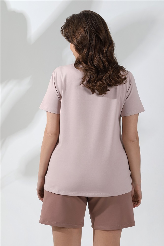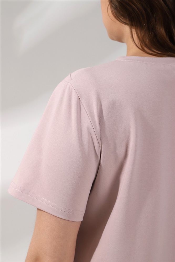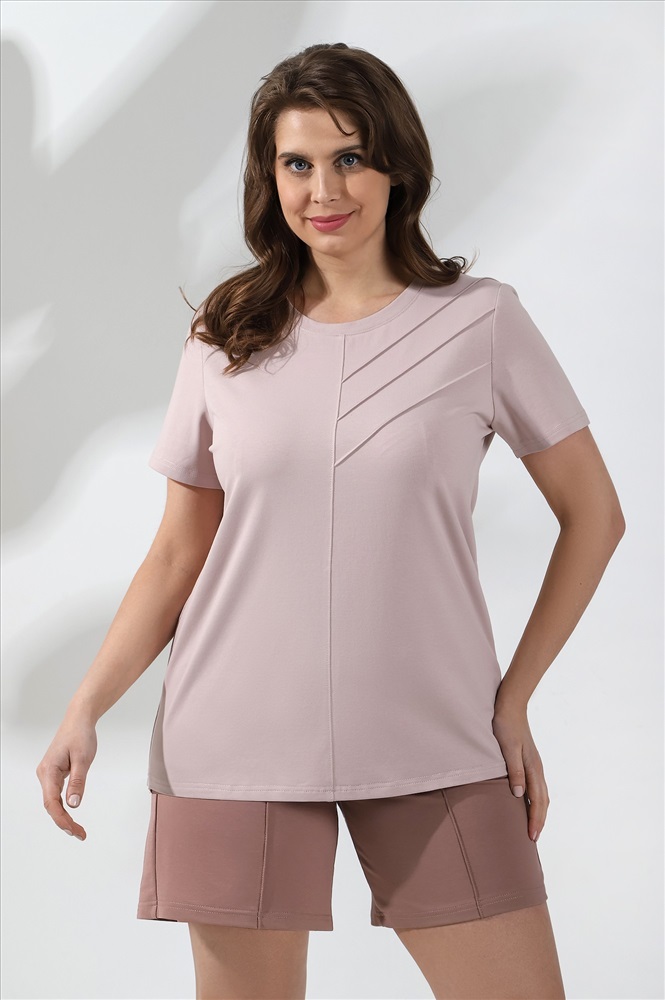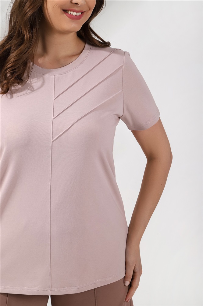Футболка из гладкокрашеного полотна «кулирка», с короткими втачными рукавами, горловиной овальной формы, обработанной втачной планкой. Деталь переда отрезная по центру, на левой половине по диагонали выполнены отделочные строчки – «защипы».