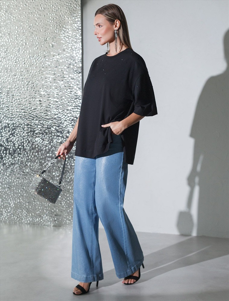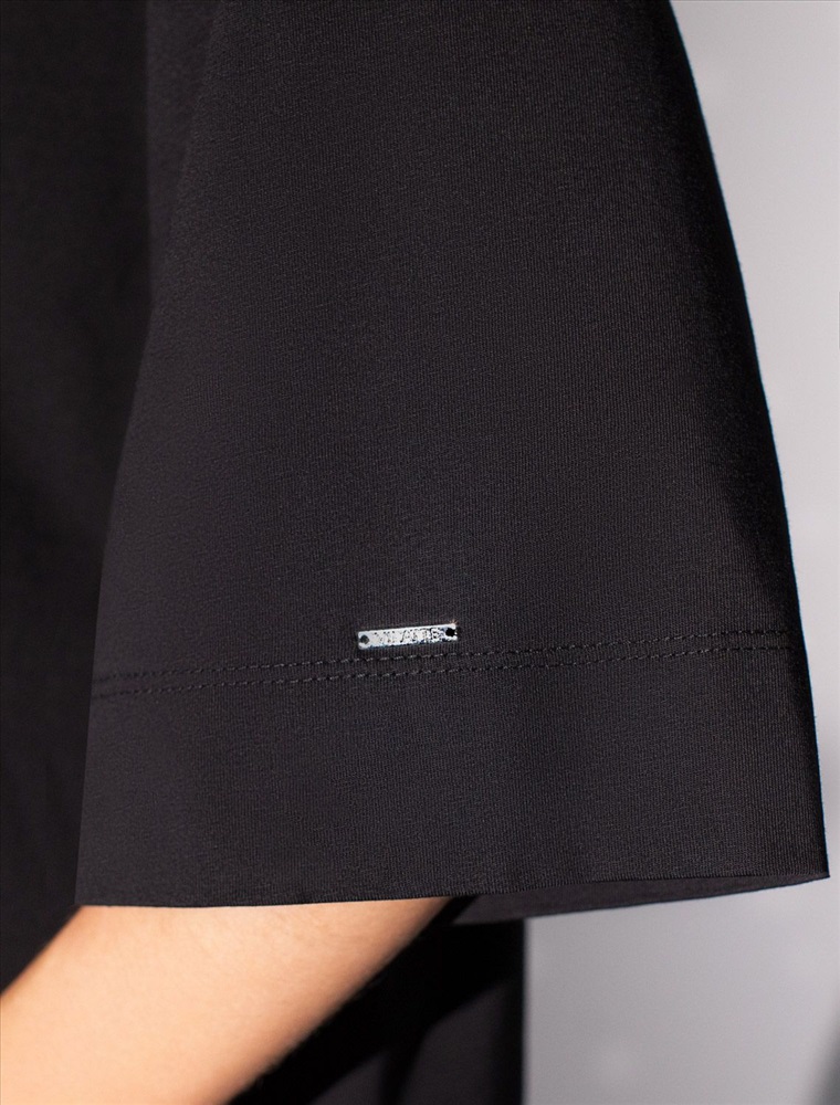 Оверсайз футболка черного цвета из премиального хлопка с добавлением эластана создана для комфорта и стиля каждый день. Натуральный материал приятный к телу, дышащая ткань хорошо держит форму и подходит для повседневной носки дома, в офисе или на прогулке. Классический свободный крой, удлиненный прямой силуэт и свободная посадка делают эту базовую футболку универсальным решением для любой фигуры и роста, включая плюс сайз размеры и беременных девушек, отлично скроет животик. Широкие рукава держат форму и подойдут на полные руки. Нарядная футболка украшена авторским принтом в виде россыпи страз в тон основного полотна, которые создают красивый мерцающий эффект. Такой акцент делает модель уместной как для особых случаев, так и для ежедневных образов.