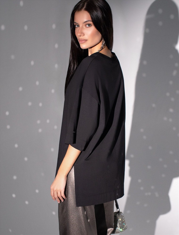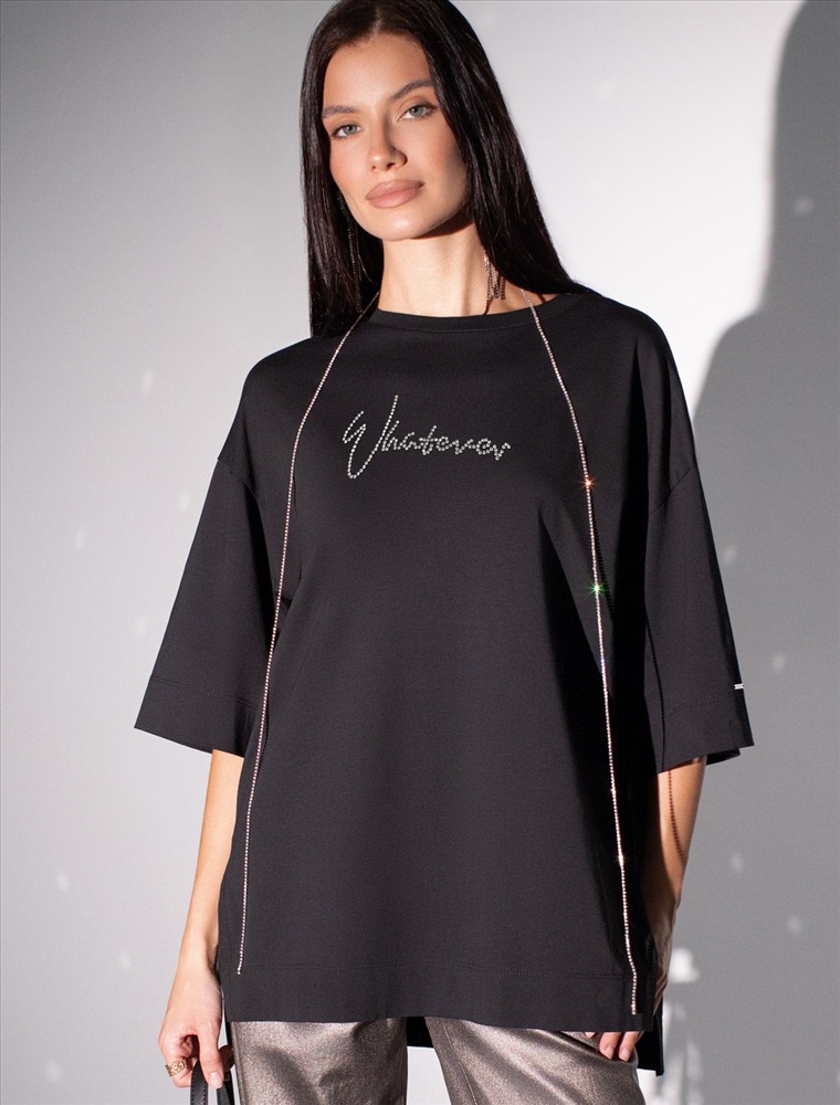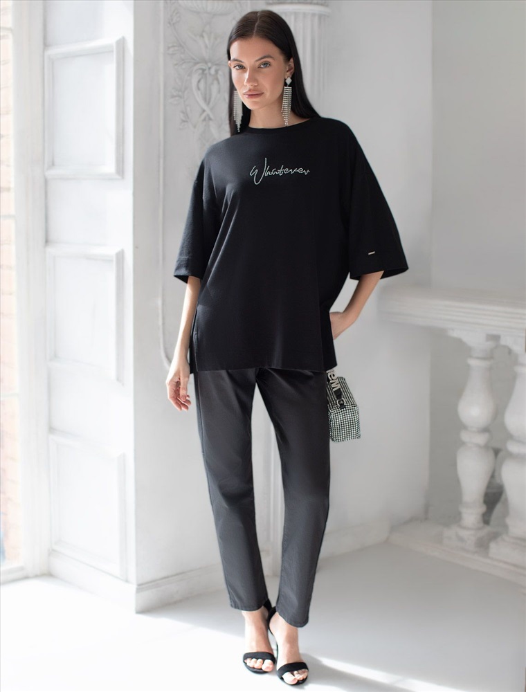 Оверсайз футболка черного цвета из премиального хлопка с добавлением эластана создана для комфорта и стиля каждый день. Натуральный материал приятный к телу, дышащая ткань хорошо держит форму и подходит для повседневной носки дома, в офисе или на прогулке. Классический свободный крой, удлиненный прямой силуэт и свободная посадка делают эту базовую футболку универсальным решением для любой фигуры и роста, включая плюс сайз размеры и беременных девушек, отлично скроет животик. Широкие рукава держат форму и подойдут на полные руки. Нарядная футболка украшена авторским принтом в виде надписи серебристыми стразами, которые создают красивый мерцающий эффект. Перевод надписи Whatever - Что бы ни... Такой акцент делает модель уместной как для особых случаев, так и для ежедневных образов.