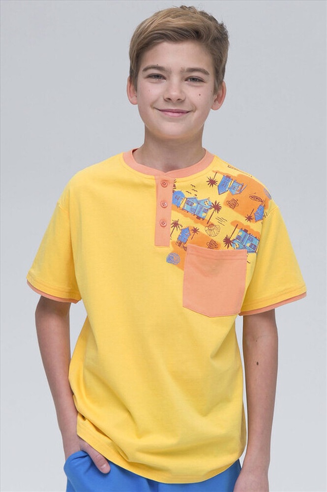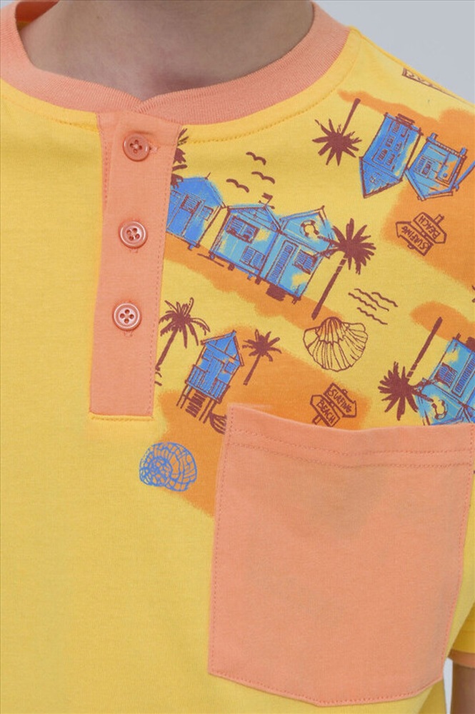 ID товара: 854859 Состав: 100% Хлопок Сезон: Весна/Лето Длина: Средняя Фасон: Прямой Рукав: Короткий Вид застежки: Пуговицы Вырез горловины: Круглый Рисунок: Фантазийный Тип карманов: Накладные Основная ткань: Хлопок Страна бренда: Россия Страна производства: Китай Модная футболка-хенли из 100% хлопка для мальчика. Ткань приятна на ощупь, дышит и обеспечивает ребёнку комфорт. Модель с умеренно свободной посадкой дополнена пуговицами у горловины – её удобно надевать и снимать. На груди небольшой накладной карман. Рукава и горловину украшает контрастная отделка — имитация двухслойности и один из актуальных летних трендов. Футболка декорирована милым летним принтом. Яркий жёлтый цвет выделит вашего ребёнка из толпы. Вы не потеряете его в местах большого скопления людей (в аэропорту или на пляже). Эта модель сделает образ мальчика по-настоящему стильным! Комментарии к товару