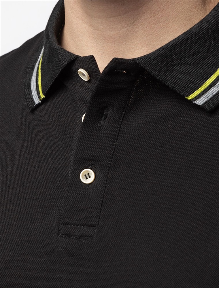 Параметры модели на первом фото: Рост 190, бюст 111, талия 88, бедра 105 Черное прямое поло выполнено из премиального хлопка пике с характерной фактурой, которая обеспечивает эффективную циркуляцию воздуха. Деликатный акцент в модели выполнен в виде плетения контрастных полос на воротнике. Наличие эластана в составе изделия способствует эластичности и меньшей сминаемости. Внизу металлический логотип бренда. Комментарии к товару