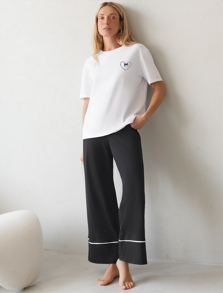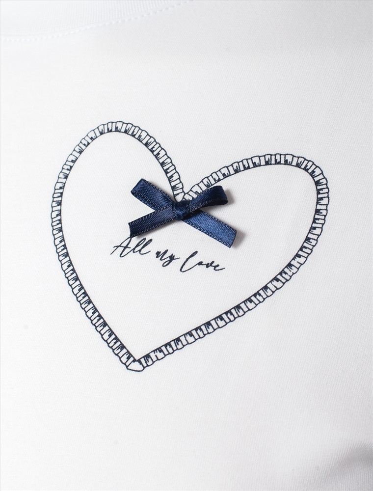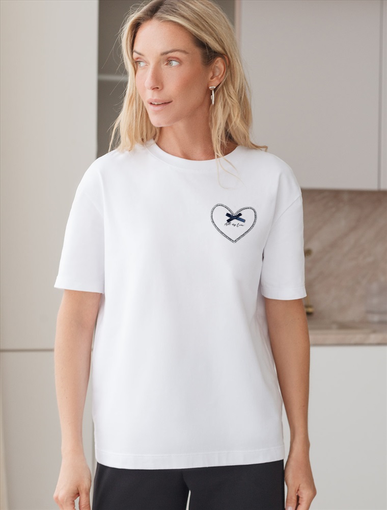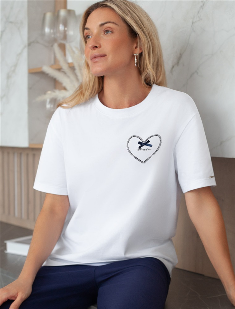Размер товара на первом фото: 42 Футболка белого цвета изготовлена из премиального хлопка с эластаном, она обеспечивает невероятное ощущение уюта и легкости. Натуральный материал сохраняет форму и цвет после множества стирок, обеспечивая долговечность изделия, а его высокая воздухопроницаемость создает ощущение свежести даже в течение долгого дня. Особое внимание привлекает стильный принт в виде сердца с минималистичной надписью, перевод надписи All my love - вся моя любовь. Принт выполненны красками с устойчивым покрытием, который добавляет изделию оригинальности и позволяет выразить индивидуальность. Свободный крой футболки дарит удобство и не стесняет движений, что делает ее идеальной для повседневной носки или активного отдыха, подчеркивает современный взгляд на моду. На рукаве металлический логотип бренда. Подойдет девушкам и женщинам на любую фигуру, вы будете чувствовать себя в ней уверенно и комфортно. Отлично впишется в гардероб благодаря универсальному дизайну, который легко сочетать с джинсами, шортами или спортивными брюками. Комментарии к товару