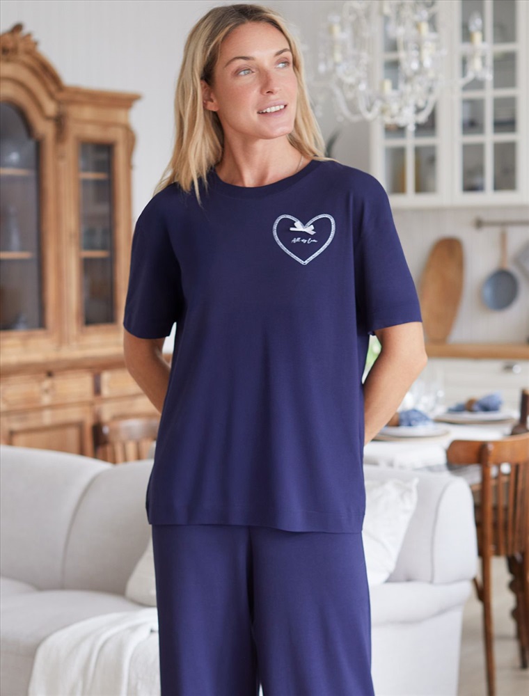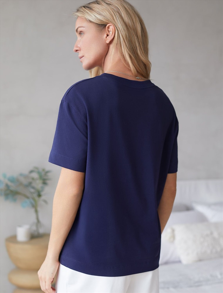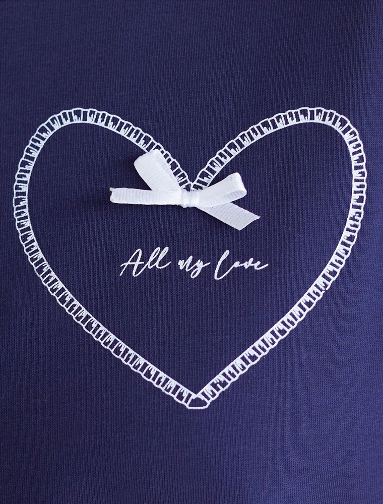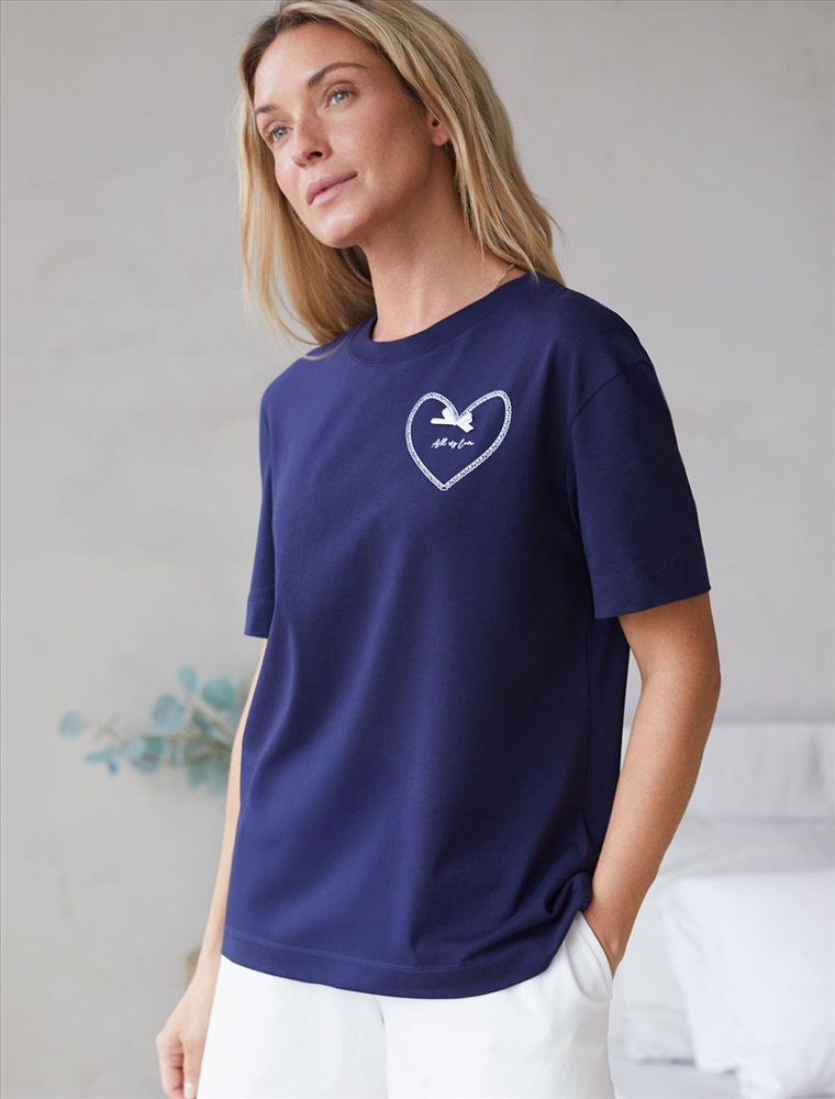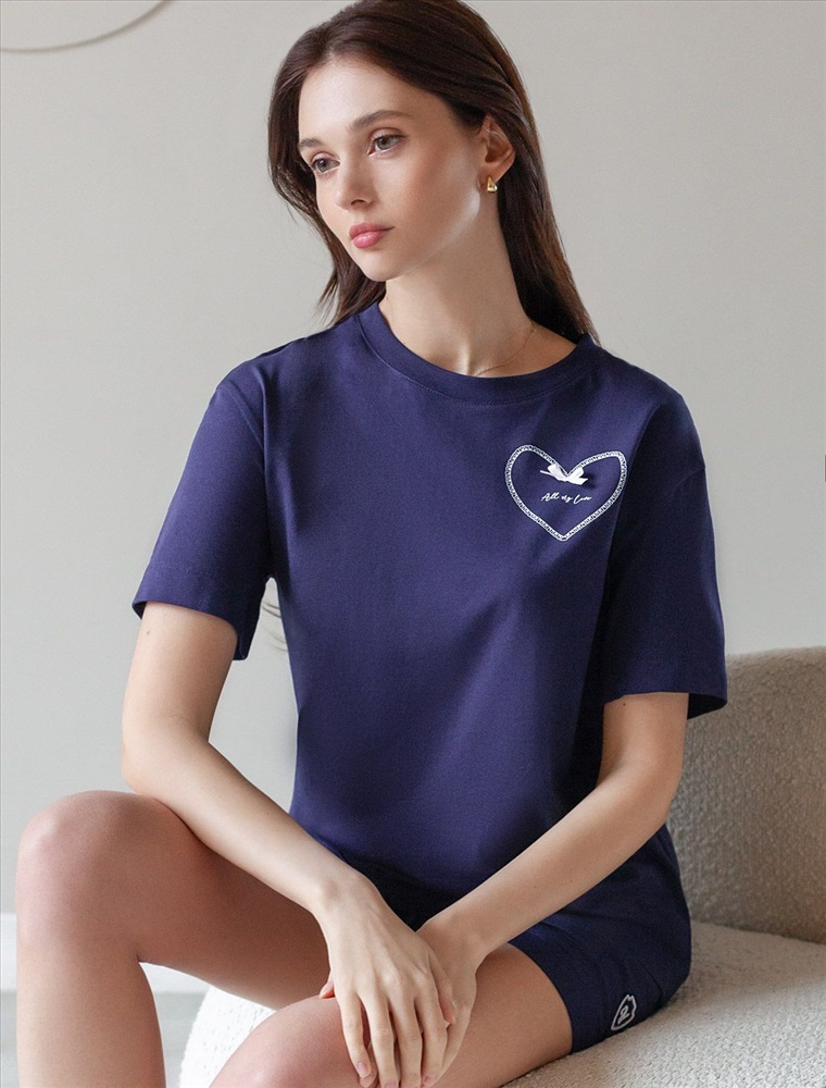 Плотность: 170 Г/м2 Размер товара на первом фото: 42 Футболка темно-синего цвета изготовлена из премиального хлопка с эластаном, она обеспечивает невероятное ощущение уюта и легкости. Натуральный материал сохраняет форму и цвет после множества стирок, обеспечивая долговечность изделия, а его высокая воздухопроницаемость создает ощущение свежести даже в течение долгого дня. Особое внимание привлекает стильный принт в виде сердца с минималистичной надписью, перевод надписи: All my love - вся моя любовь. Принт выполнен красками с устойчивым покрытием, который добавляет изделию оригинальности и позволяет выразить индивидуальность. Свободный крой футболки дарит удобство и не стесняет движений, что делает ее идеальной для повседневной носки или активного отдыха, подчеркивает современный взгляд на моду. На рукаве металлический логотип бренда. Подойдет девушкам и женщинам на любую фигуру, вы будете чувствовать себя в ней уверенно и комфортно. Отлично впишется в гардероб благодаря универсальному дизайну, который легко сочетать с джинсами, шортами или спортивными брюками. Комментарии к товару