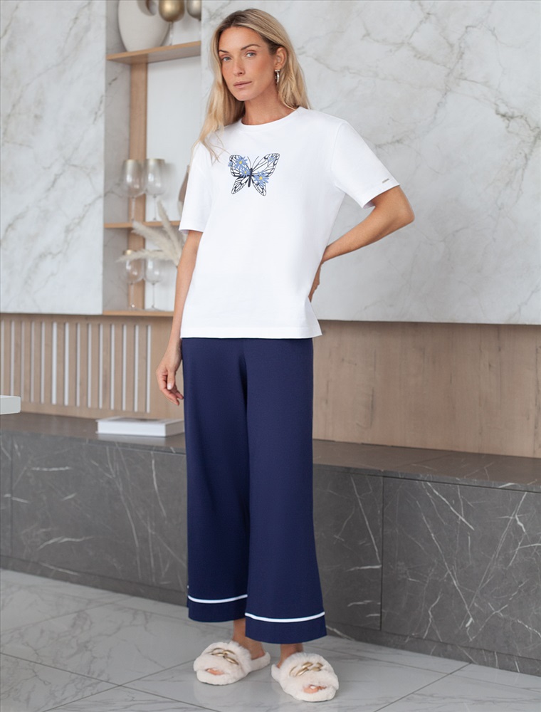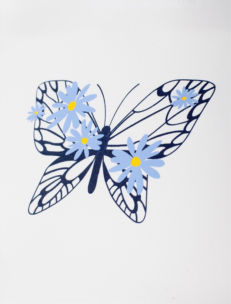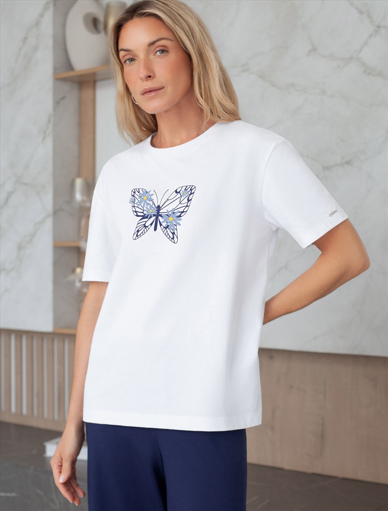 Размер товара на первом фото: 42 Футболка белого цвета изготовлена из премиального хлопка с эластаном, она обеспечивает невероятное ощущение уюта и легкости. Натуральный материал сохраняет форму и цвет после множества стирок, обеспечивая долговечность изделия, а его высокая воздухопроницаемость создает ощущение свежести даже в течение долгого дня. Особое внимание привлекает стильный принт в виде бабочки с цветами. Принт выполнен красками с устойчивым покрытием, который добавляет изделию оригинальности и позволяет выразить индивидуальность. Свободный крой футболки дарит удобство и не стесняет движений, что делает ее идеальной для повседневной носки или активного отдыха, подчеркивает современный взгляд на моду. На рукаве металлический логотип бренда. Подойдет девушкам и женщинам на любую фигуру, вы будете чувствовать себя в ней уверенно и комфортно. Отлично впишется в гардероб благодаря универсальному дизайну, который легко сочетать с джинсами, шортами или спортивными брюками. Комментарии к товару