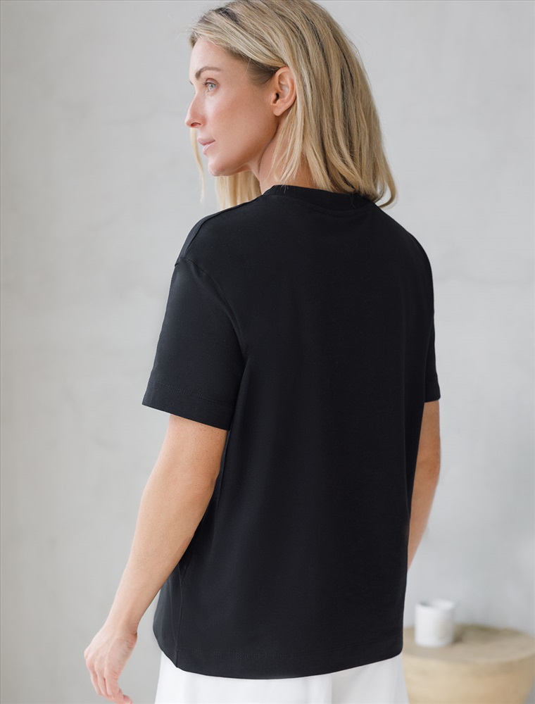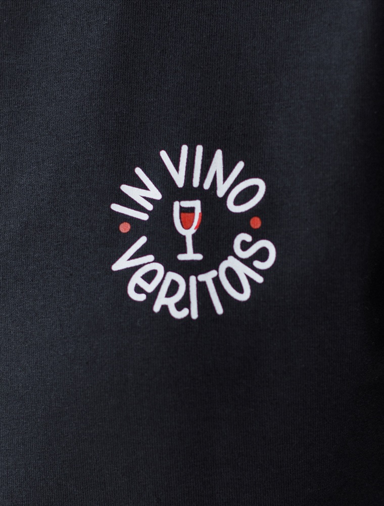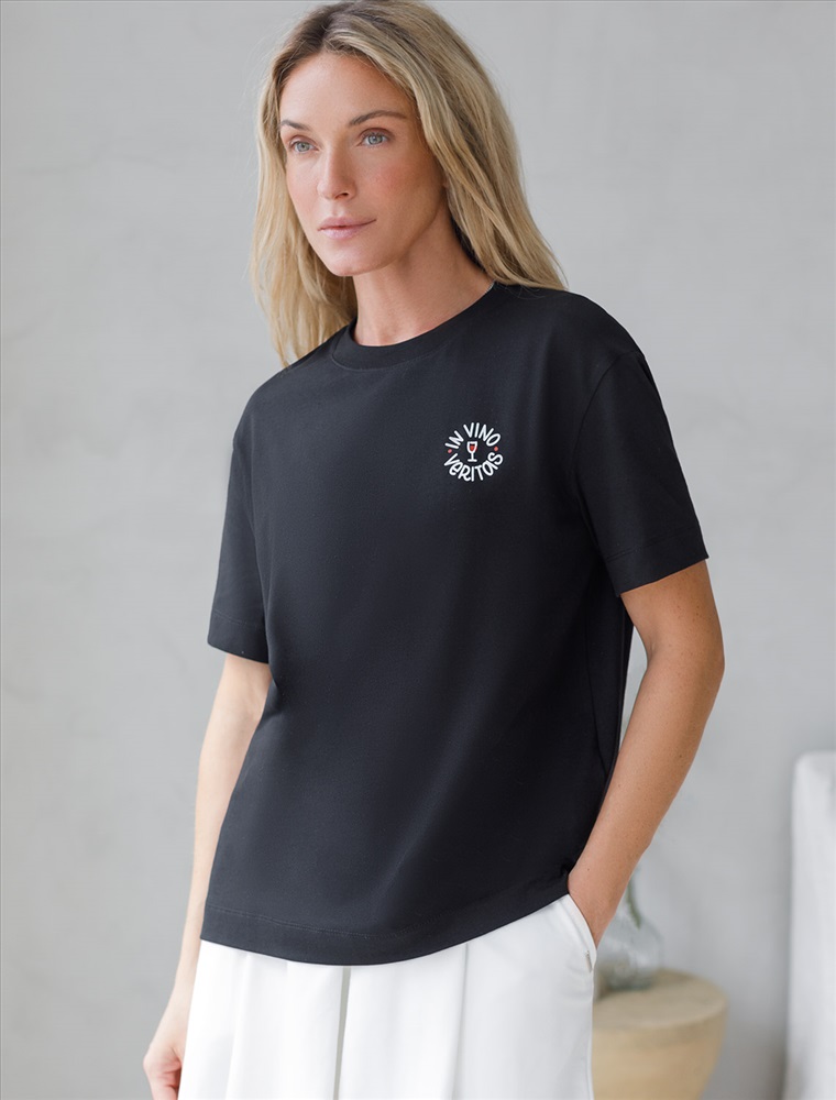 Размер товара на первом фото: 42 Футболка черного цвета изготовлена из премиального хлопка с эластаном, она обеспечивает невероятное ощущение уюта и легкости. Натуральный материал сохраняет форму и цвет после множества стирок, обеспечивая долговечность изделия, а его высокая воздухопроницаемость создает ощущение свежести даже в течение долгого дня. Особое внимание привлекает стильный принт в виде бокала с минималистичной надписью. Перевод надписи: In vino veritas - Приходит вино - уходит истина. Принт выполнен красками с устойчивым покрытием, который добавляет изделию оригинальности и позволяет выразить индивидуальность. Свободный крой футболки дарит удобство и не стесняет движений, что делает ее идеальной для повседневной носки или активного отдыха, подчеркивает современный взгляд на моду. На рукаве металлический логотип бренда. Подойдет девушкам и женщинам на любую фигуру, вы будете чувствовать себя в ней уверенно и комфортно. Отлично впишется в гардероб благодаря универсальному дизайну, который легко сочетать с джинсами, шортами или спортивными брюками. Комментарии к товару