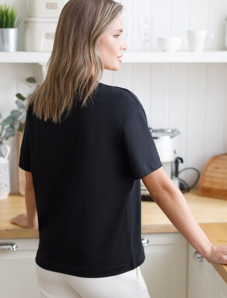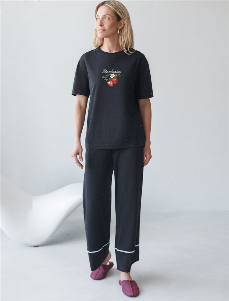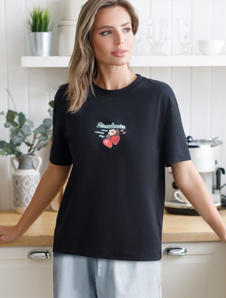 Размер товара на первом фото: 42 Футболка черного цвета изготовлена из премиального хлопка с эластаном, она обеспечивает невероятное ощущение уюта и легкости. Натуральный материал сохраняет форму и цвет после множества стирок, обеспечивая долговечность изделия, а его высокая воздухопроницаемость создает ощущение свежести даже в течение долгого дня. Особое внимание привлекает стильный принт в виде клубники с минималистичной надписью. Перевод надписи: Strawberries sweet summer days - Клубничные сладкие летние дни. Принт выполненны красками с устойчивым покрытием, который добавляет изделию оригинальности и позволяет выразить индивидуальность. Свободный крой футболки дарит удобство и не стесняет движений, что делает ее идеальной для повседневной носки или активного отдыха, подчеркивает современный взгляд на моду. На рукаве металлический логотип бренда. Подойдет девушкам и женщинам на любую фигуру, вы будете чувствовать себя в ней уверенно и комфортно. Отлично впишется в гардероб благодаря универсальному дизайну, который легко сочетать с джинсами, шортами или спортивными брюками.