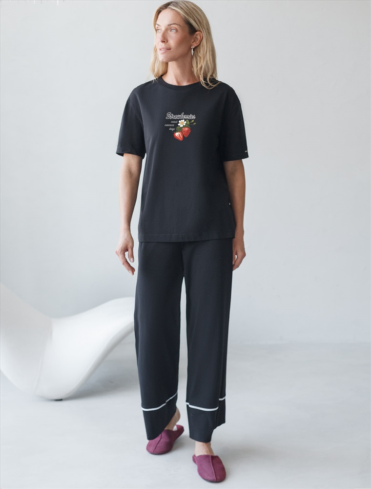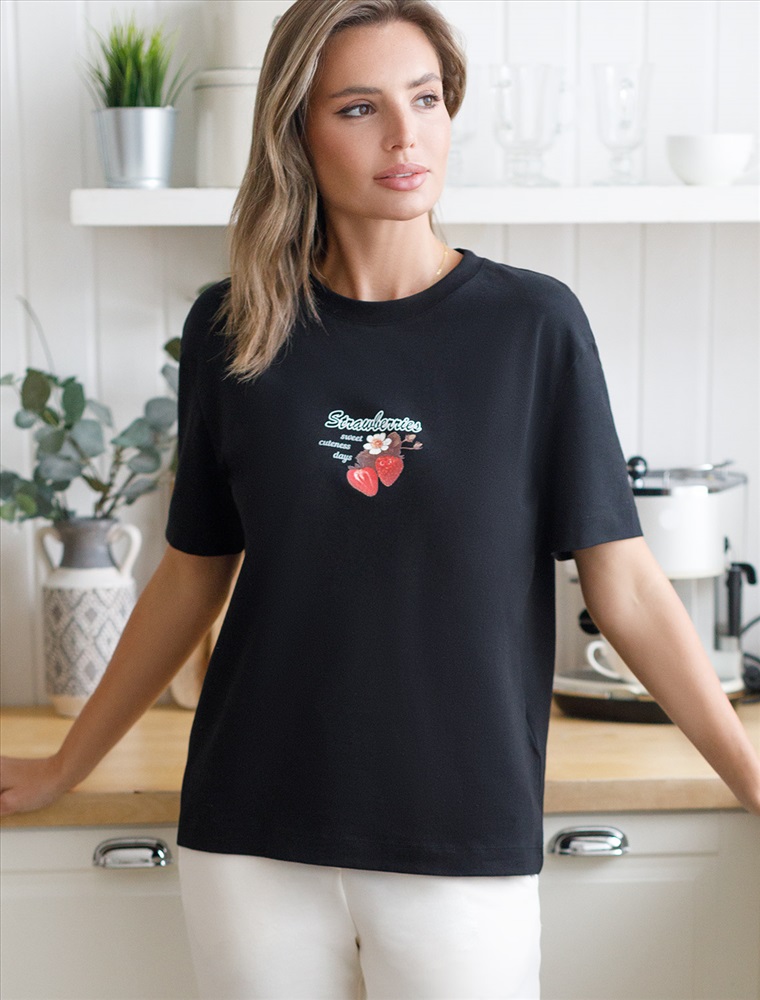 Размер товара на первом фото: 42 Футболка черного цвета изготовлена из премиального хлопка с эластаном, она обеспечивает невероятное ощущение уюта и легкости. Натуральный материал сохраняет форму и цвет после множества стирок, обеспечивая долговечность изделия, а его высокая воздухопроницаемость создает ощущение свежести даже в течение долгого дня. Особое внимание привлекает стильный принт в виде клубники с минималистичной надписью. Перевод надписи: Strawberries sweet summer days - Клубничные сладкие летние дни. Принт выполненны красками с устойчивым покрытием, который добавляет изделию оригинальности и позволяет выразить индивидуальность. Свободный крой футболки дарит удобство и не стесняет движений, что делает ее идеальной для повседневной носки или активного отдыха, подчеркивает современный взгляд на моду. На рукаве металлический логотип бренда. Подойдет девушкам и женщинам на любую фигуру, вы будете чувствовать себя в ней уверенно и комфортно. Отлично впишется в гардероб благодаря универсальному дизайну, который легко сочетать с джинсами, шортами или спортивными брюками. Комментарии к товару