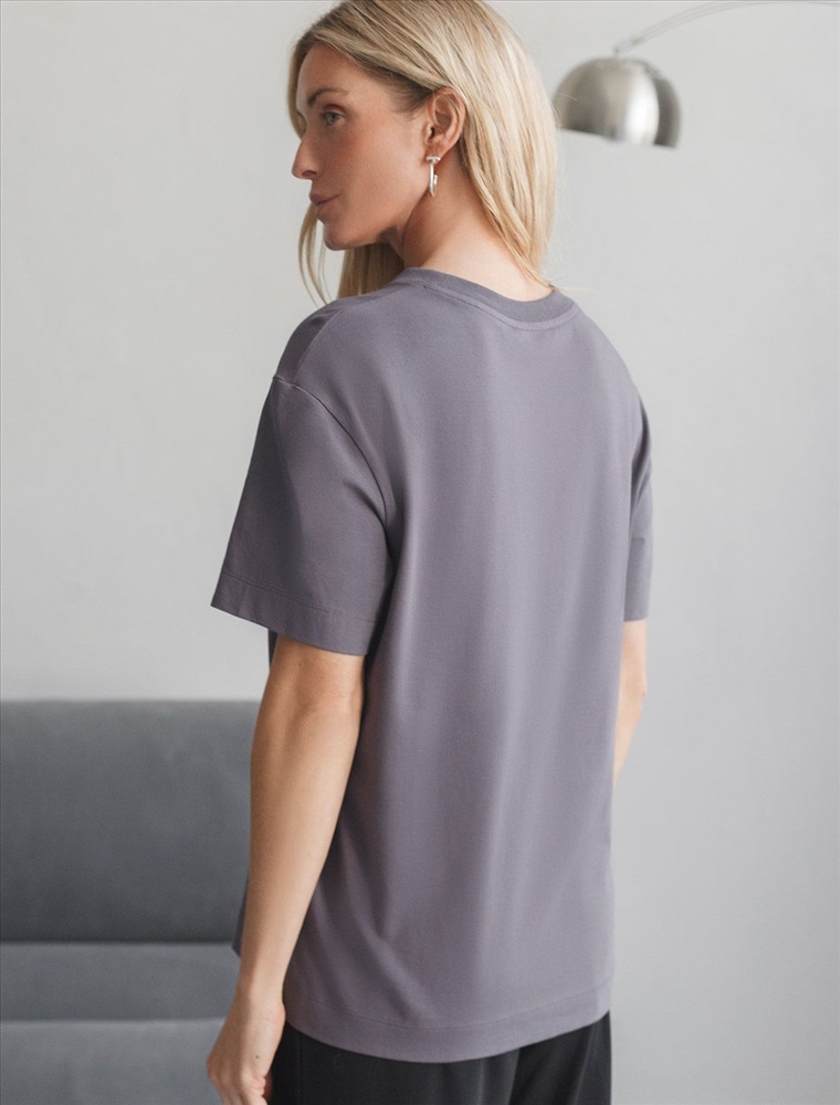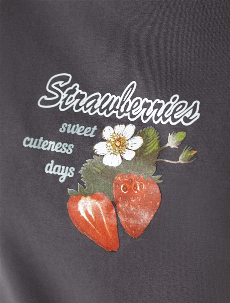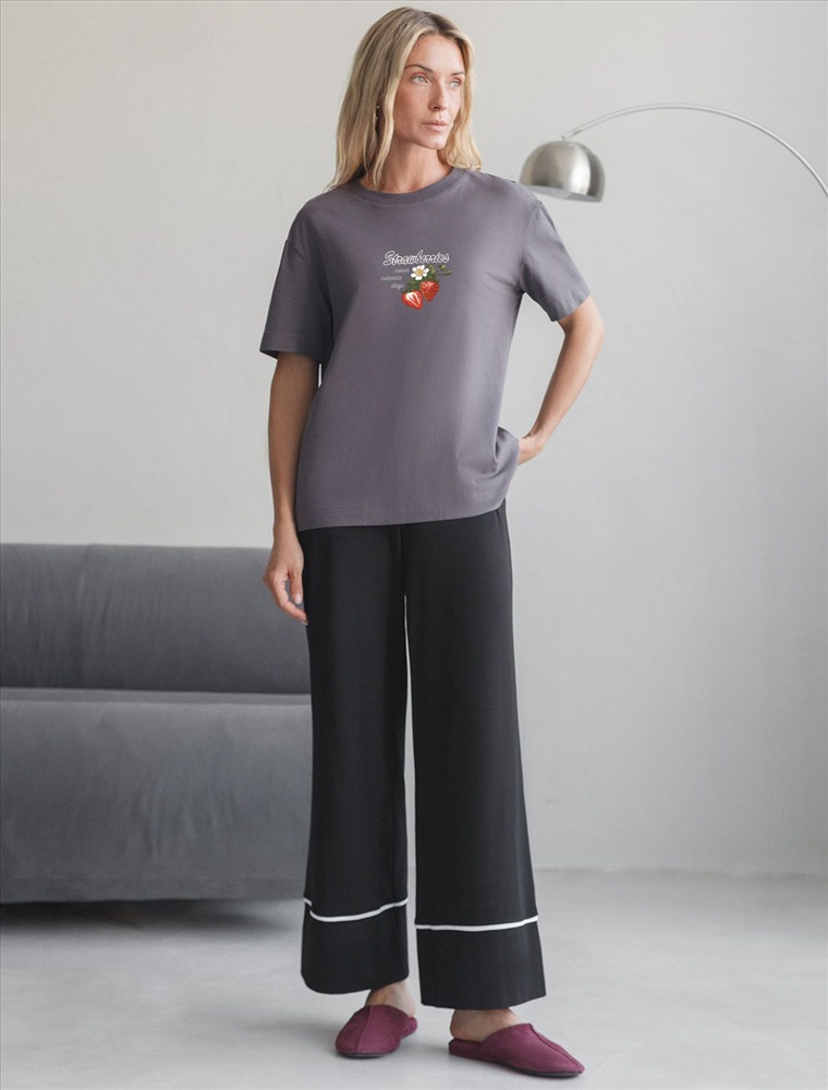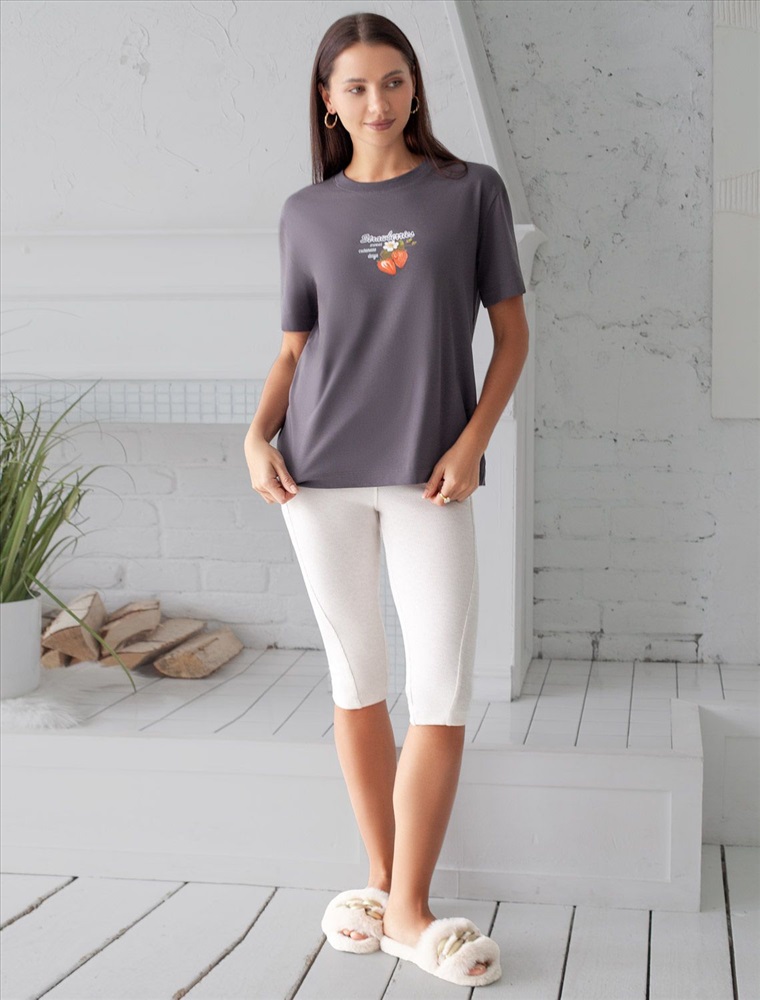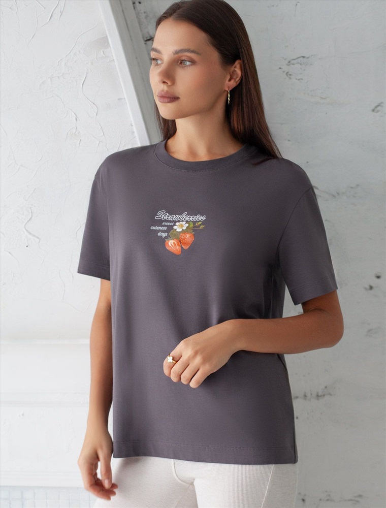 Размер товара на первом фото: 42 Футболка темно-серого цвета изготовлена из премиального хлопка с эластаном, она обеспечивает невероятное ощущение уюта и легкости. Натуральный материал сохраняет форму и цвет после множества стирок, обеспечивая долговечность изделия, а его высокая воздухопроницаемость создает ощущение свежести даже в течение долгого дня. Особое внимание привлекает стильный принт в виде клубники с минималистичной надписью. Перевод надписи: Strawberries sweet summer days - Клубничные сладкие летние дни. Принт выполненны красками с устойчивым покрытием, который добавляет изделию оригинальности и позволяет выразить индивидуальность. Свободный крой футболки дарит удобство и не стесняет движений, что делает ее идеальной для повседневной носки или активного отдыха, подчеркивает современный взгляд на моду. На рукаве металлический логотип бренда. Подойдет девушкам и женщинам на любую фигуру, вы будете чувствовать себя в ней уверенно и комфортно. Отлично впишется в гардероб благодаря универсальному дизайну, который легко сочетать с джинсами, шортами или спортивными брюками.