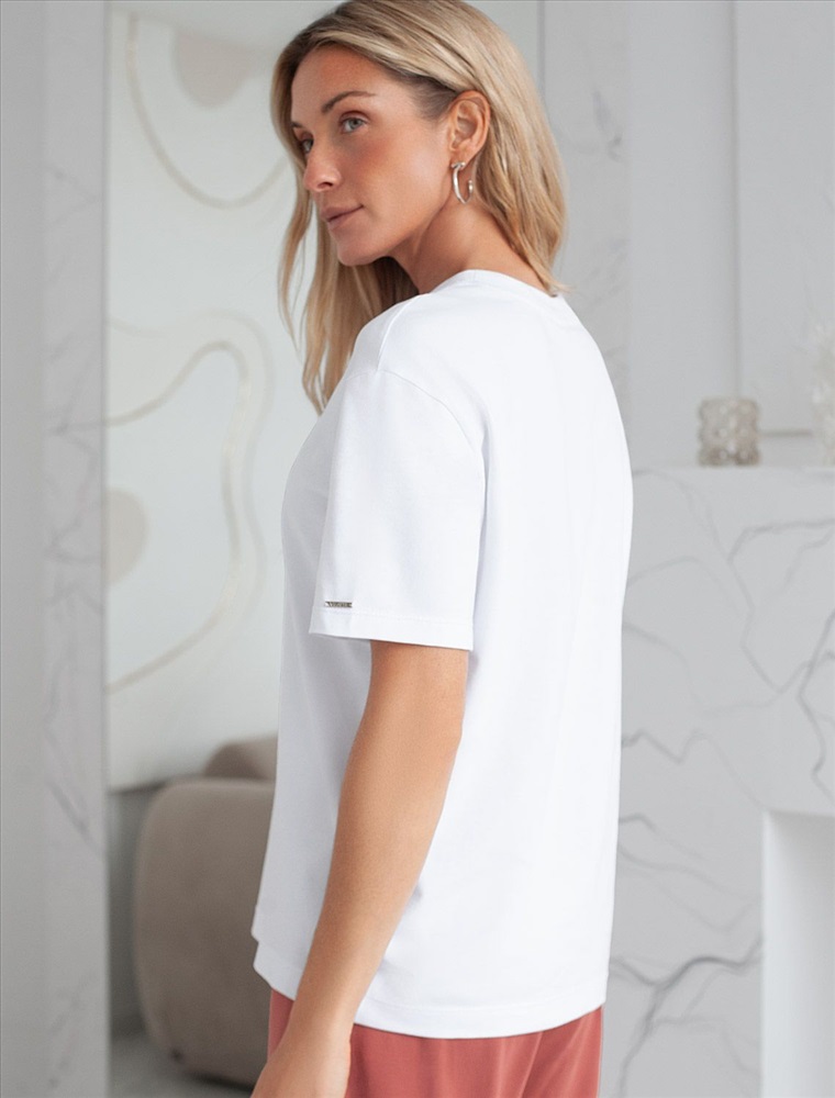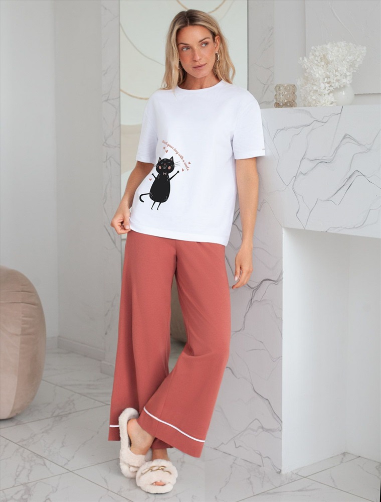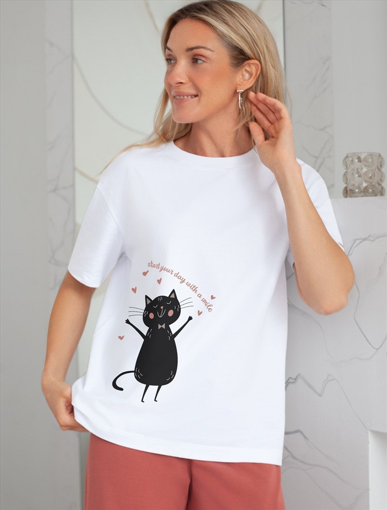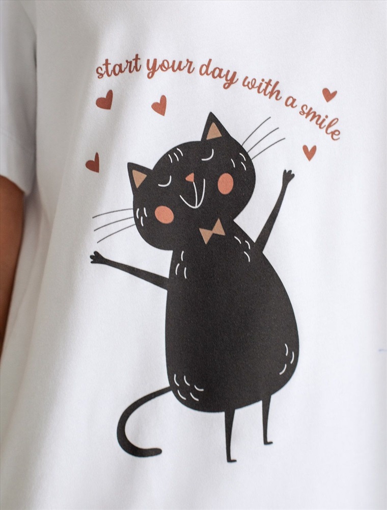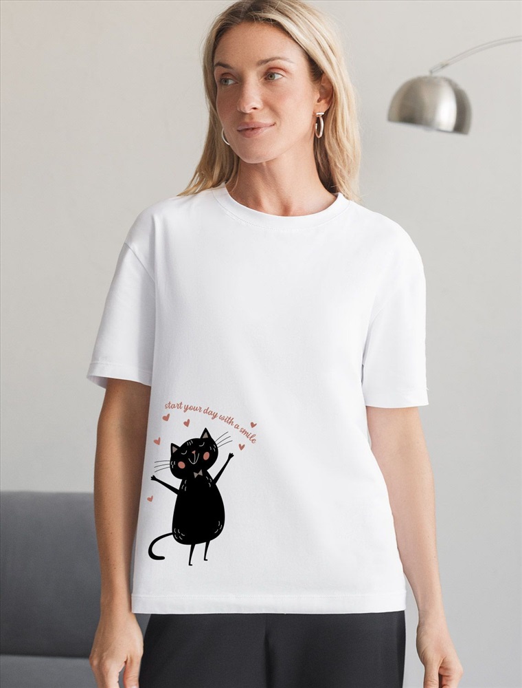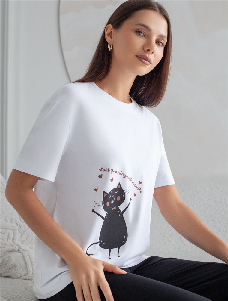 Размер товара на первом фото: 42 Футболка белого цвета изготовлена из премиального хлопка с эластаном, она обеспечивает невероятное ощущение уюта и легкости. Натуральный материал сохраняет форму и цвет после множества стирок, обеспечивая долговечность изделия, а его высокая воздухопроницаемость создает ощущение свежести даже в течение долгого дня. Особое внимание привлекает стильный принт в виде кота и сердечек с минималистичной надписью. Перевод надписи Start your day with a smile - Начни свой день с улыбки. Принт выполненны красками с устойчивым покрытием, который добавляет изделию оригинальности и позволяет выразить индивидуальность. Свободный крой футболки дарит удобство и не стесняет движений, что делает ее идеальной для повседневной носки или активного отдыха, подчеркивает современный взгляд на моду. На рукаве металлический логотип бренда. Подойдет девушкам и женщинам на любую фигуру, вы будете чувствовать себя в ней уверенно и комфортно. Отлично впишется в гардероб благодаря универсальному дизайну, который легко сочетать с джинсами, шортами или спортивными брюками. Комментарии к товару