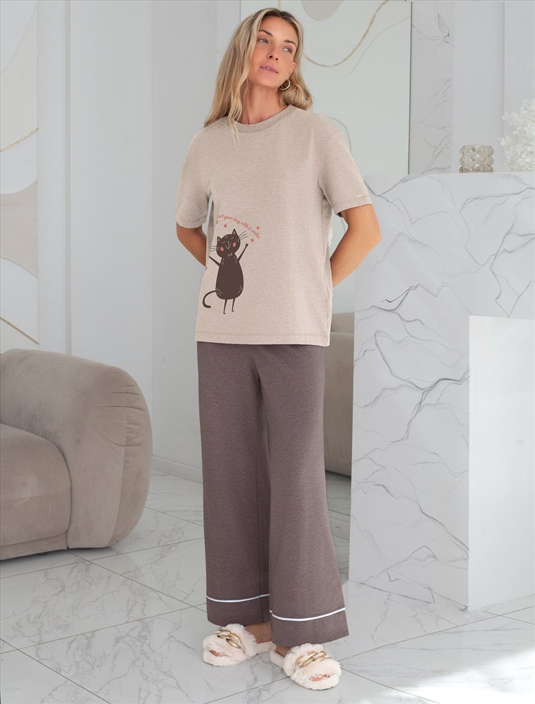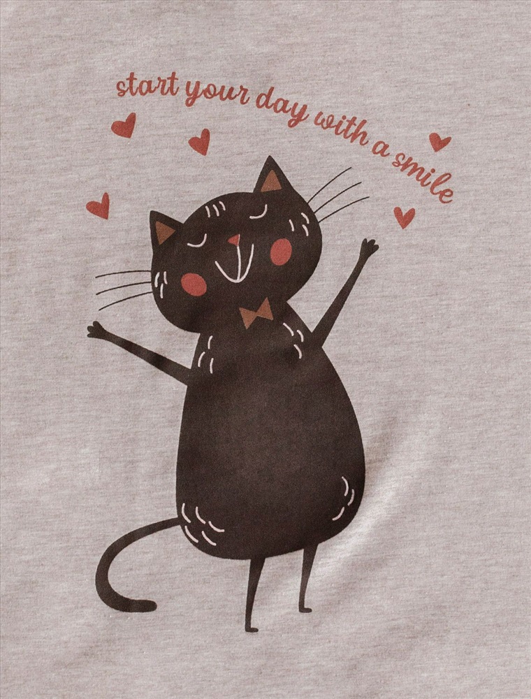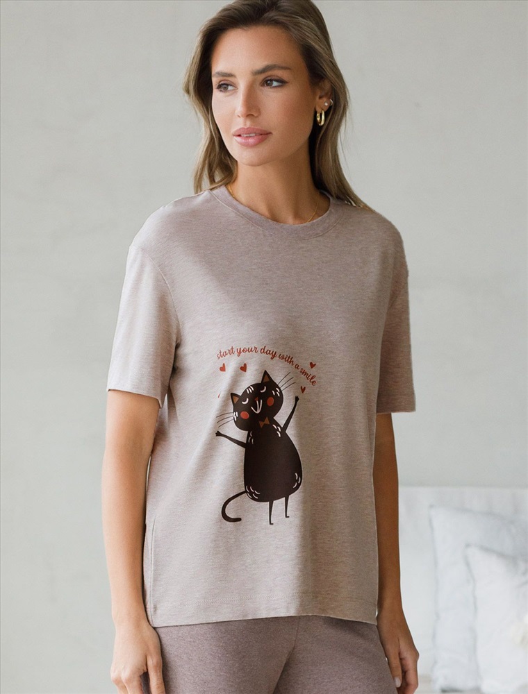 Размер товара на первом фото: 42 Футболка кофейного цвета изготовлена из премиального хлопка с эластаном, она обеспечивает невероятное ощущение уюта и легкости. Натуральный материал сохраняет форму и цвет после множества стирок, обеспечивая долговечность изделия, а его высокая воздухопроницаемость создает ощущение свежести даже в течение долгого дня. Особое внимание привлекает стильный принт в виде кота и сердечек с минималистичной надписью. Перевод надписи Start your day with a smile - Начни свой день с улыбки. Принт выполненны красками с устойчивым покрытием, который добавляет изделию оригинальности и позволяет выразить индивидуальность. Свободный крой футболки дарит удобство и не стесняет движений, что делает ее идеальной для повседневной носки или активного отдыха, подчеркивает современный взгляд на моду. На рукаве металлический логотип бренда. Подойдет девушкам и женщинам на любую фигуру, вы будете чувствовать себя в ней уверенно и комфортно. Отлично впишется в гардероб благодаря универсальному дизайну, который легко сочетать с джинсами, шортами или спортивными брюками. Комментарии к товару