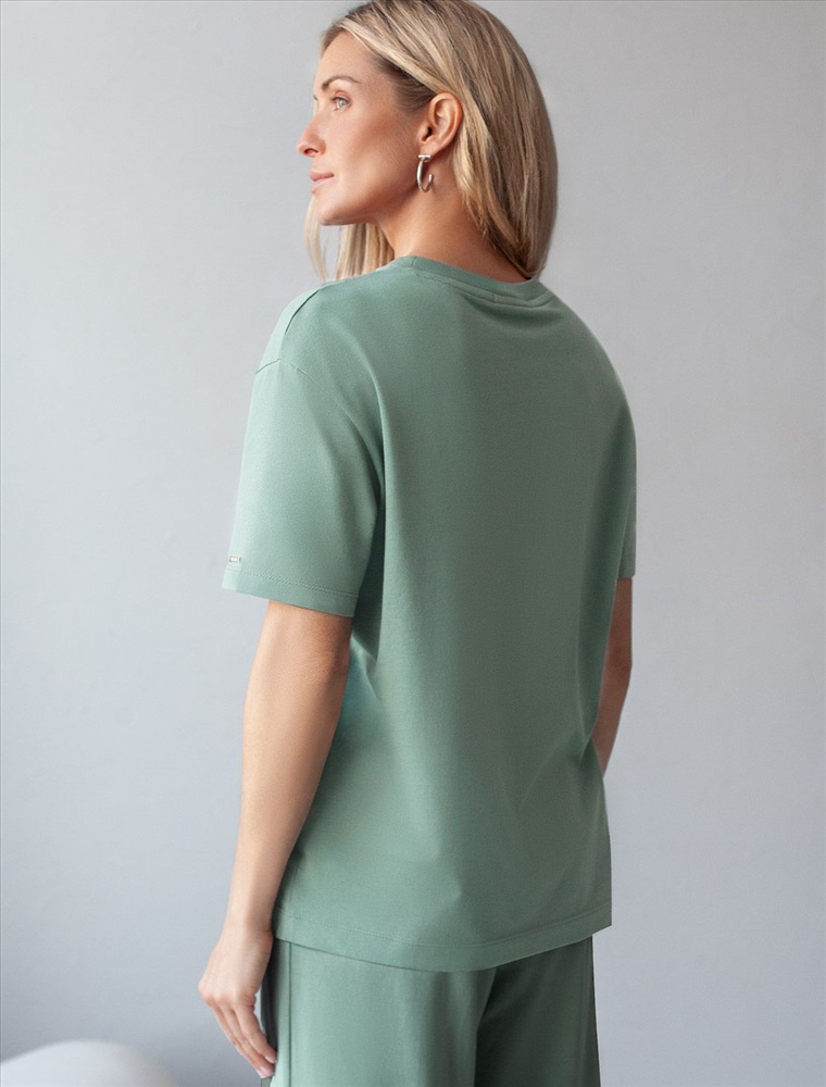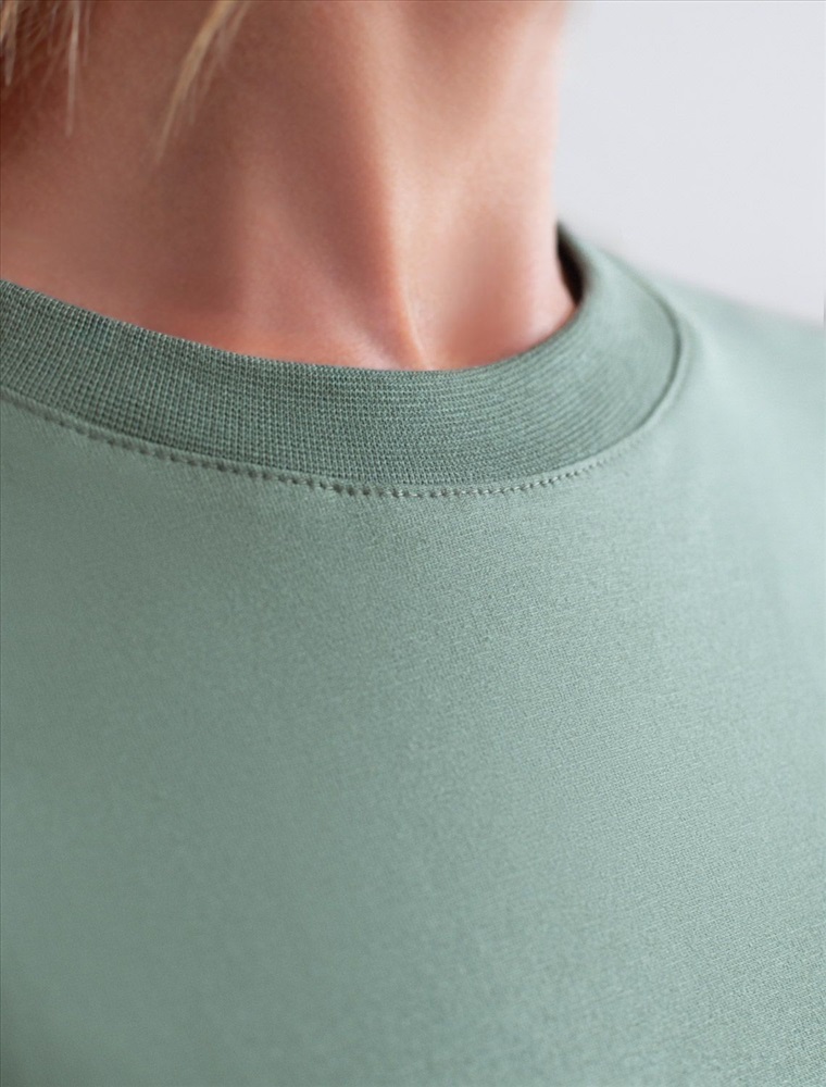 Футболка светло-оливкового цвета изготовлена из премиального хлопка с эластаном, она обеспечивает невероятное ощущение уюта и легкости. Натуральный материал сохраняет форму и цвет после множества стирок, обеспечивая долговечность изделия, а его высокая воздухопроницаемость создает ощущение свежести даже в течение долгого дня.