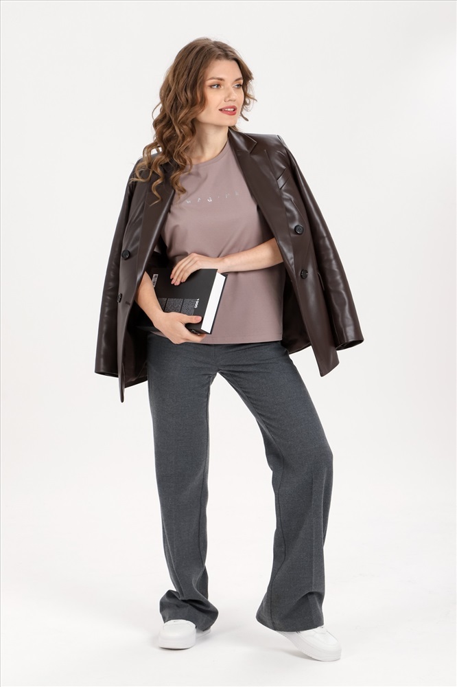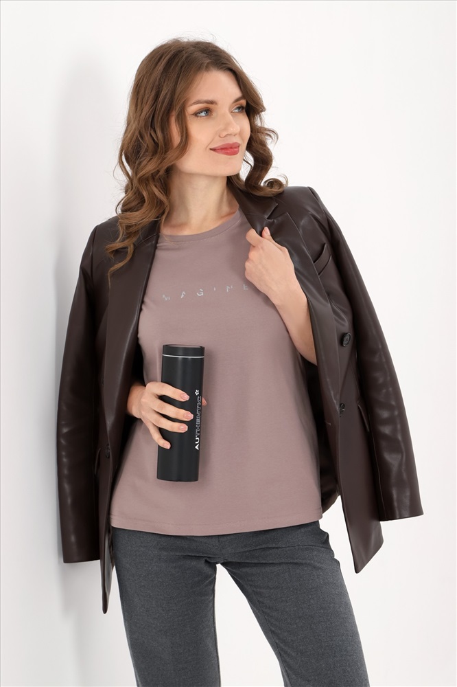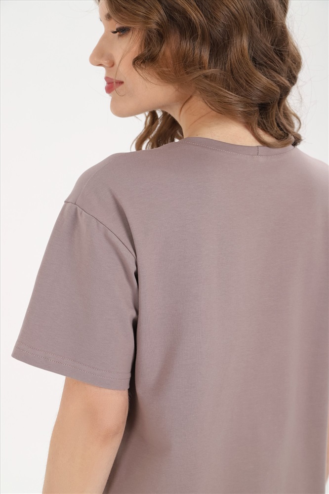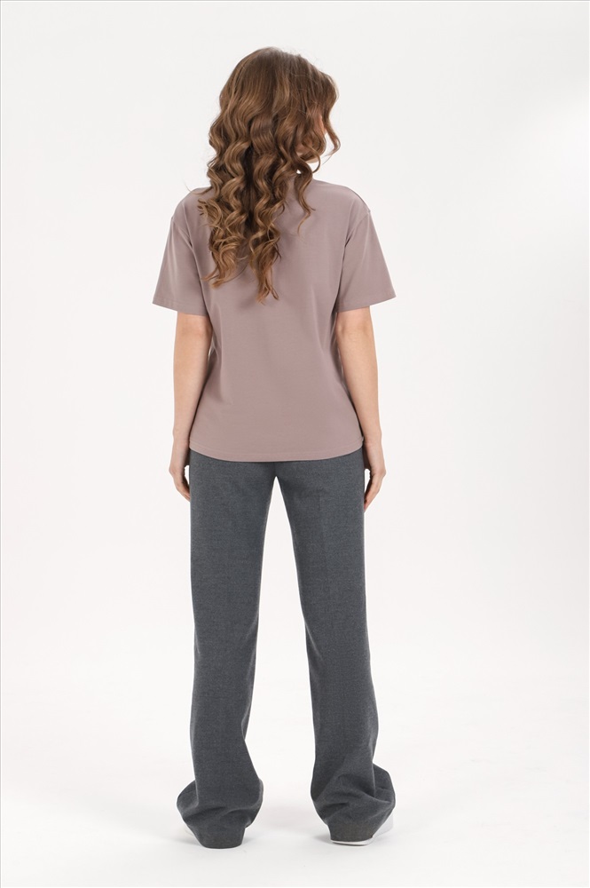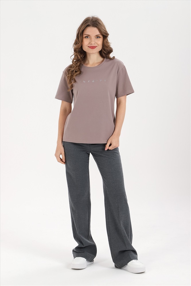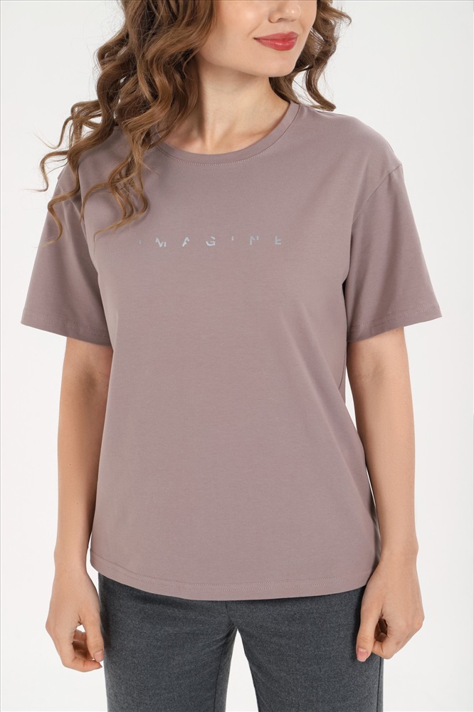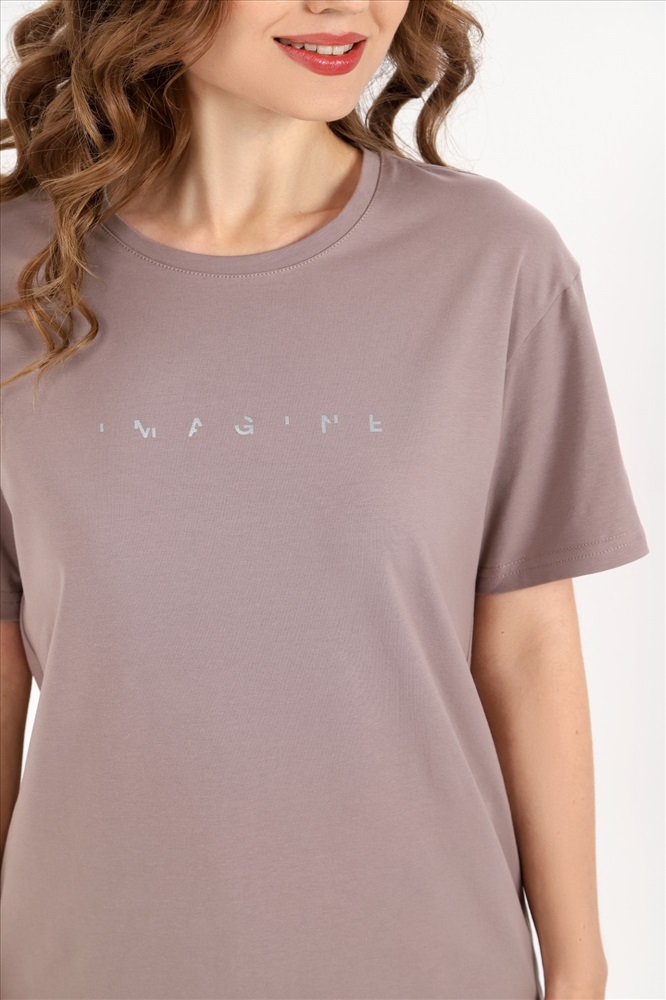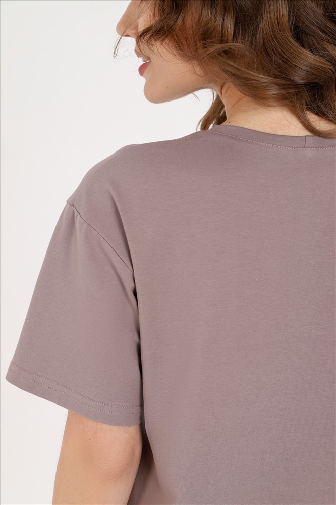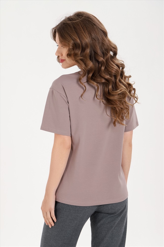 Футболка из гладкокрашеного трикотажного полотна «кулирка с лайкрой» классического покроя, с короткими втачными рукавами, горловиной овальной формы, обработанной втачной планкой и принтом на полочке, выполненным методом « шелкографии».