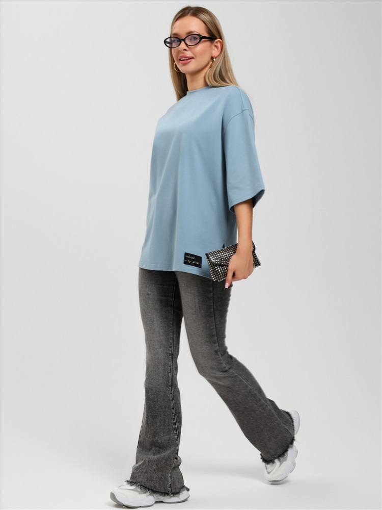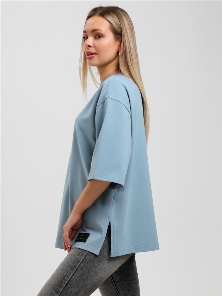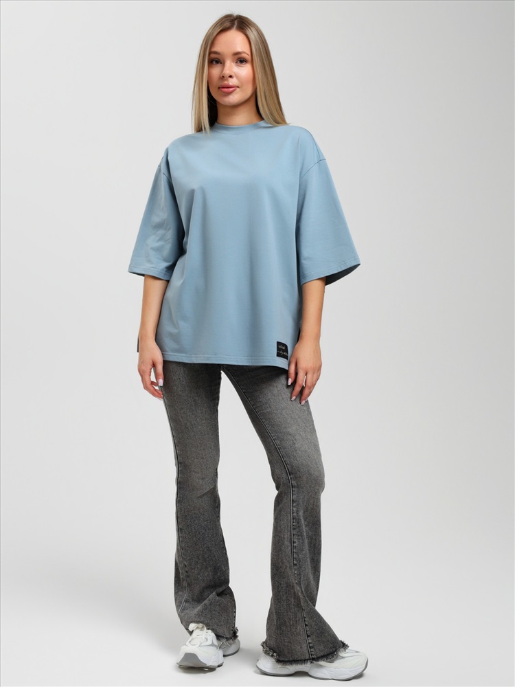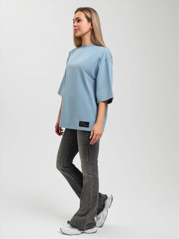 Ткань: Кулирка с лайкрой Футболка молодежная из гладкокрашенного полотна «кулирка с лайкрой», свободного покроя, со спущенной линией плеча, втачными рукавами длиной до локтя, горловиной овальной формы, обработанной втачной планкой. Изделие дополнено декоративной нашивкой, в боковых швах выполнены разрезы.