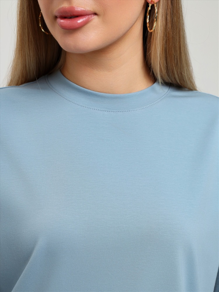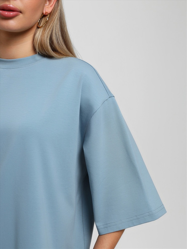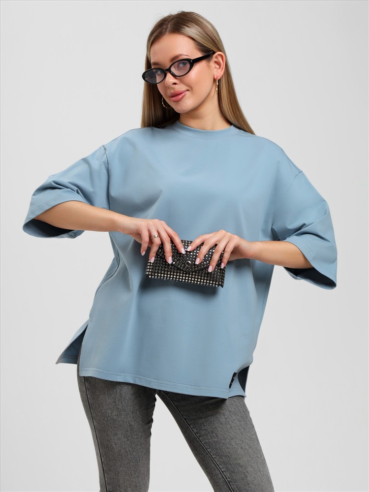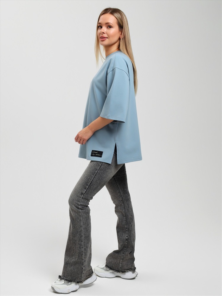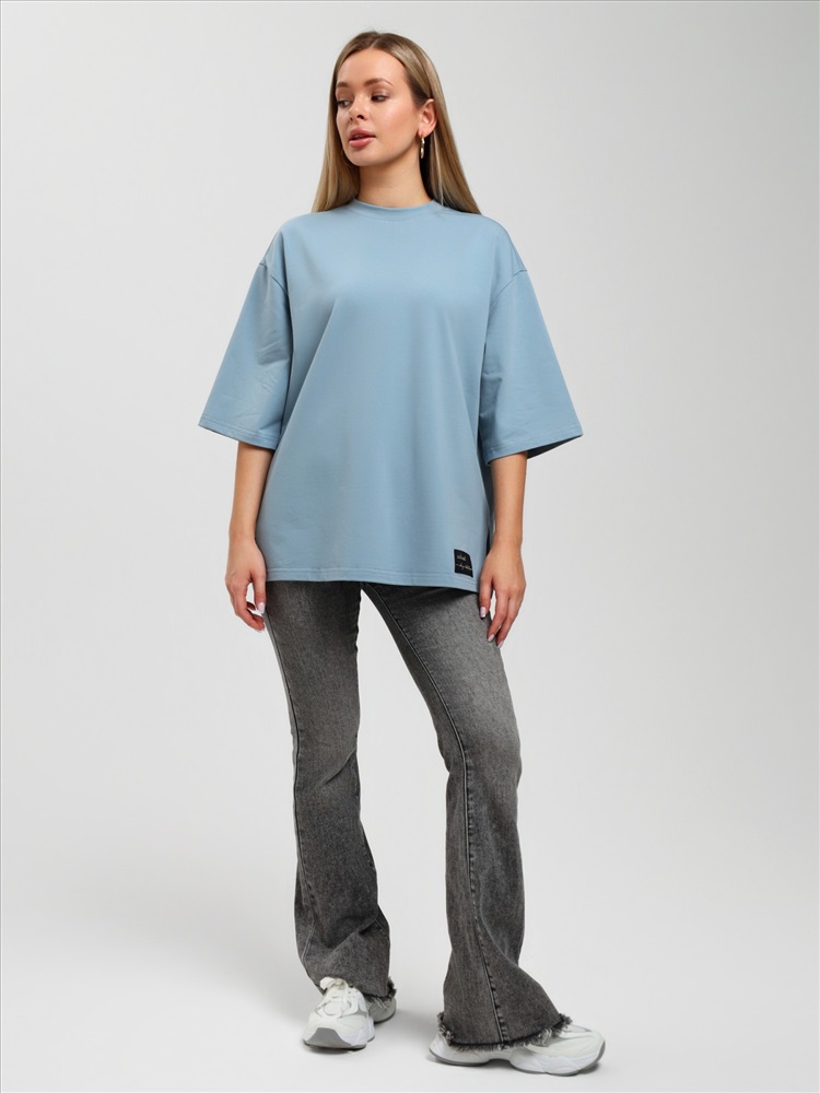 Ткань: Кулирка с лайкрой Футболка молодежная из гладкокрашенного полотна «кулирка с лайкрой», свободного покроя, со спущенной линией плеча, втачными рукавами длиной до локтя, горловиной овальной формы, обработанной втачной планкой. Изделие дополнено декоративной нашивкой, в боковых швах выполнены разрезы.