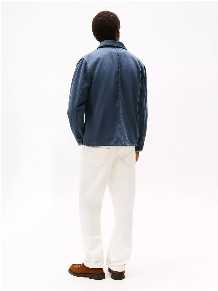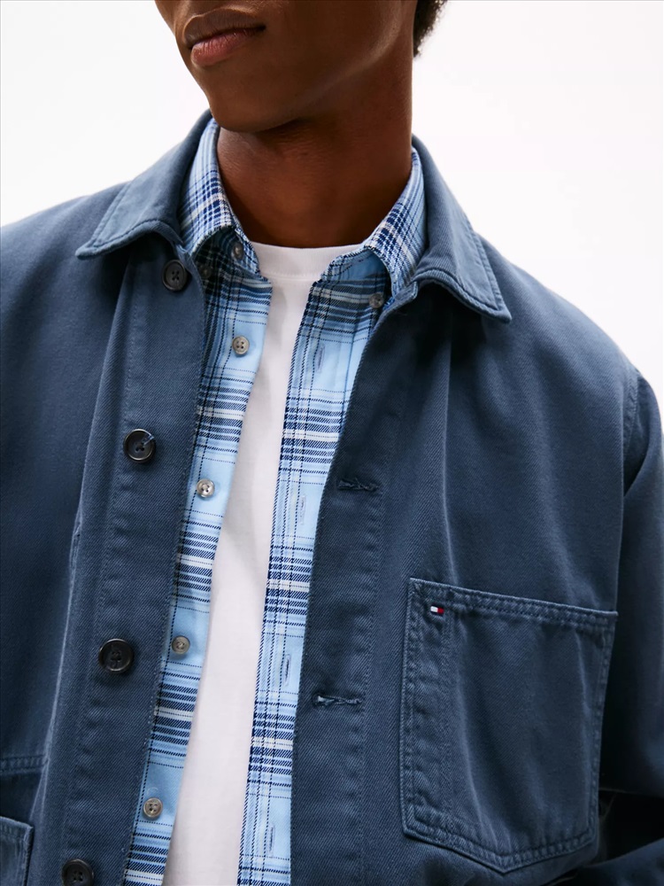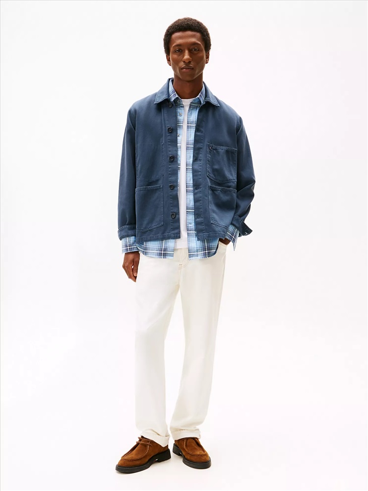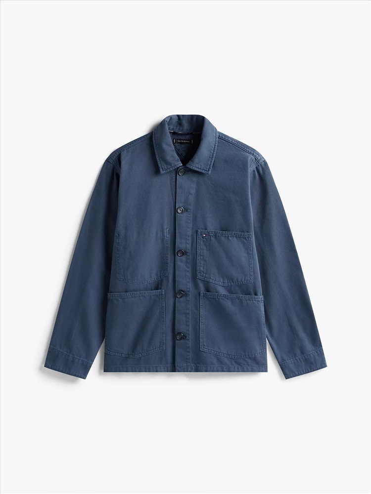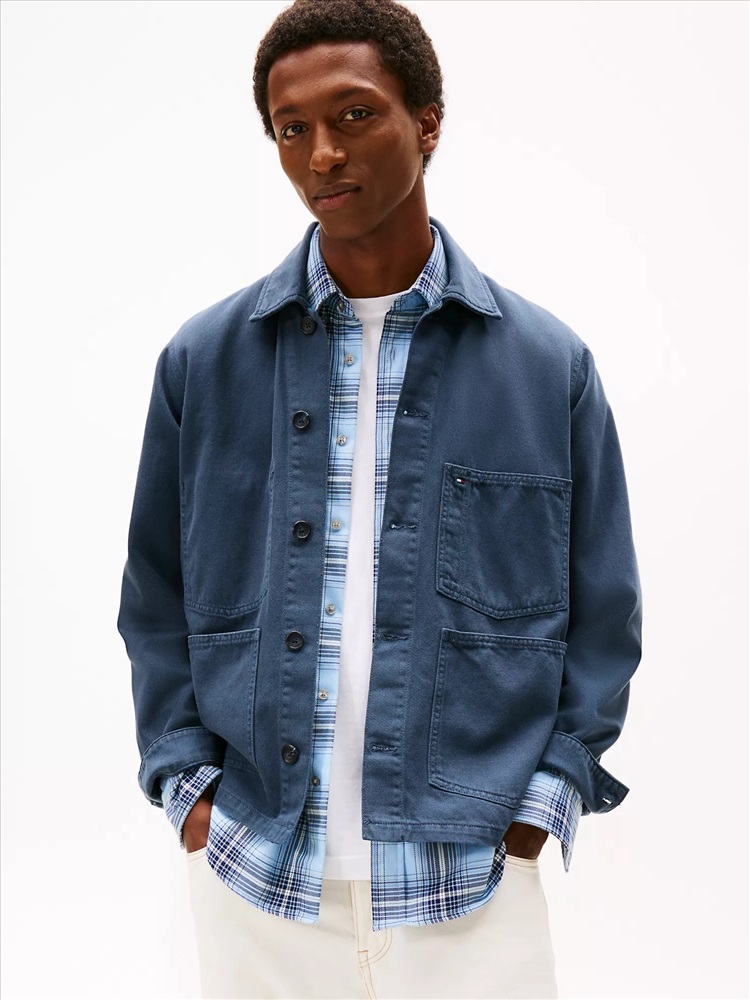 Tommy Hilfiger men's jacket. Inspired by the workwear staple, our rigid denim chore jacket has it all — roomy patch pockets, easy-roll sleeves and traditional buttons. Even better, this versatile outerwear layer is garment-dyed for softness and a lived-in look.
